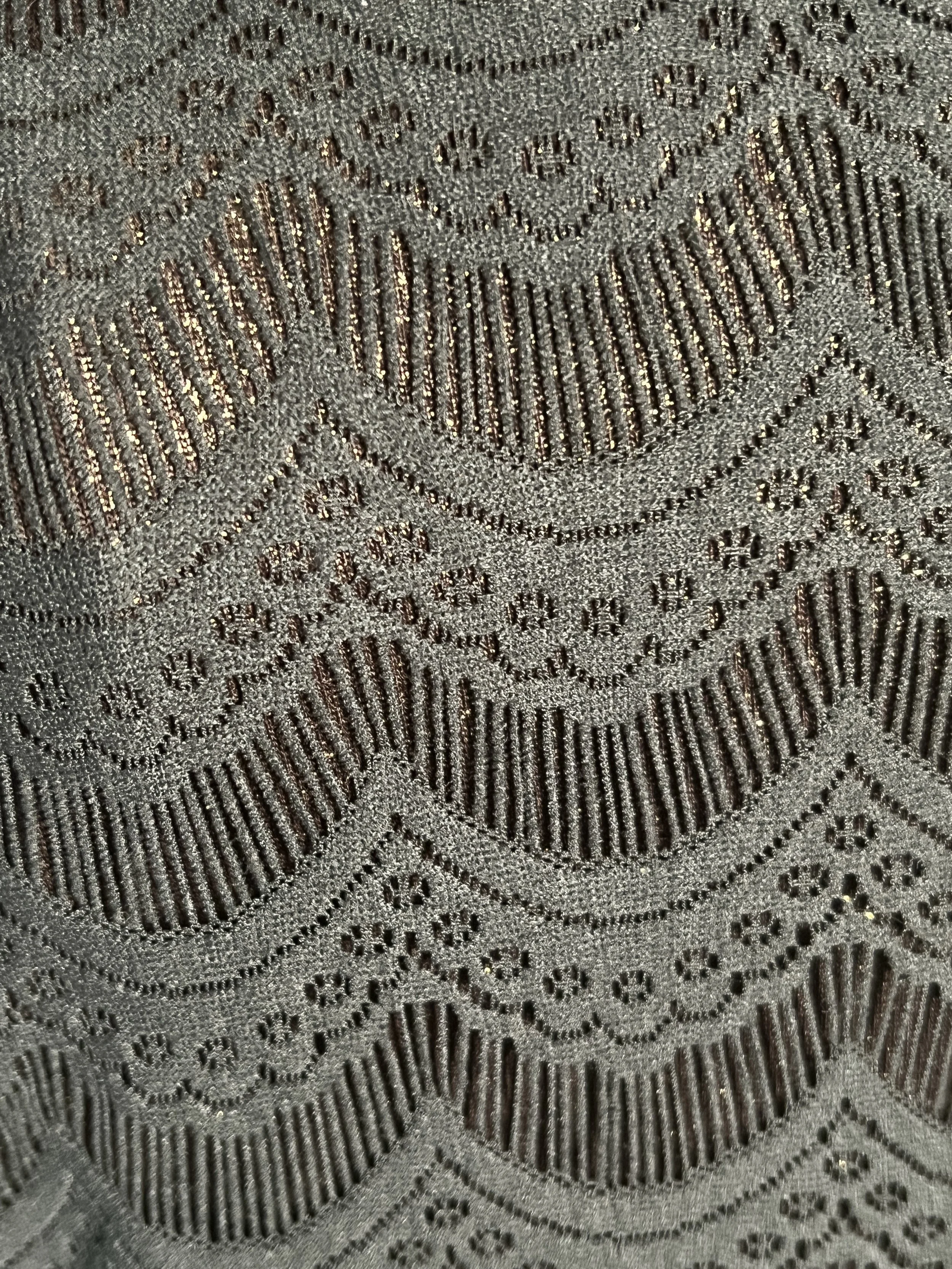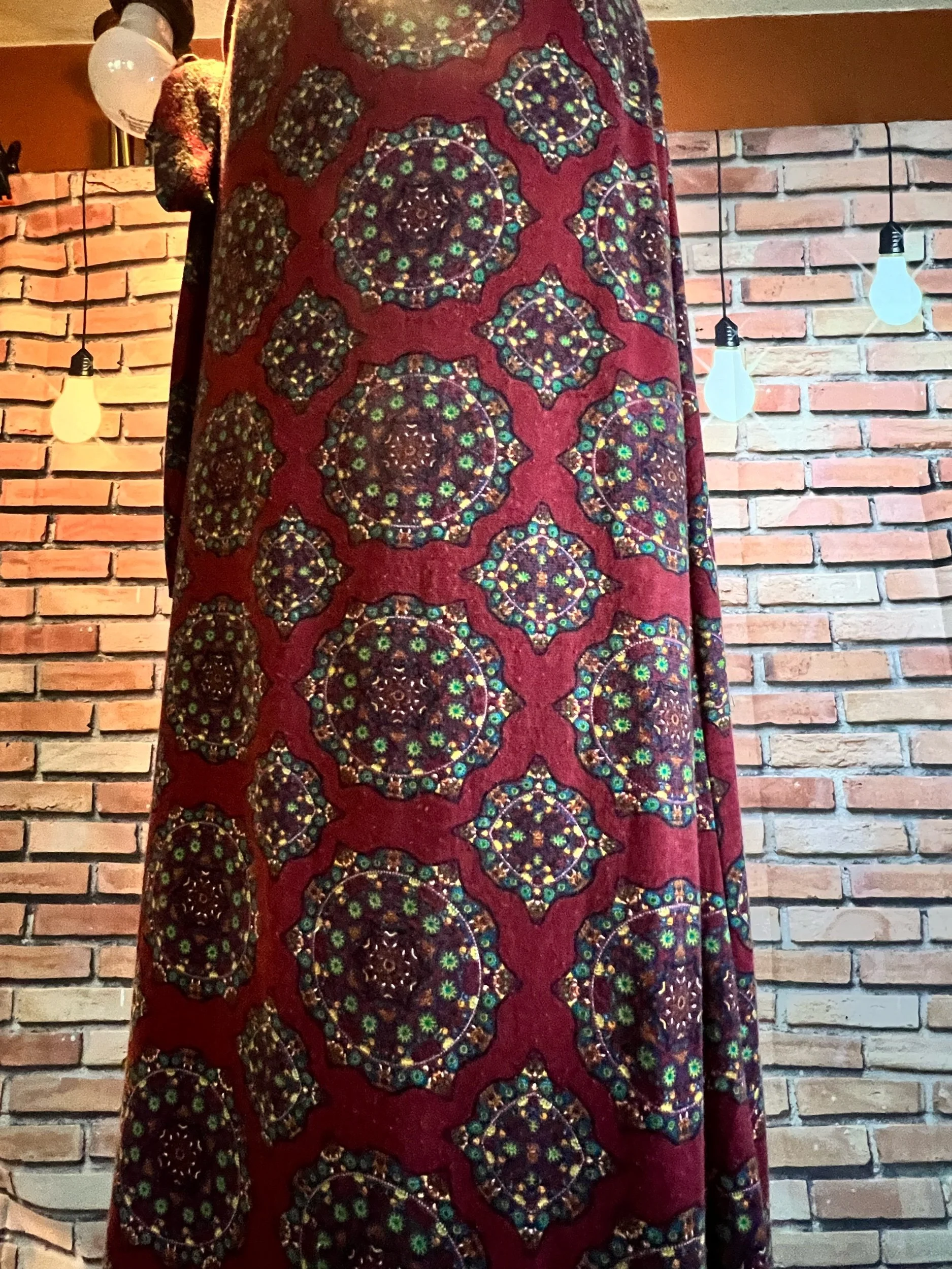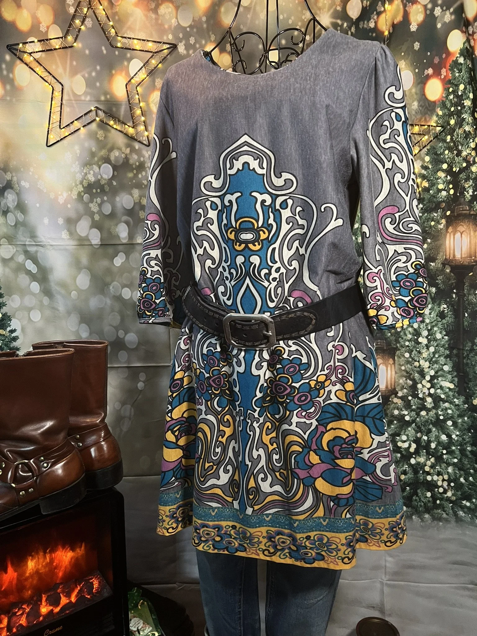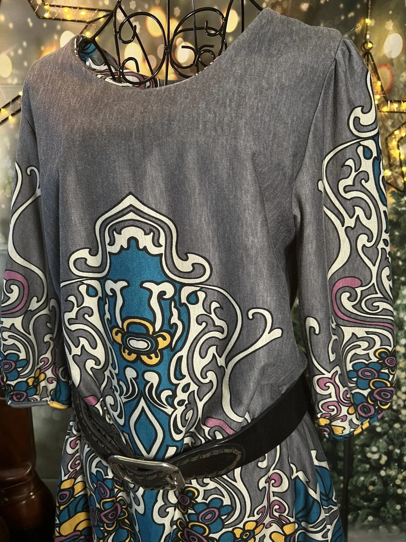 Style Notes: Wild intricate print, luxe feel, takes belts extremely well