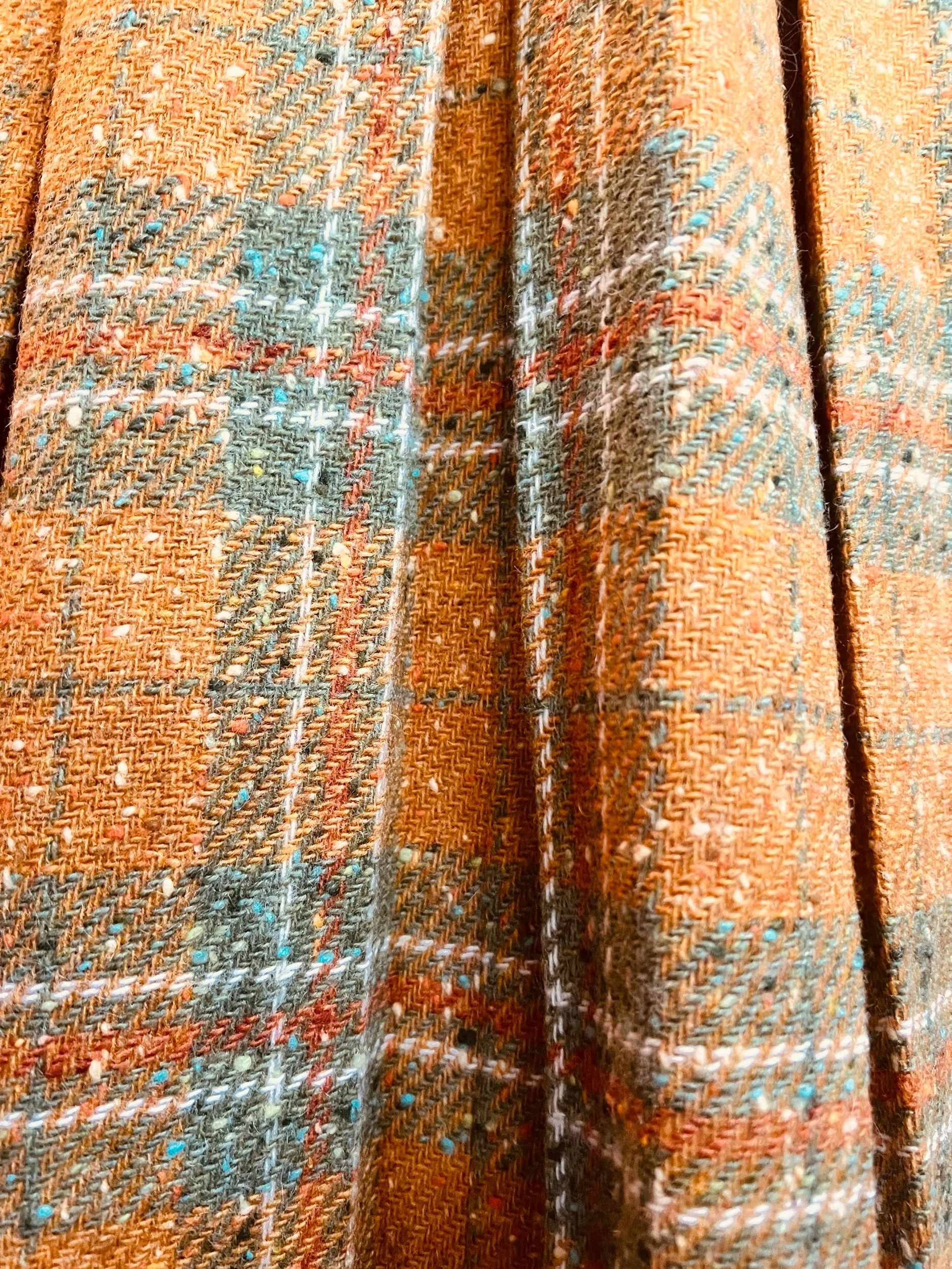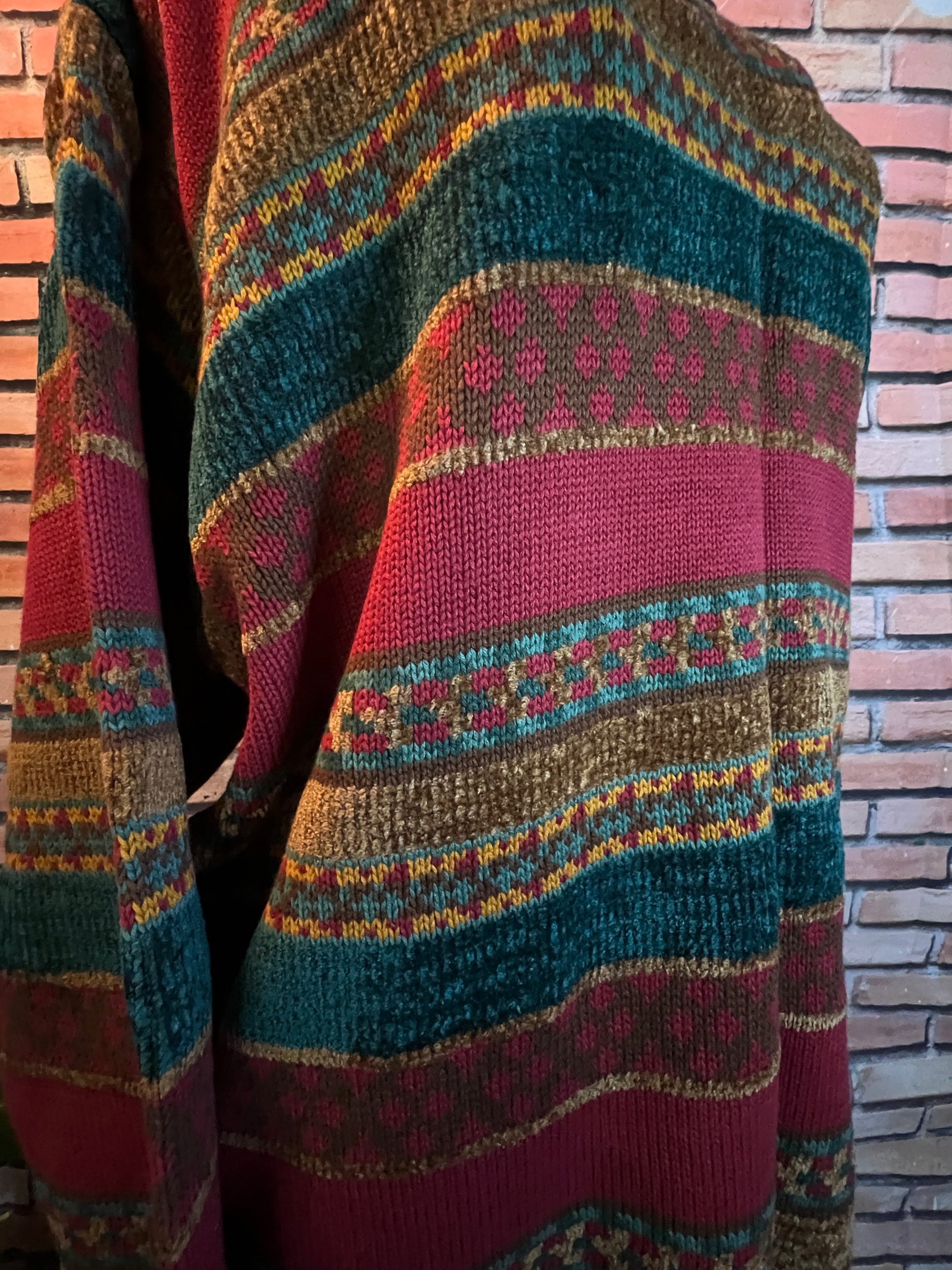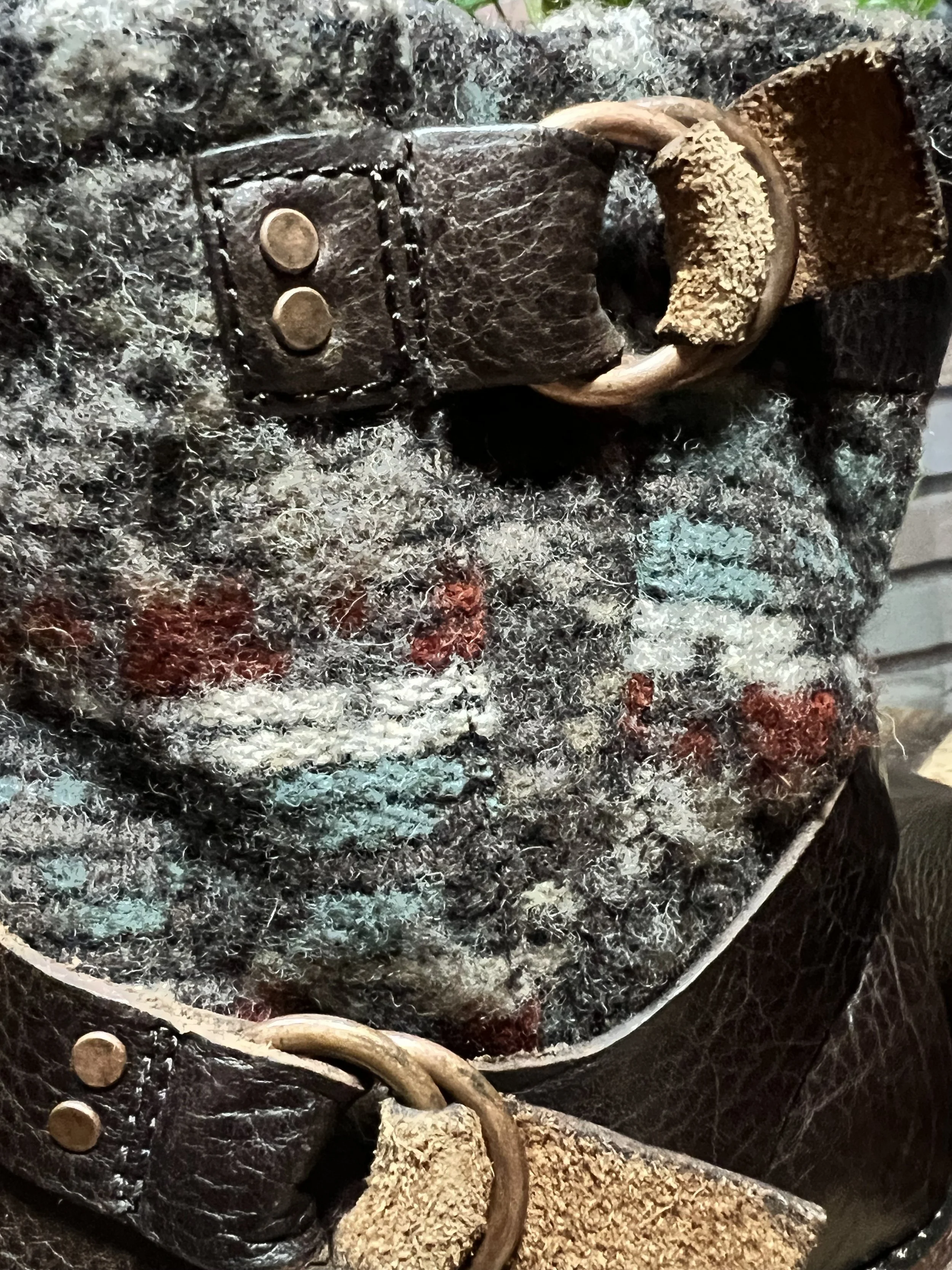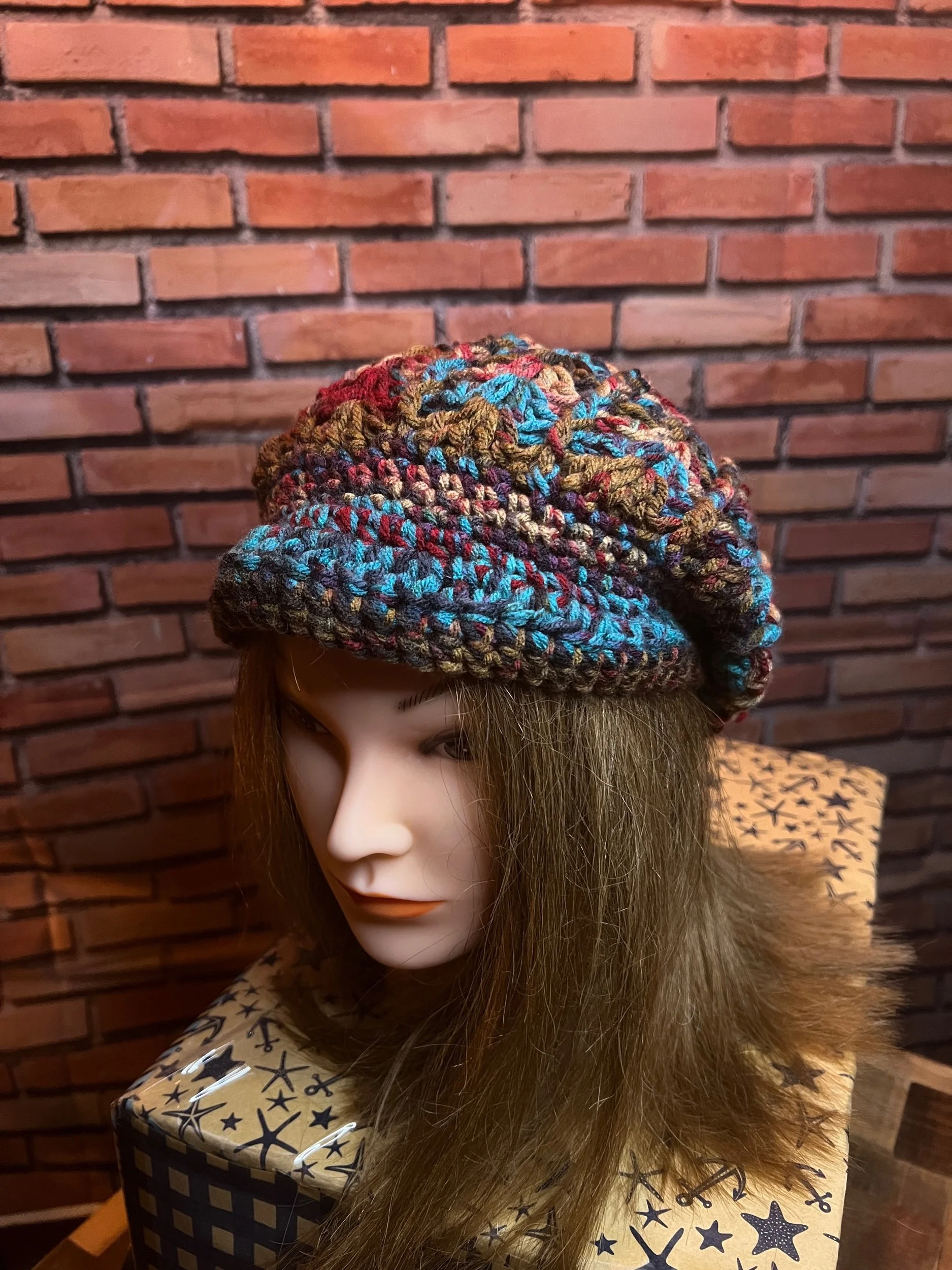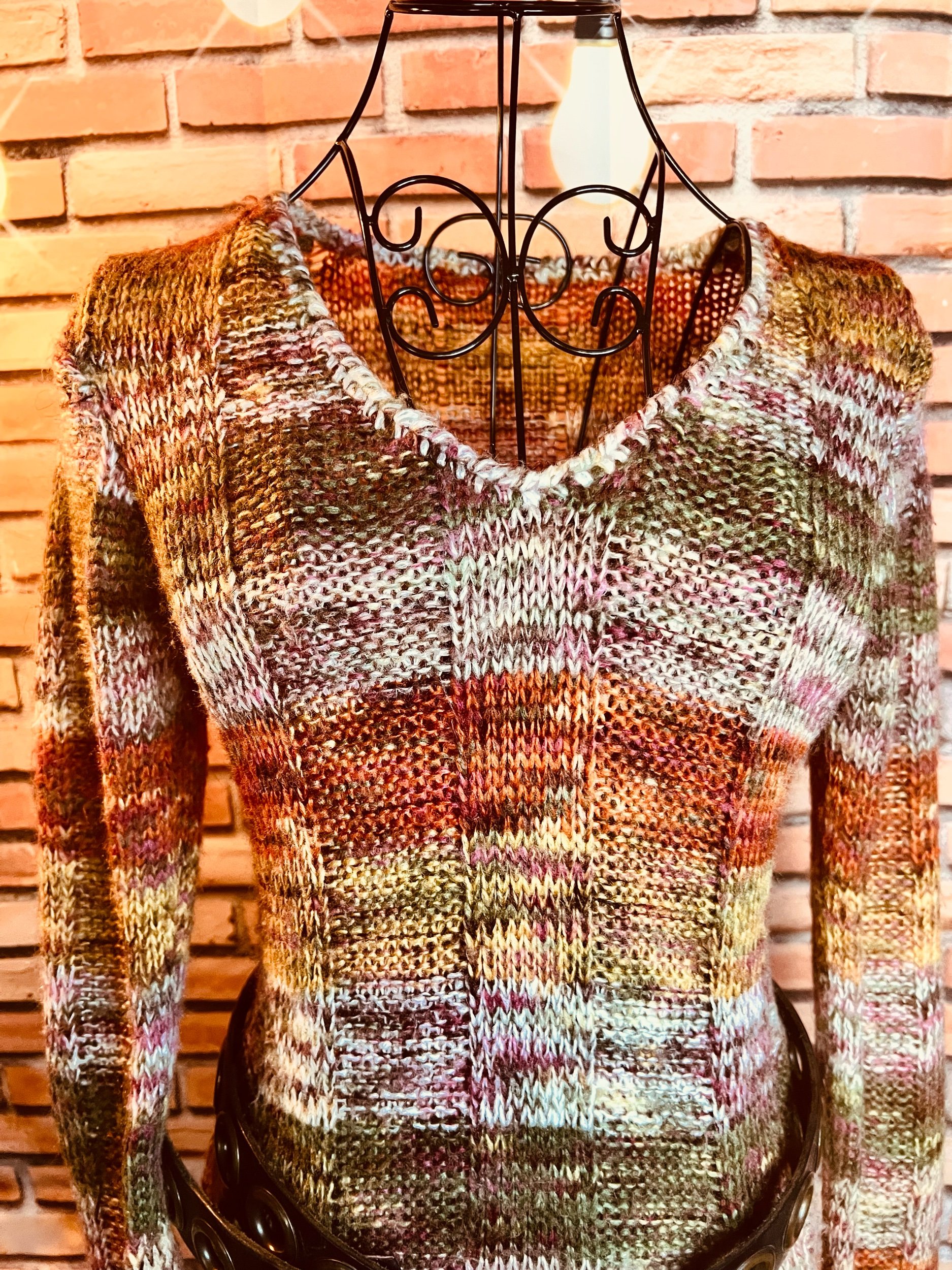 Colorway: Earth-tone multicolor (camel, espresso, forest, aubergine, teal, rust)