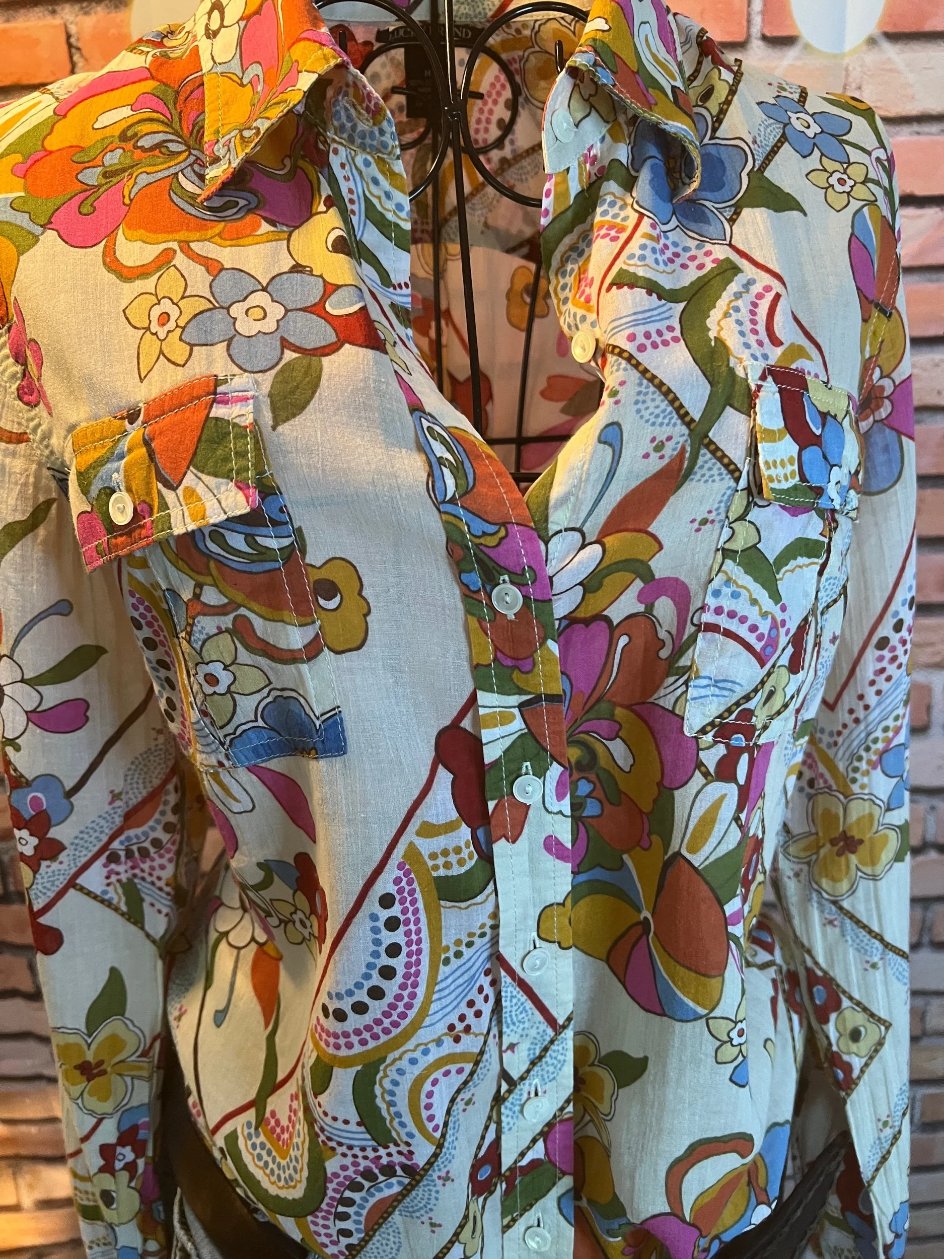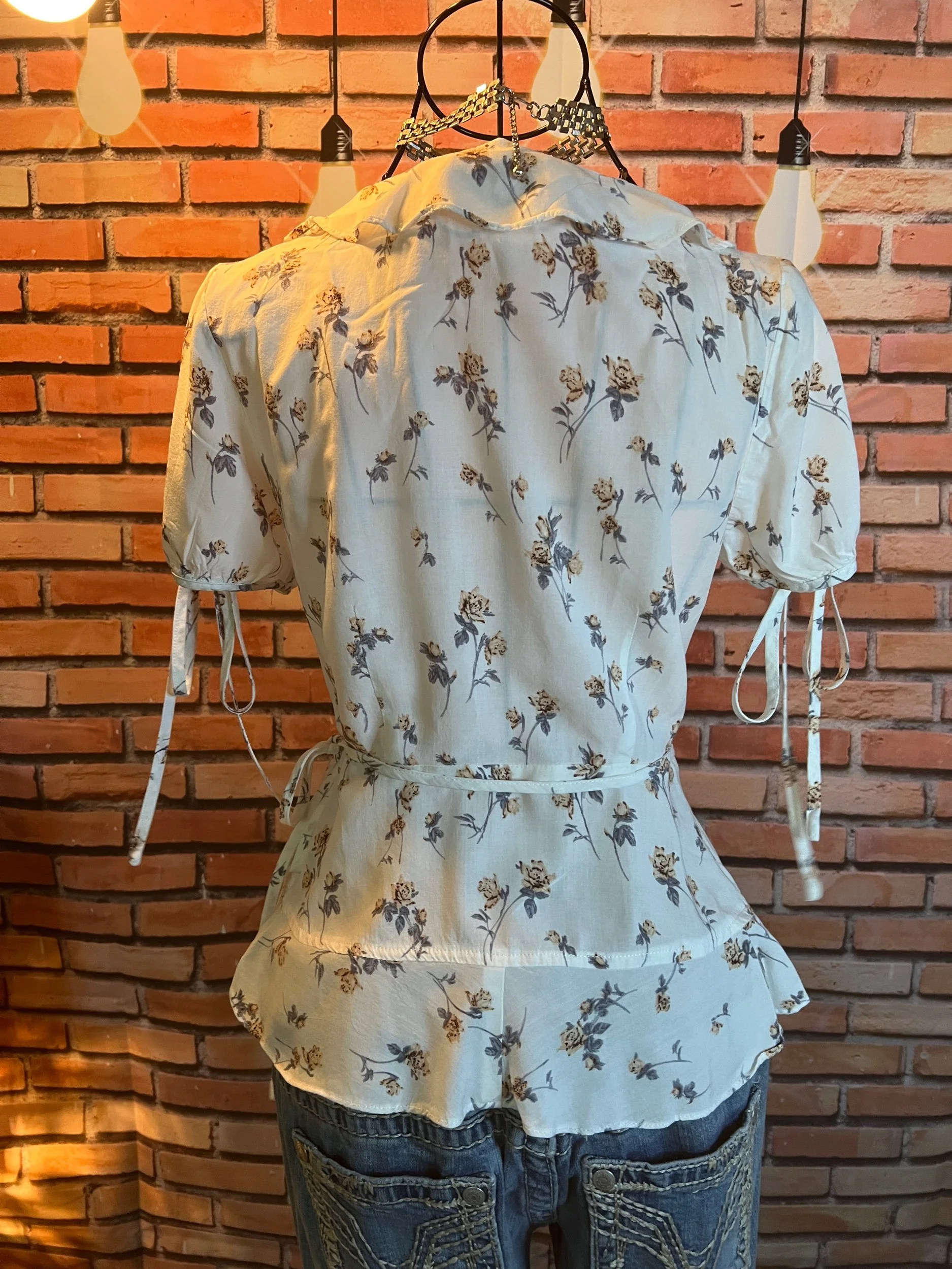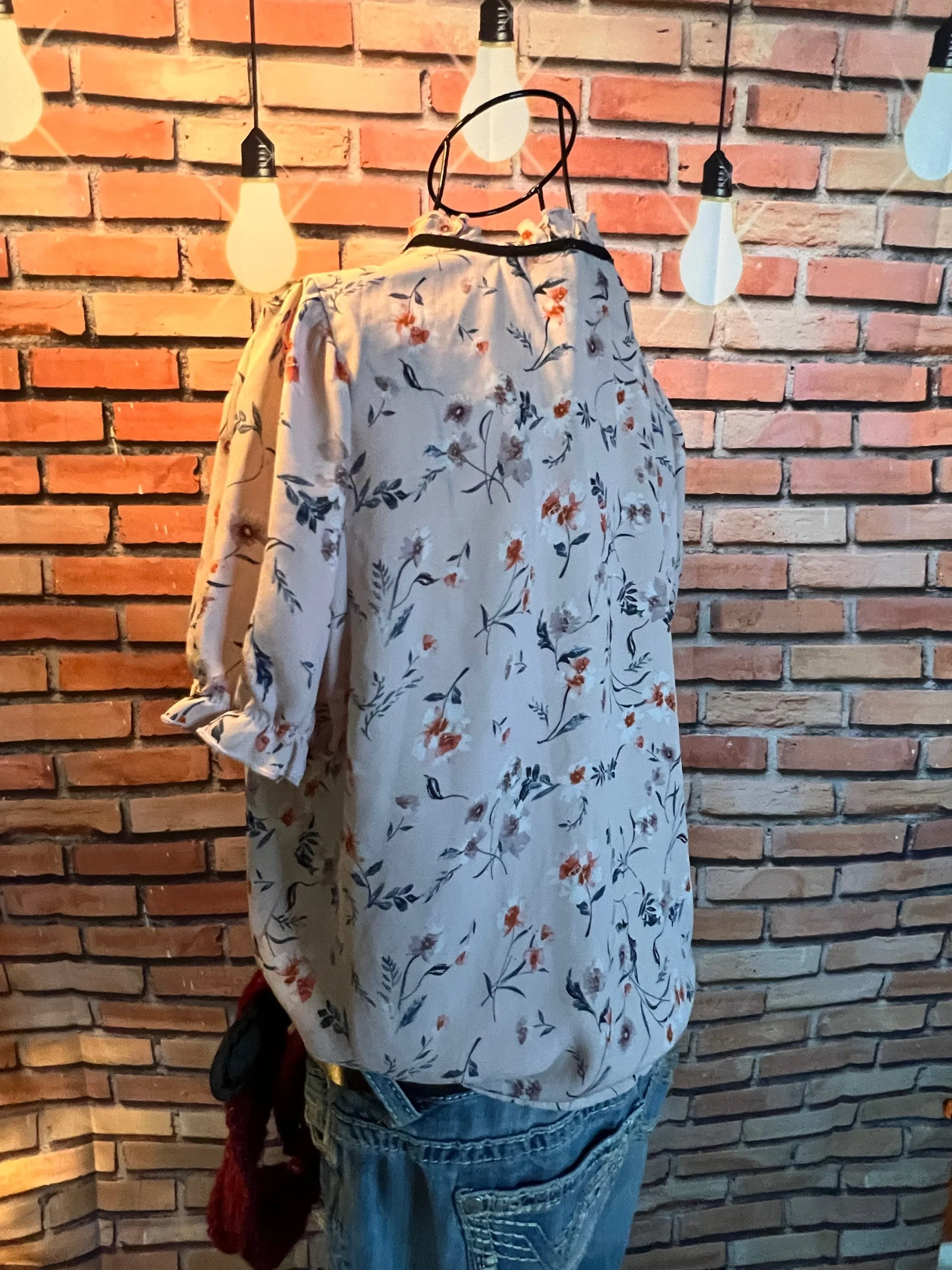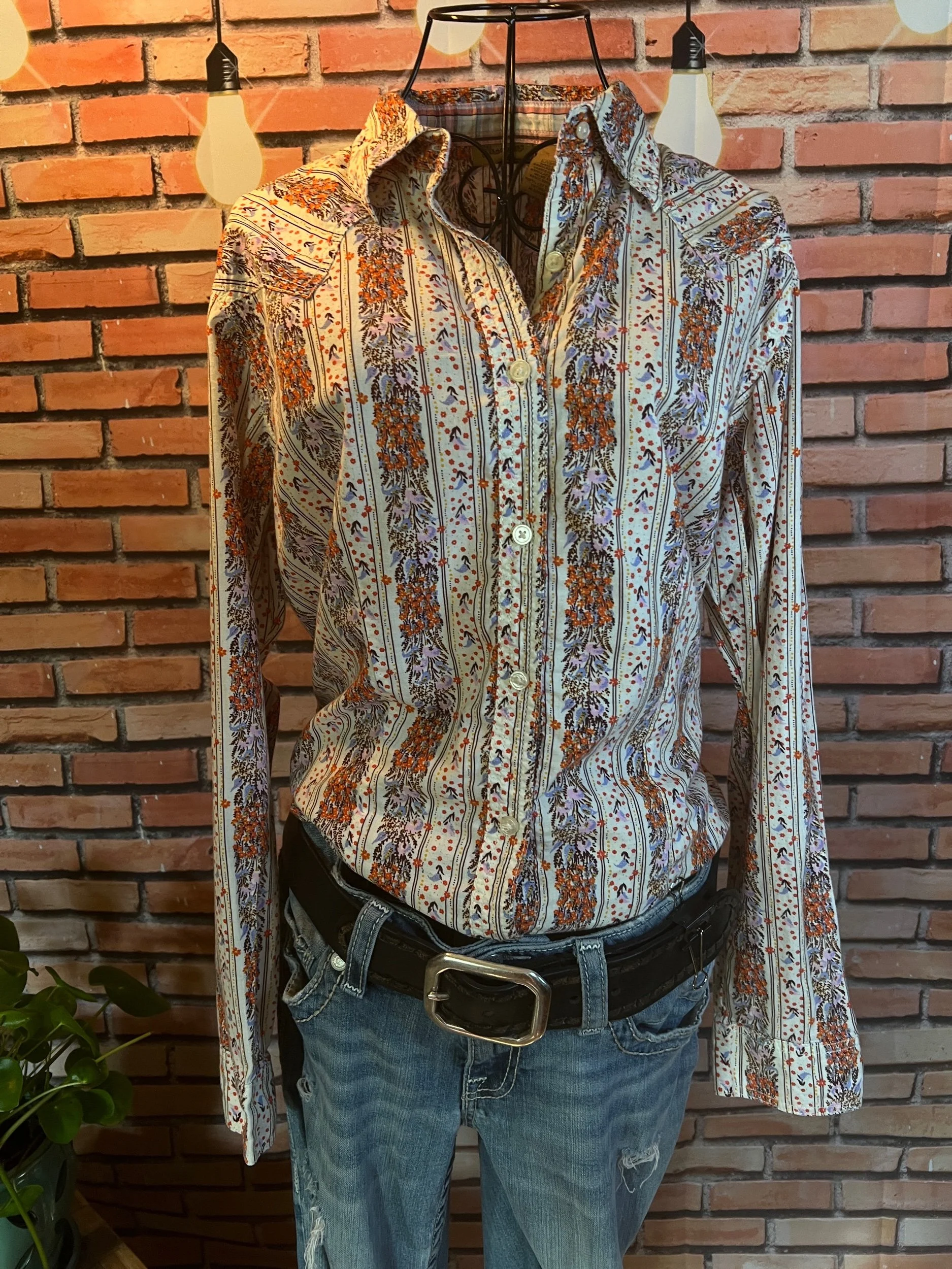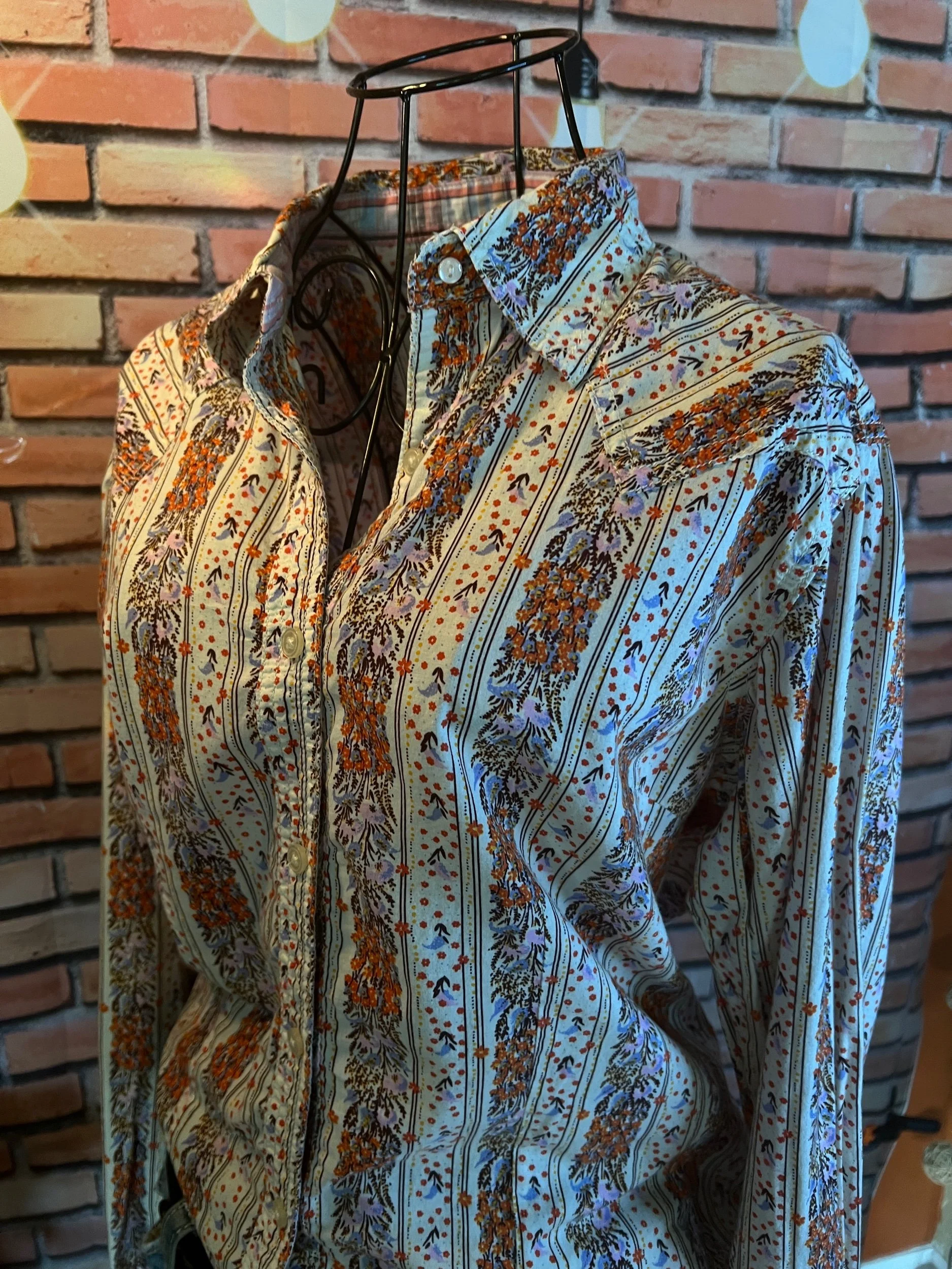 Don’t let the polyester fool you—this one’s a soft-daydream kind of top that happens to survive laundry day like a champ. Romantic floral print, breezy fit, and that quiet confidence that says, “Yeah, I thrift better than you.”