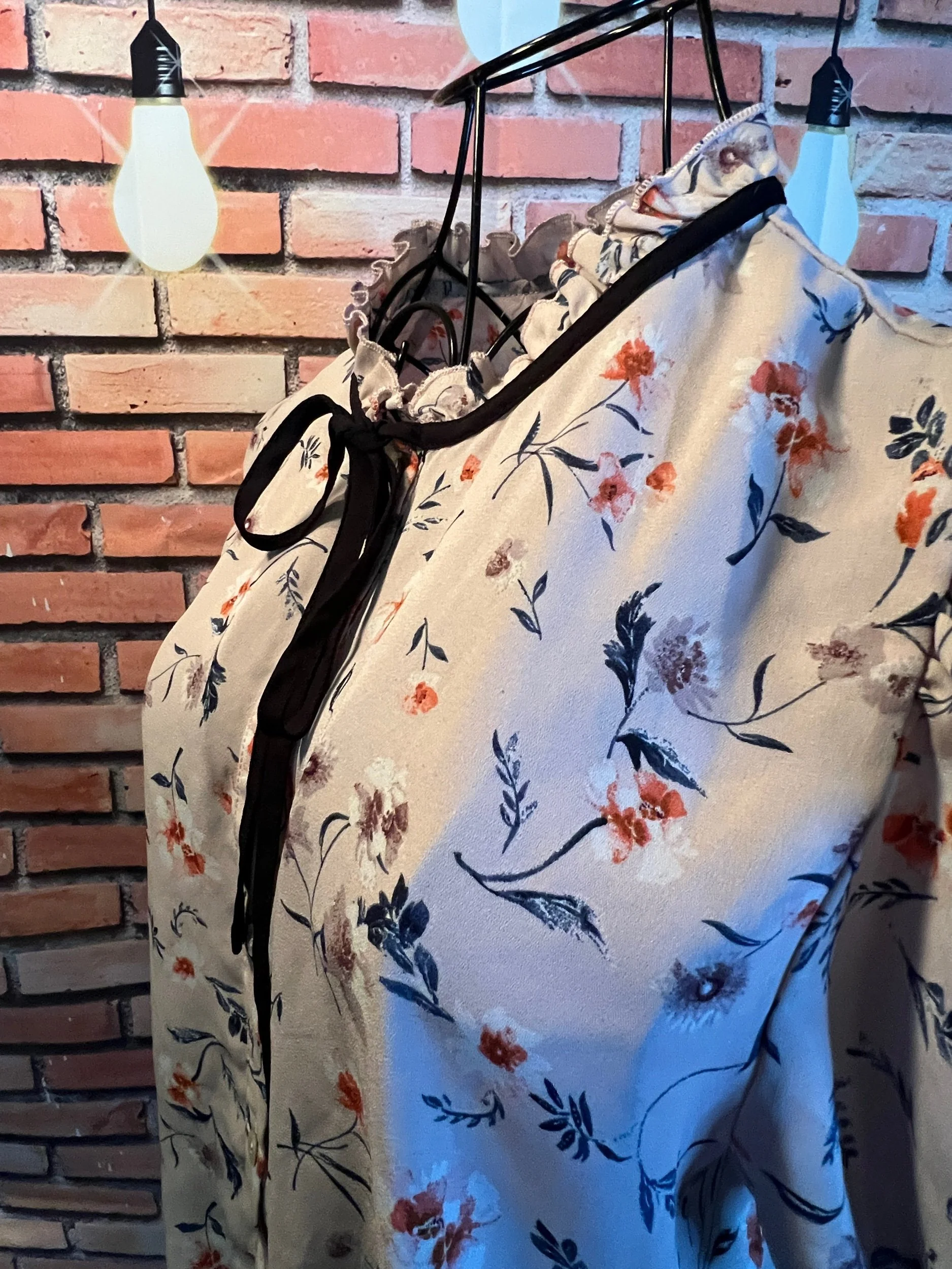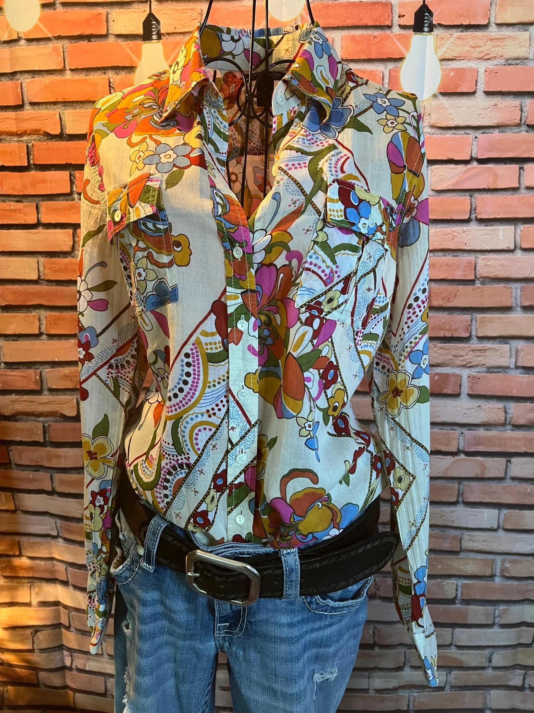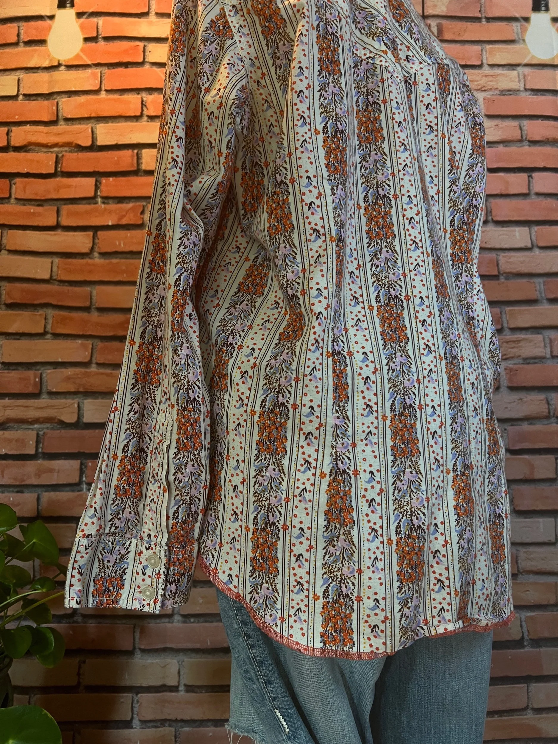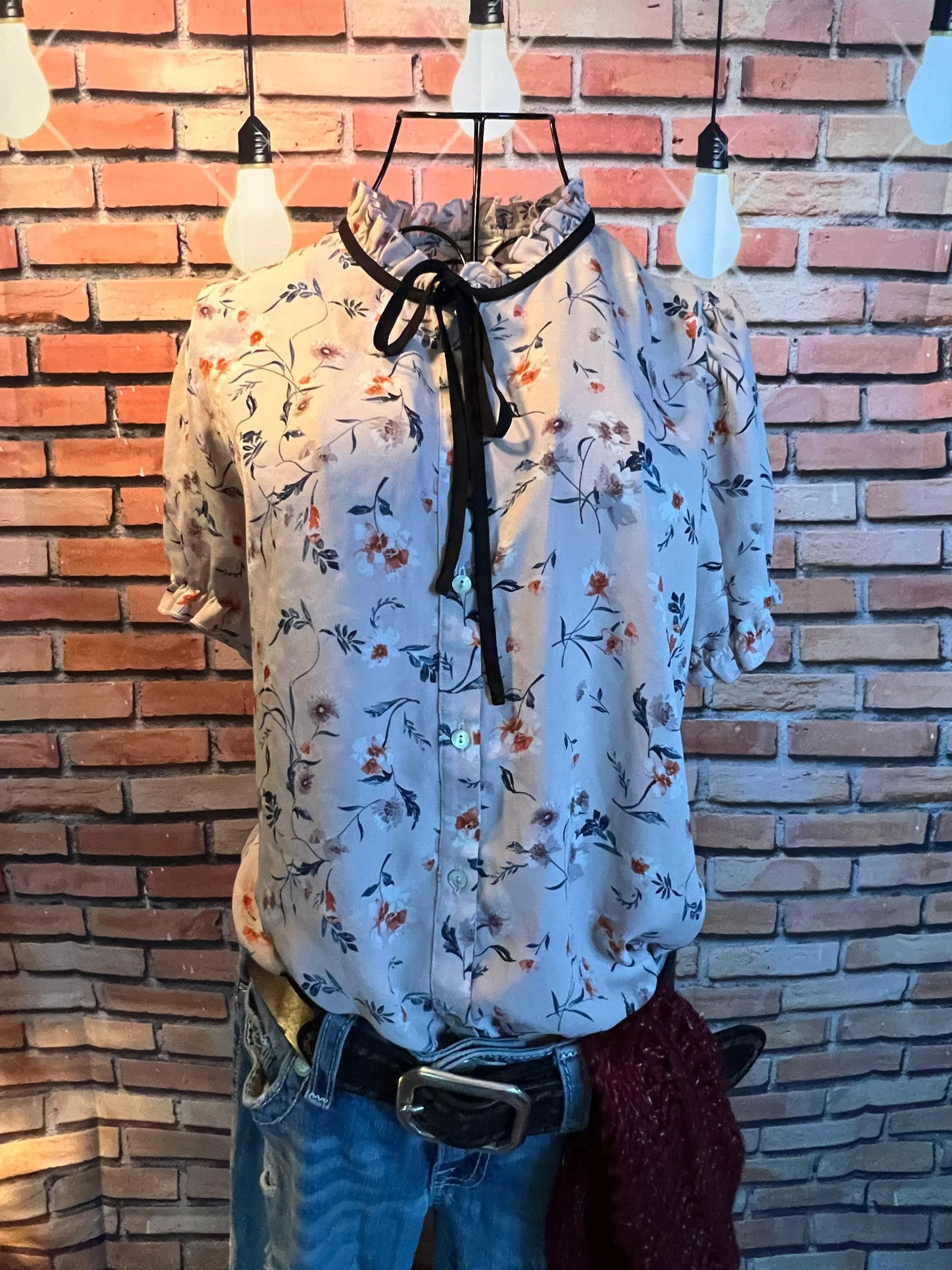 Don’t let the polyester fool you—this one’s a soft-daydream kind of top that happens to survive laundry day like a champ. Romantic floral print, breezy fit, and that quiet confidence that says, “Yeah, I thrift better than you.”