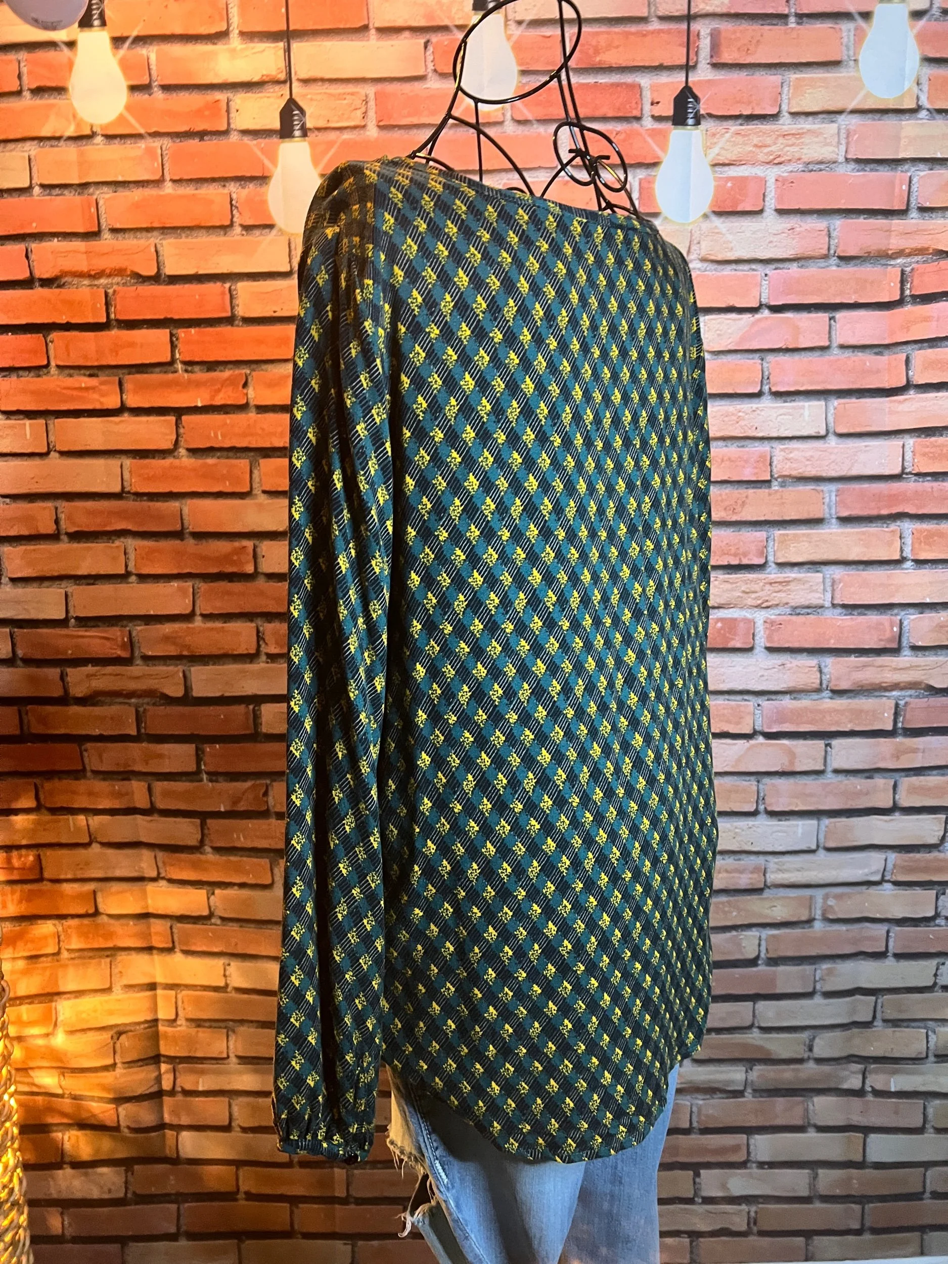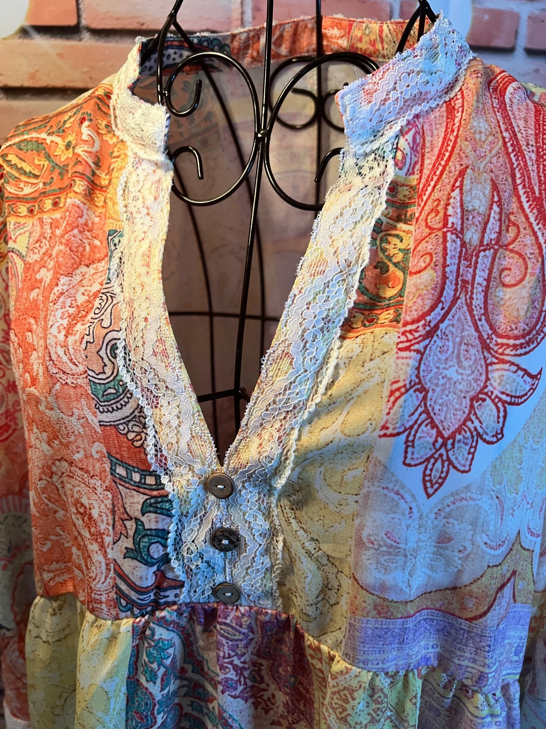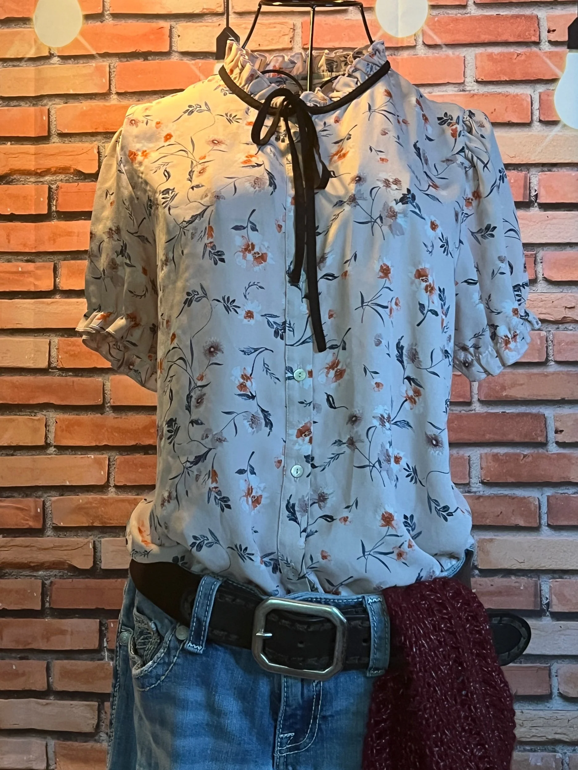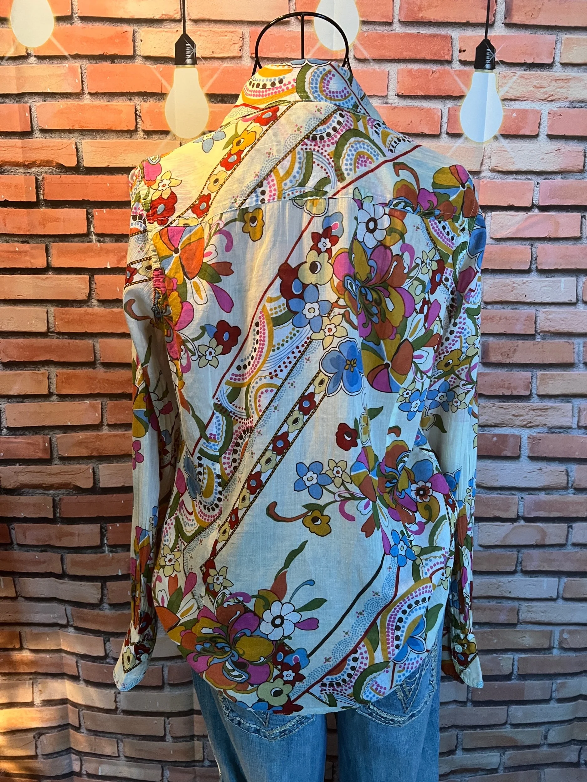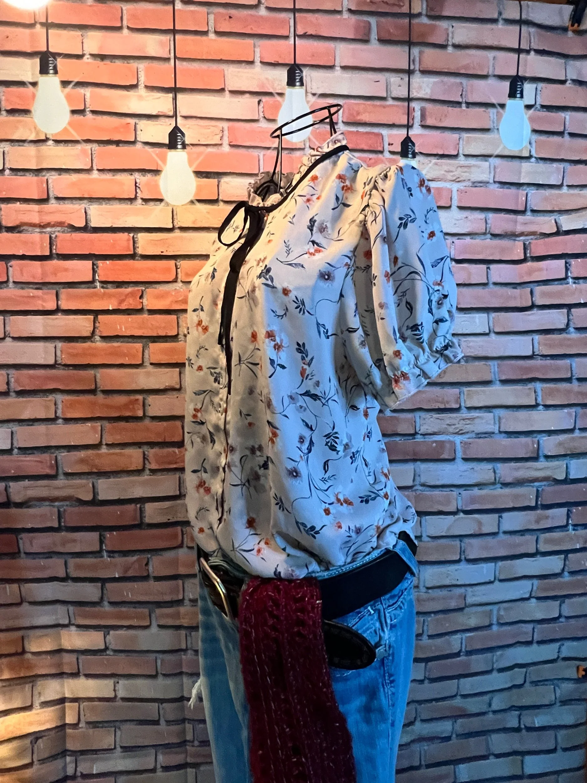 Don’t let the polyester fool you—this one’s a soft-daydream kind of top that happens to survive laundry day like a champ. Romantic floral print, breezy fit, and that quiet confidence that says, “Yeah, I thrift better than you.”