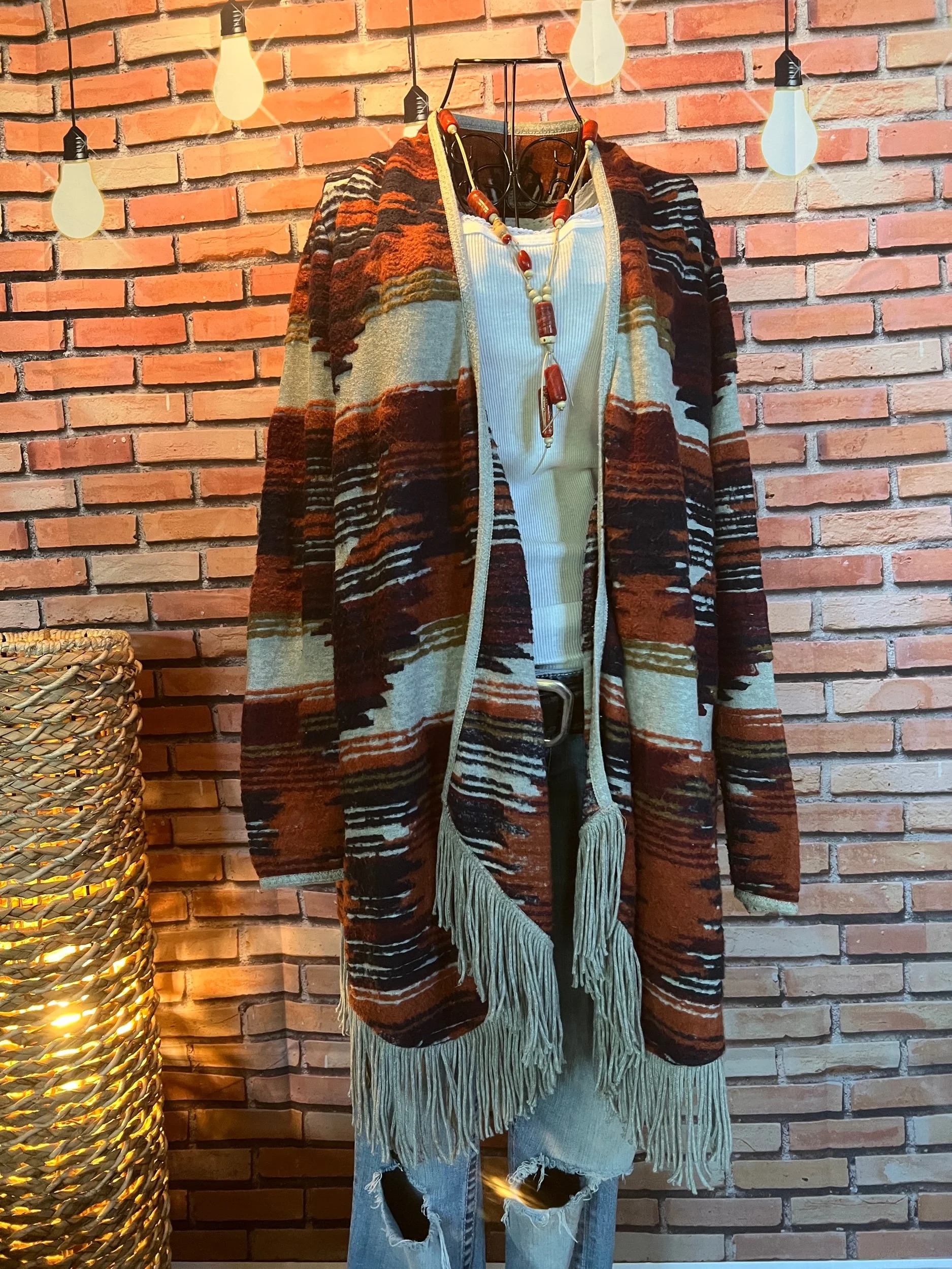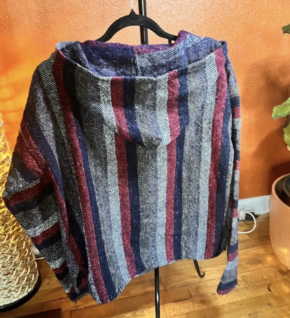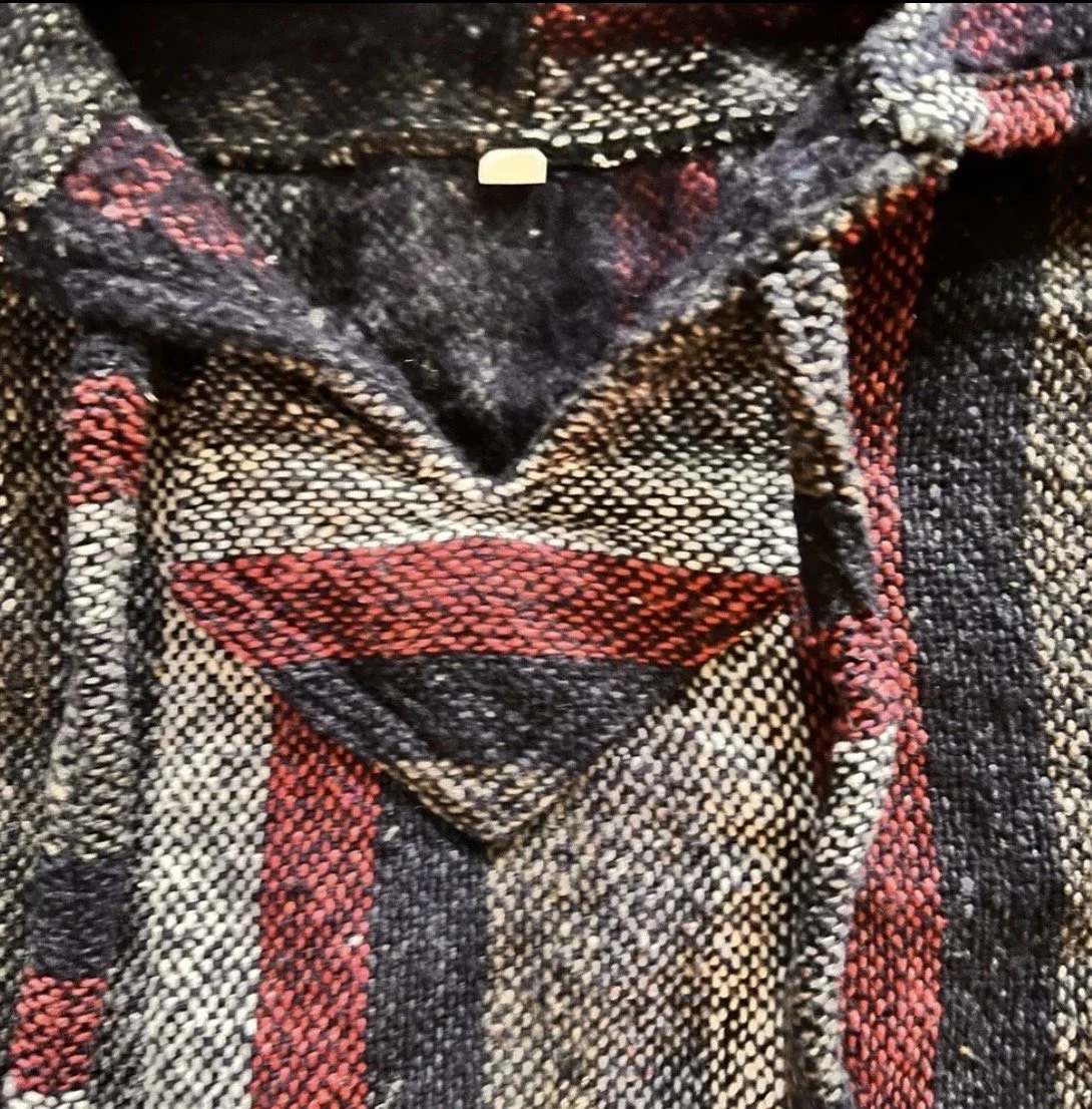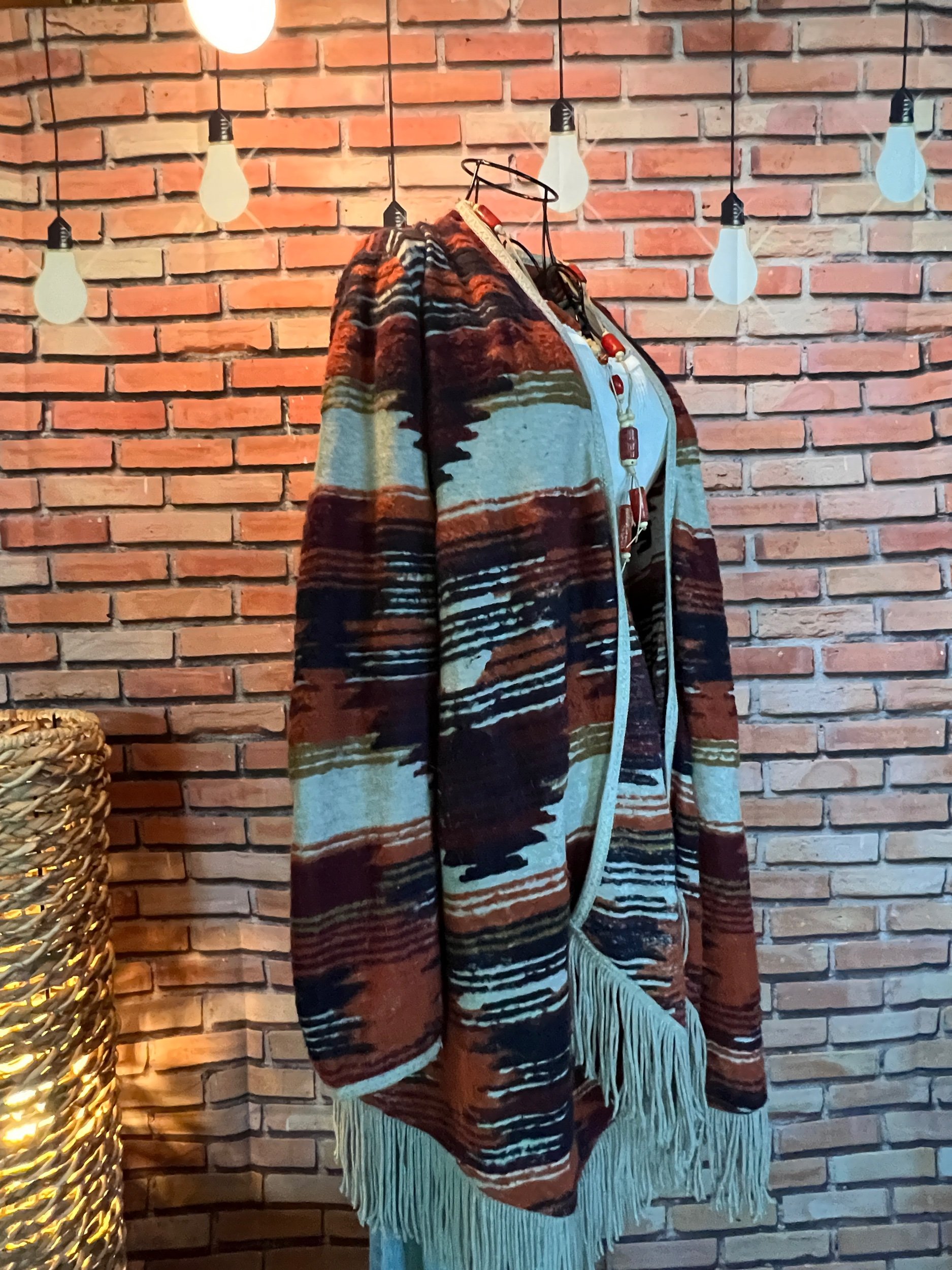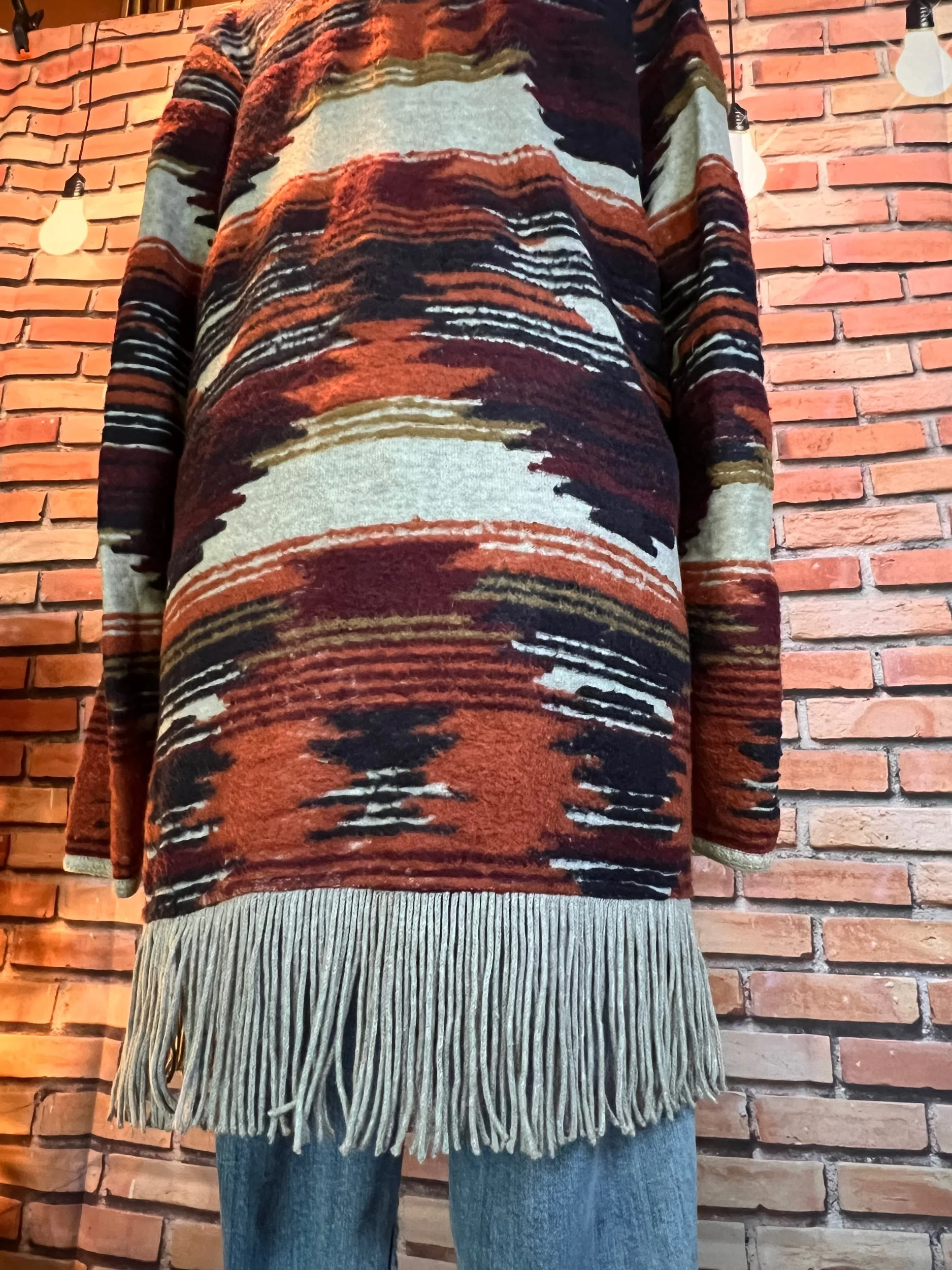 Part boho, part desert outlaw. This Lucky Brand wrap throws down a storm of rust, indigo, and cream with just enough fringe to make a statement when you walk away. Textured knit with an open front, asymmetrical hem, and that signature draped silhouette that looks effortless but hits hard. Excellent condition with no visible wear — just attitude.