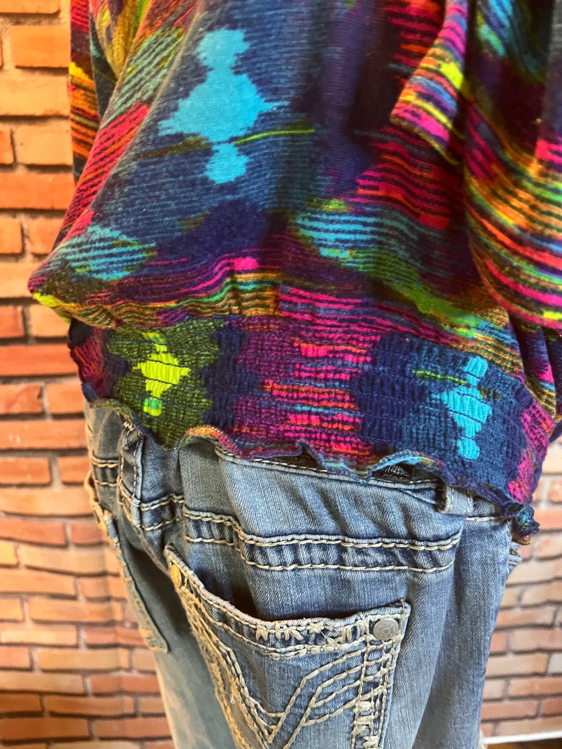 Welcome to Poly Schlaraffenland — where the fabric glows, the print screams, and the vibe says “I might be trouble no matter where I go.” This unbranded beauty serves up bold jewel tones that refuses to go unnoticed. The cut’s easy and flattering, the material’s pure 2000s luxury delusion, and the condition’s spotless. NWOT and dangerously awesome.