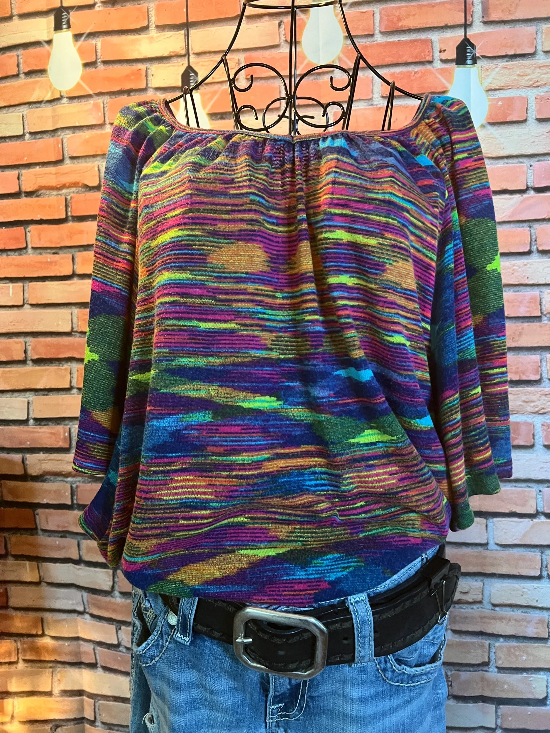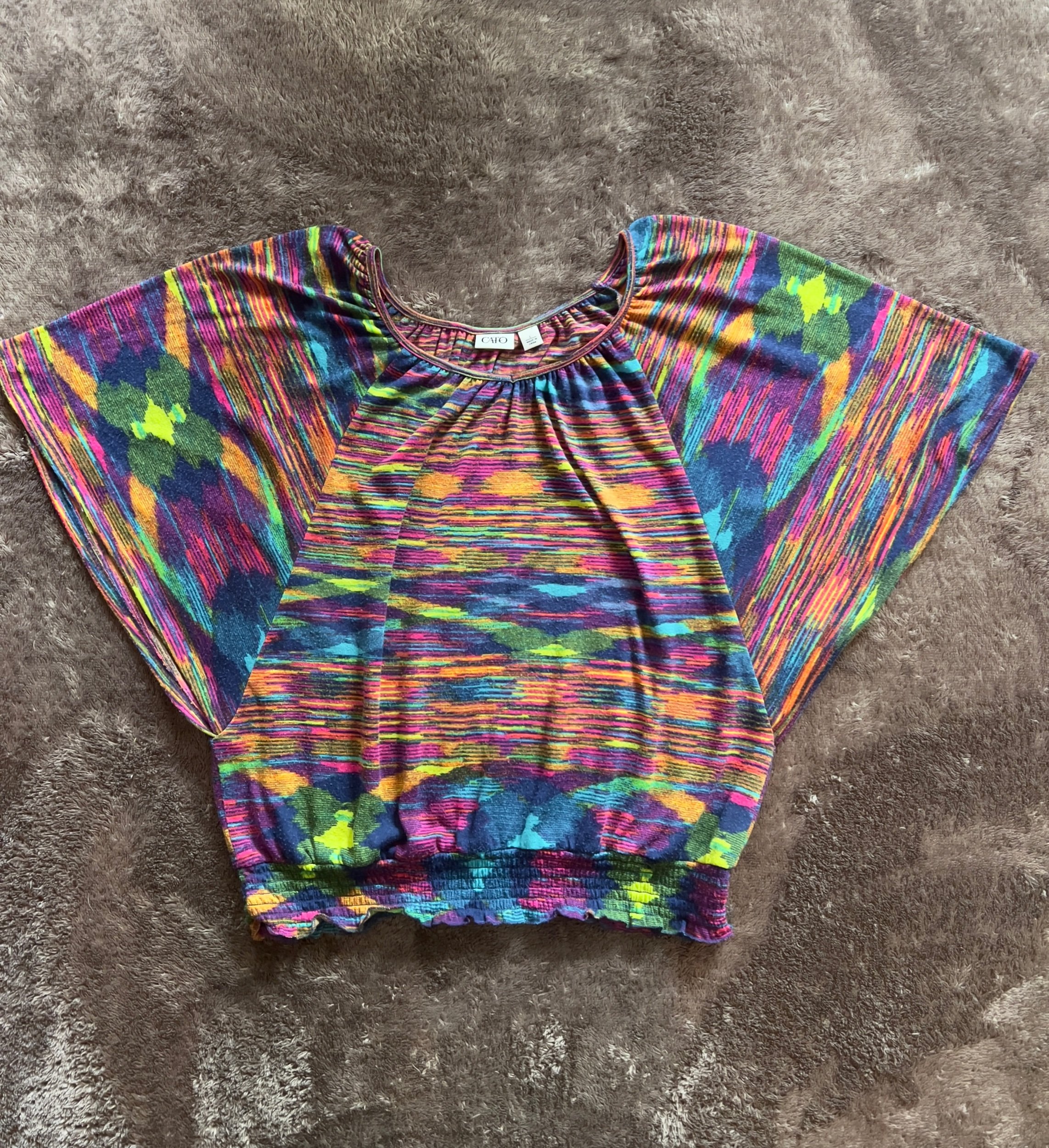 Soft enough to nap in, loud enough to turn heads. This Cato dolman top is a full-on color riot — vivid streaks of magenta, neon green, orange, and cobalt splashed across a silky-soft knit. Relaxed batwing sleeves, elastic hem for shape, and that easy drape that flatters without trying. Very good condition, feels barely worn.