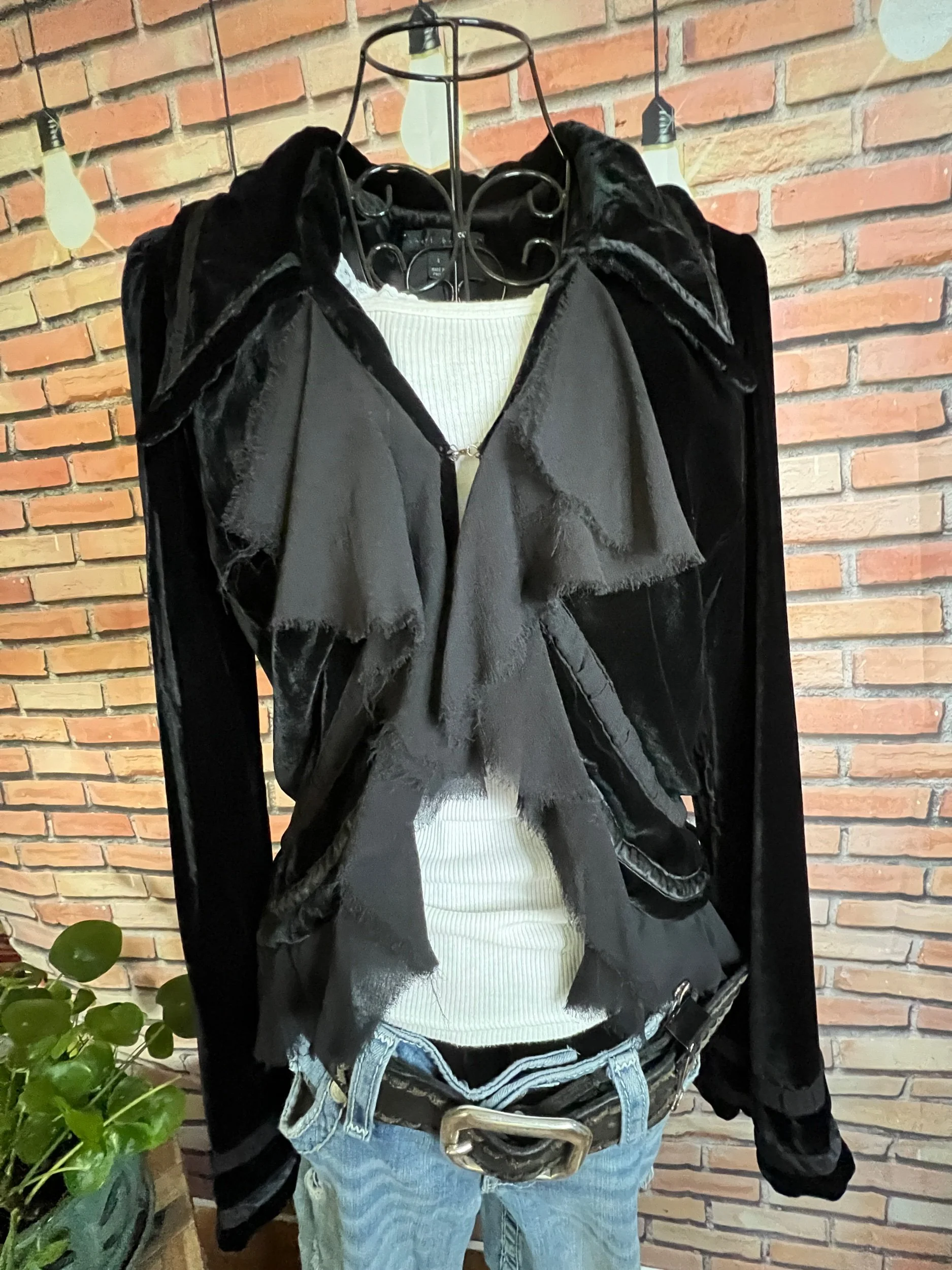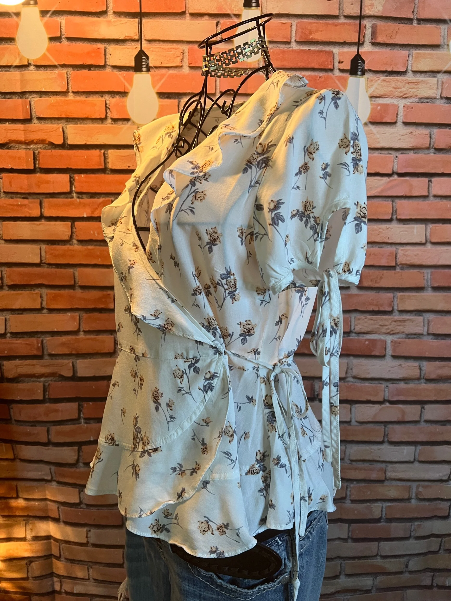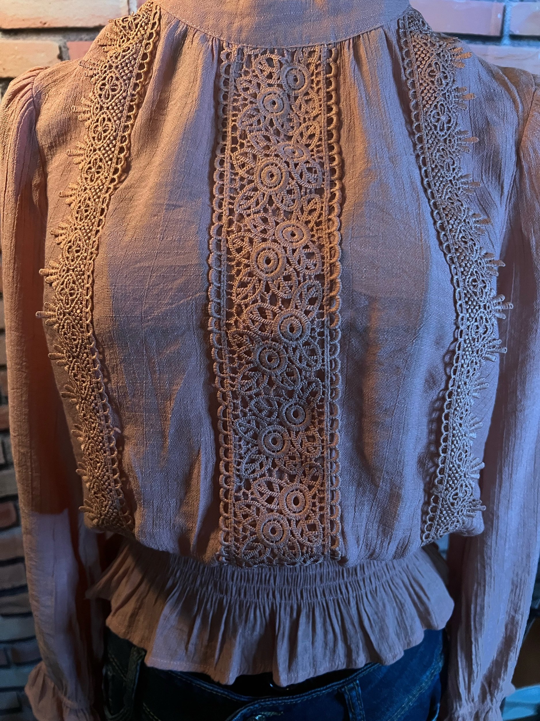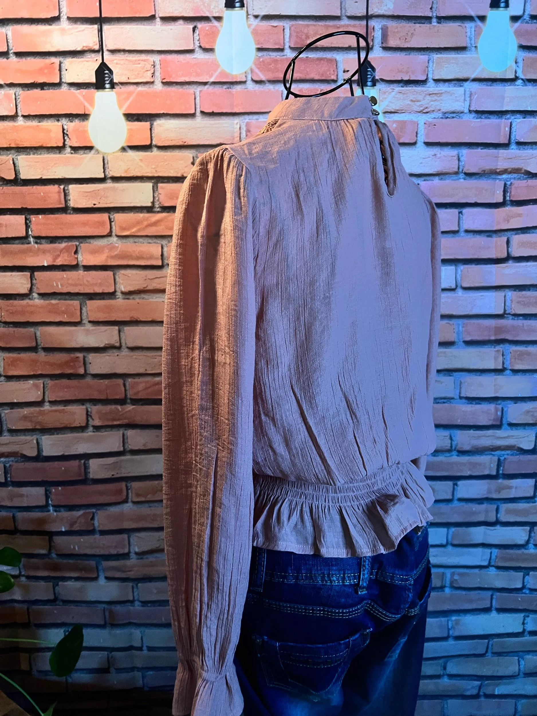 Soft, vintage-inspired ruffle blouse with a lightweight drape and that “I behave… until I accessorize” energy. The kind of top that goes from garden-party polite to dive-bar loud depending on what you pair it with.