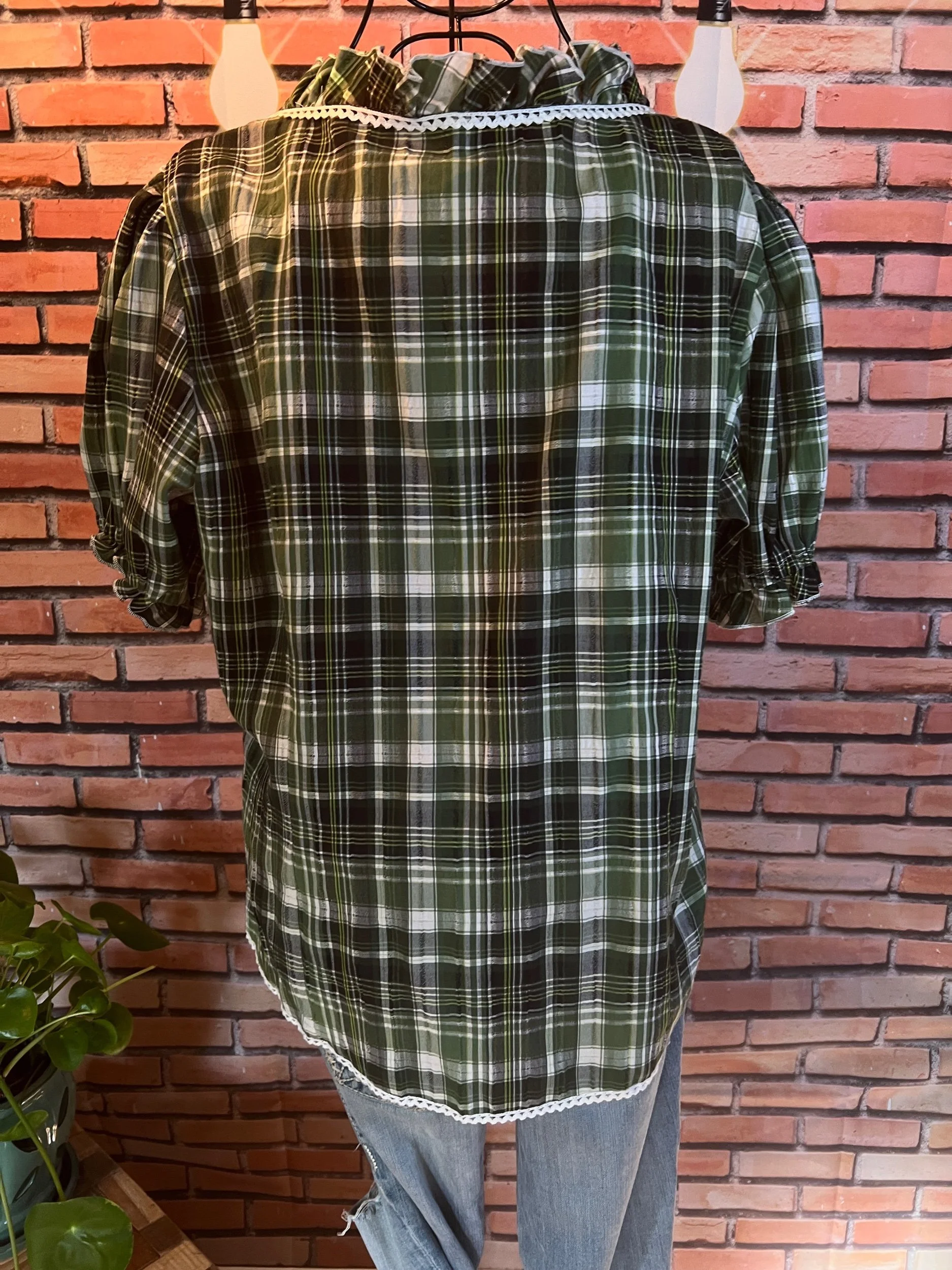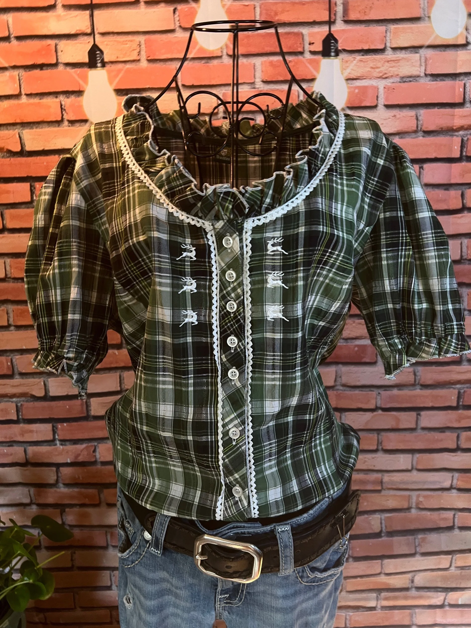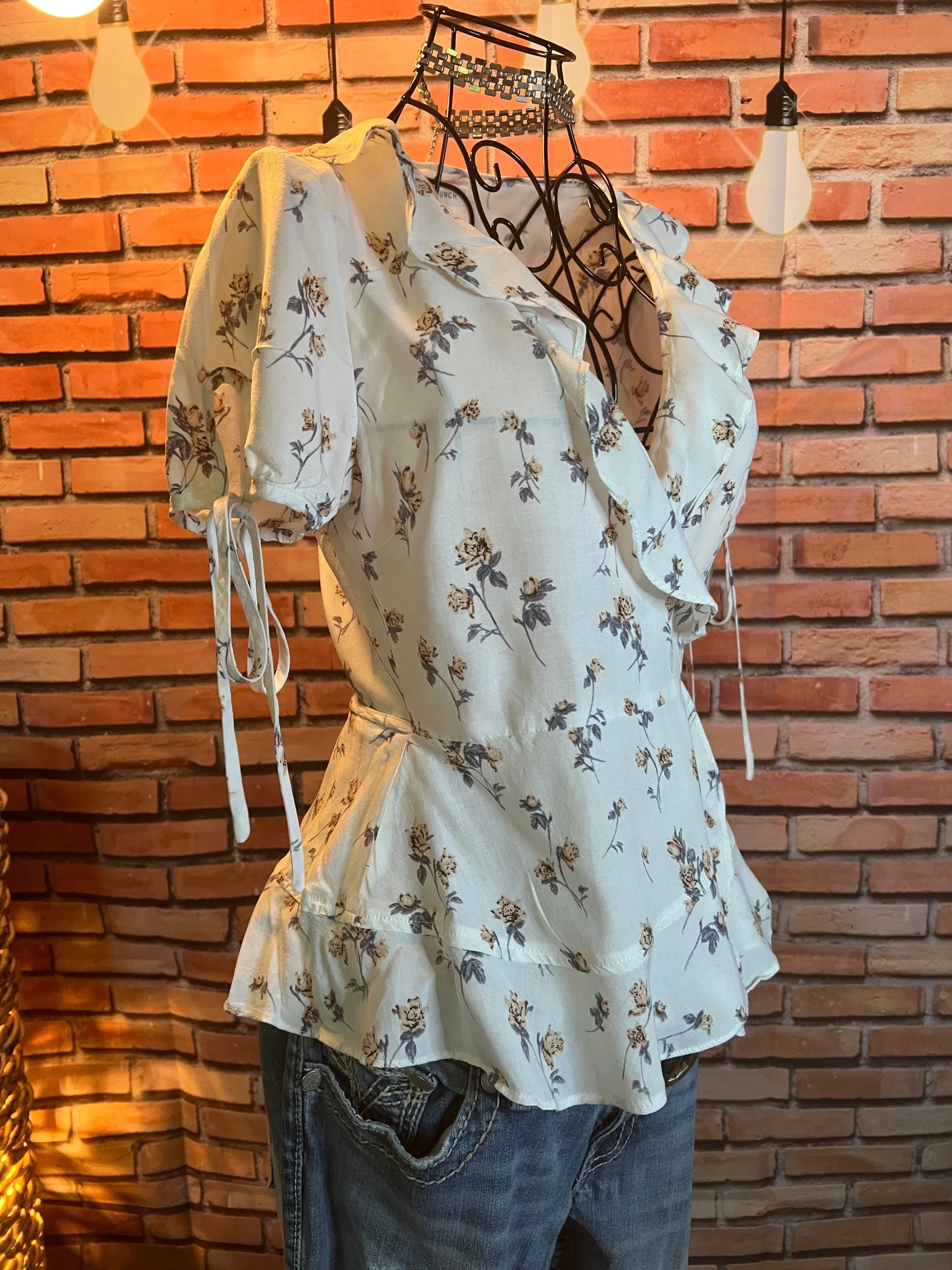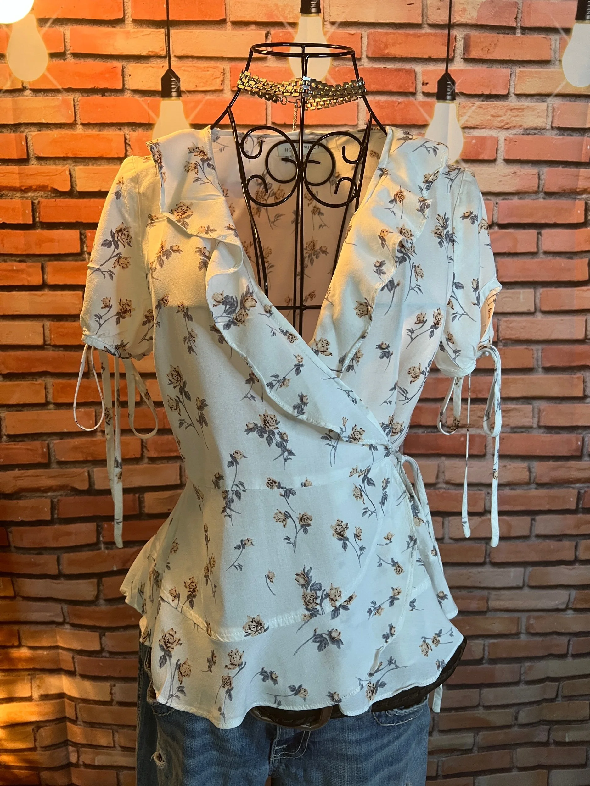 Soft, vintage-inspired ruffle blouse with a lightweight drape and that “I behave… until I accessorize” energy. The kind of top that goes from garden-party polite to dive-bar loud depending on what you pair it with.