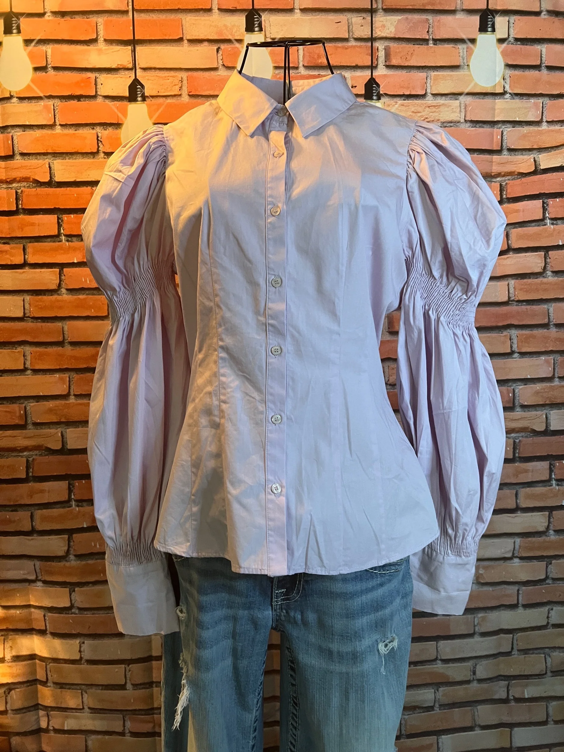 Somewhere between a Victorian heroine and a pirate with excellent taste. This Zara blouse brings soft lilac poplin, a ruffled front placket, and cuffed sleeves that make even simple jeans look like a plan. Lightweight cotton blend, structured but soft, and looks unworn — like it’s been waiting for its main-character moment.