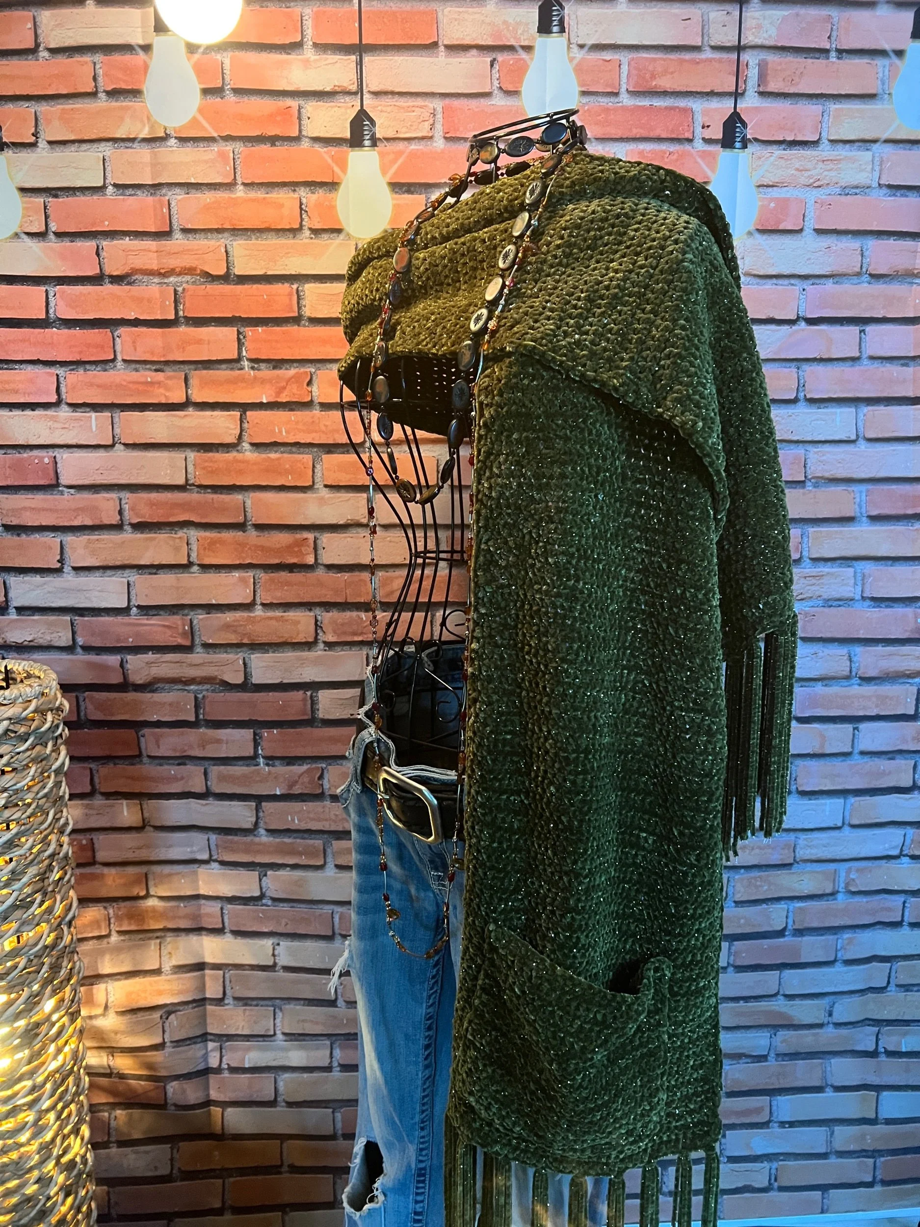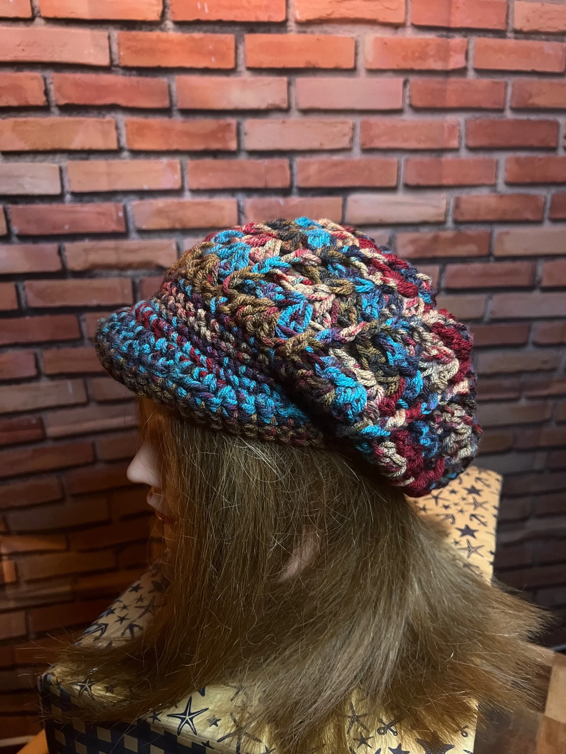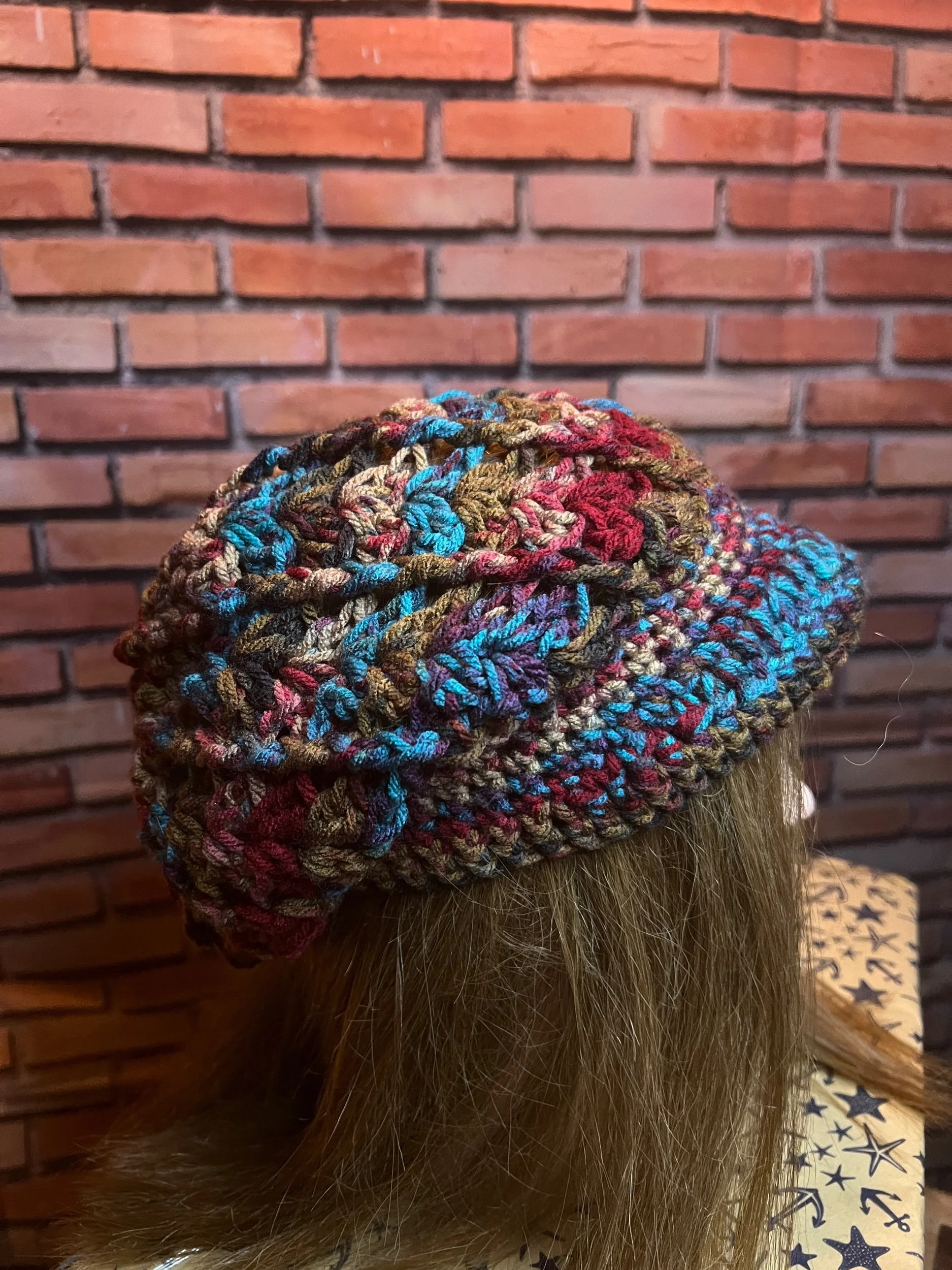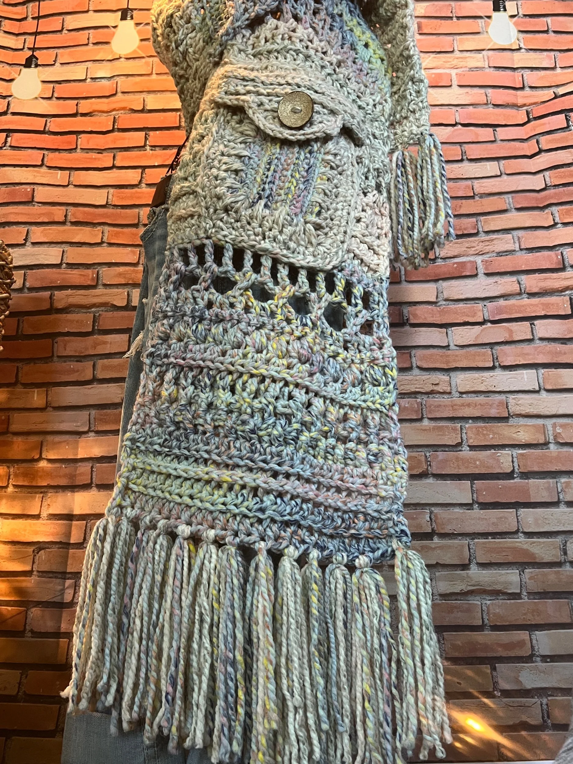 A scarf so massive it deserves its own zip code. Hand-crocheted by Anka from ultra-thick, premium wool blend yarn in earthy jewel tones that shift with the light. It’s plush, heavy, and warm enough to double as outerwear. Every stitch was laid with intention, giving it that sculptural, textured feel no machine could ever fake.