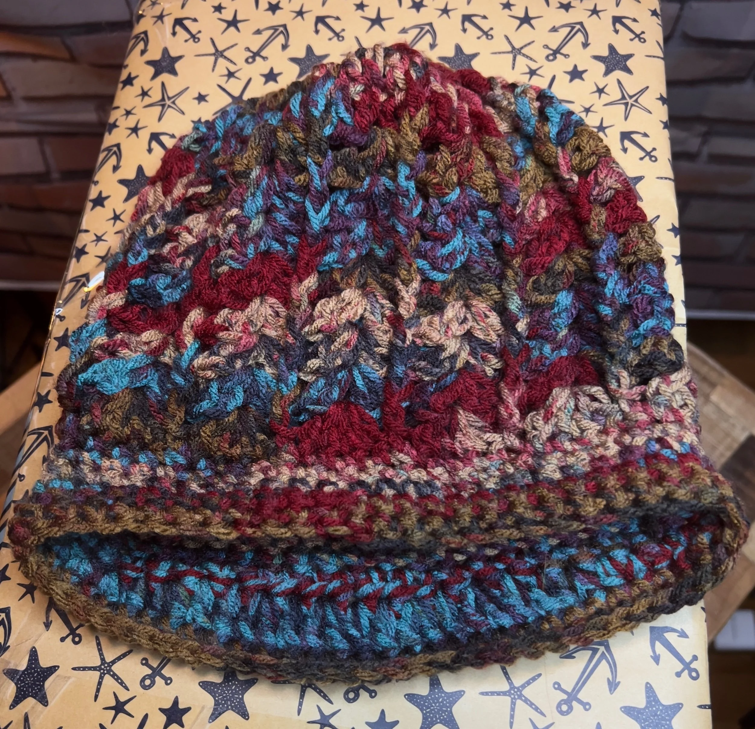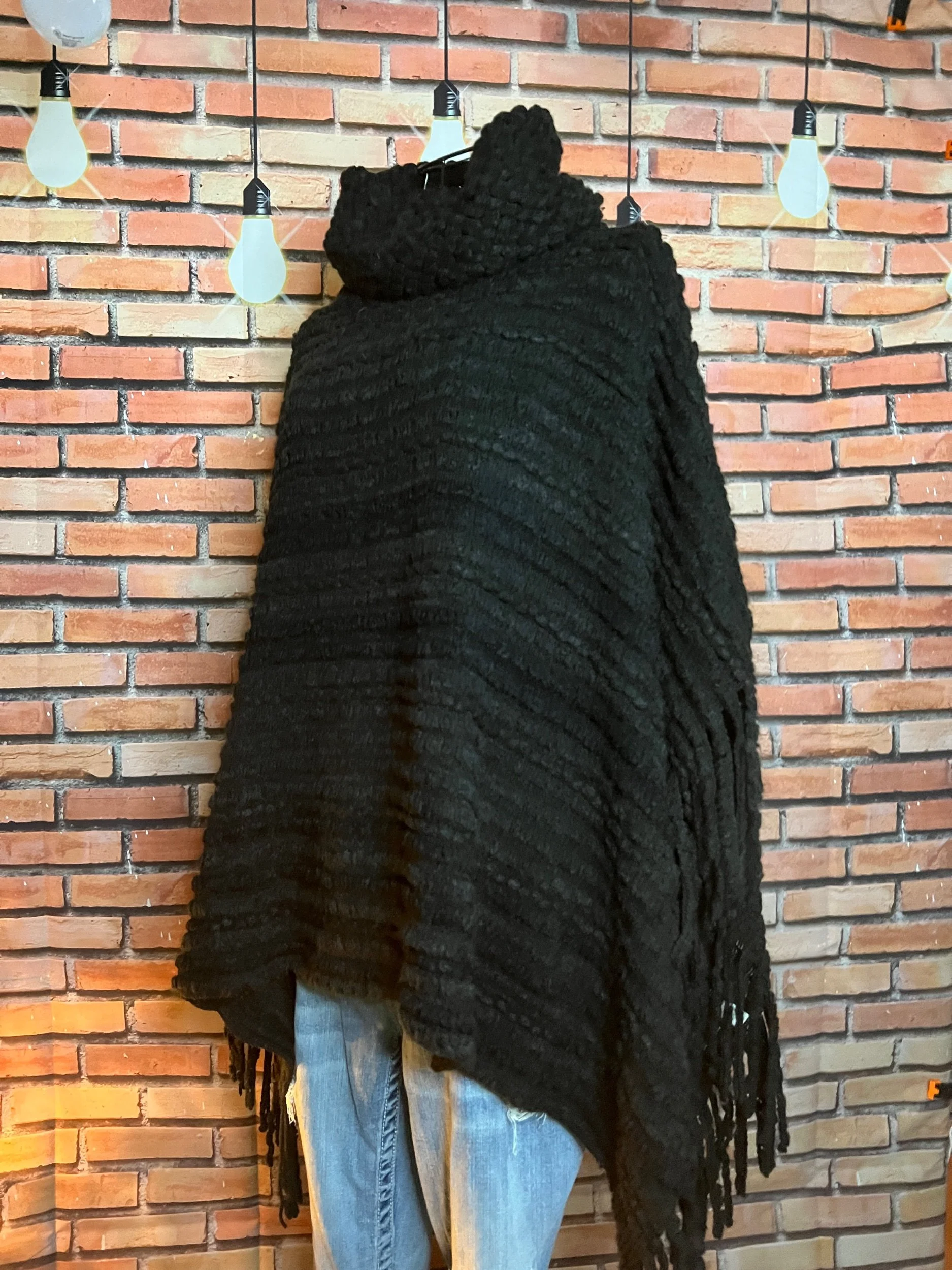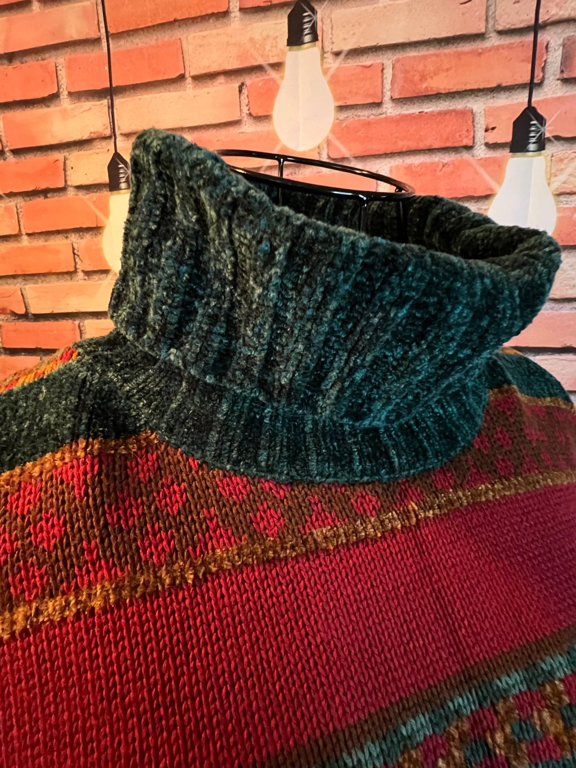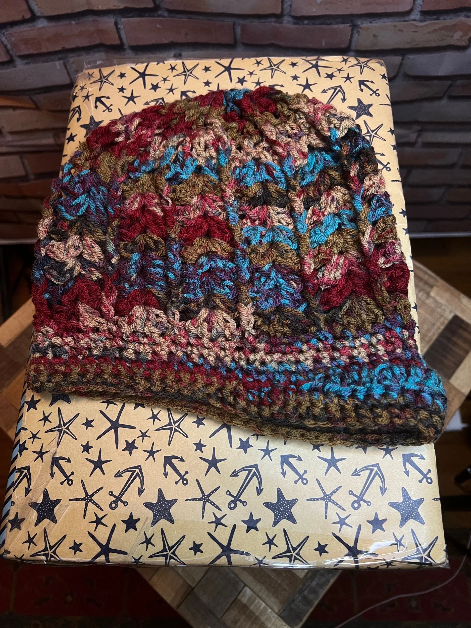 A scarf so massive it deserves its own zip code. Hand-crocheted by Anka from ultra-thick, premium wool blend yarn in earthy jewel tones that shift with the light. It’s plush, heavy, and warm enough to double as outerwear. Every stitch was laid with intention, giving it that sculptural, textured feel no machine could ever fake.