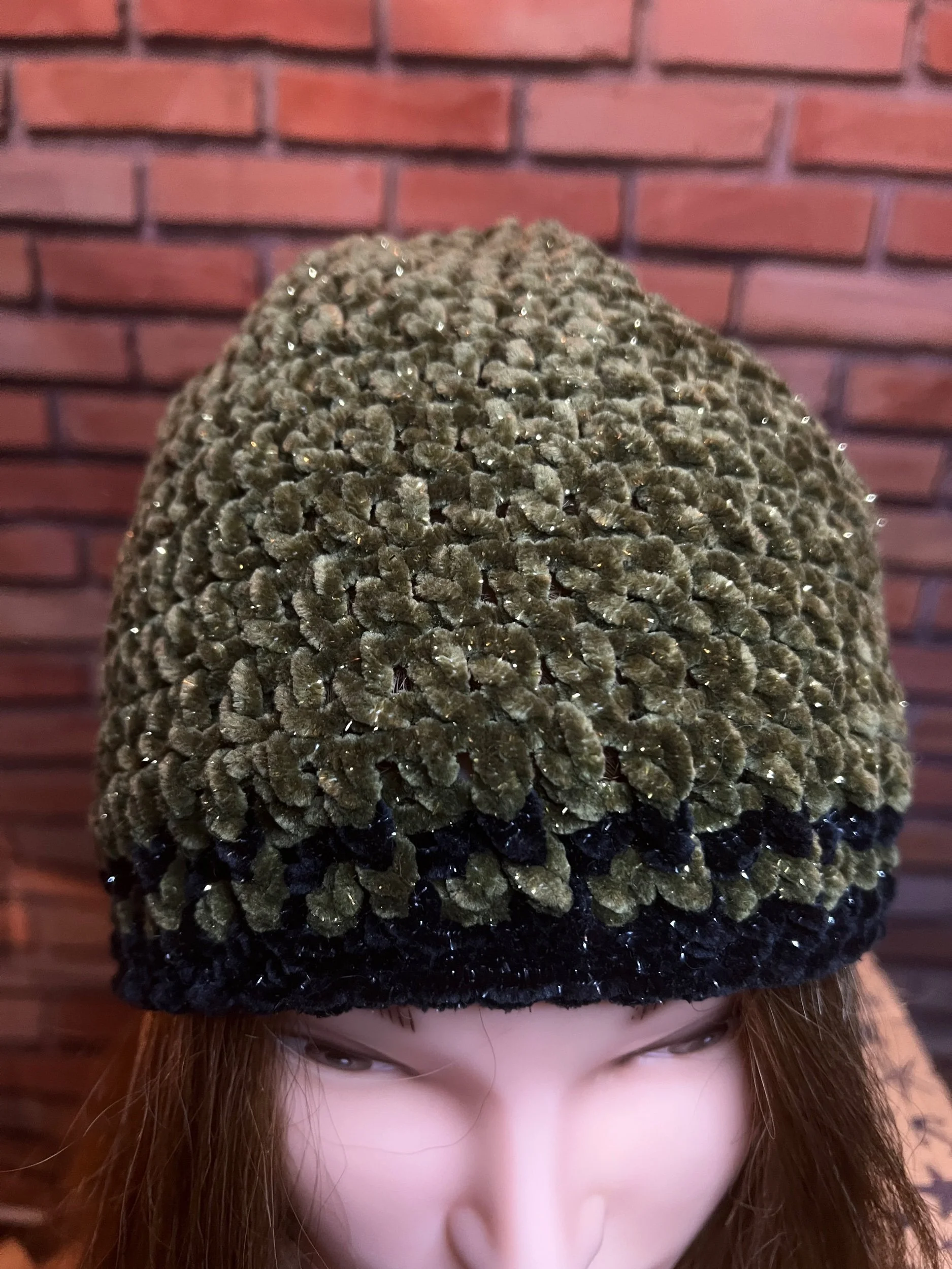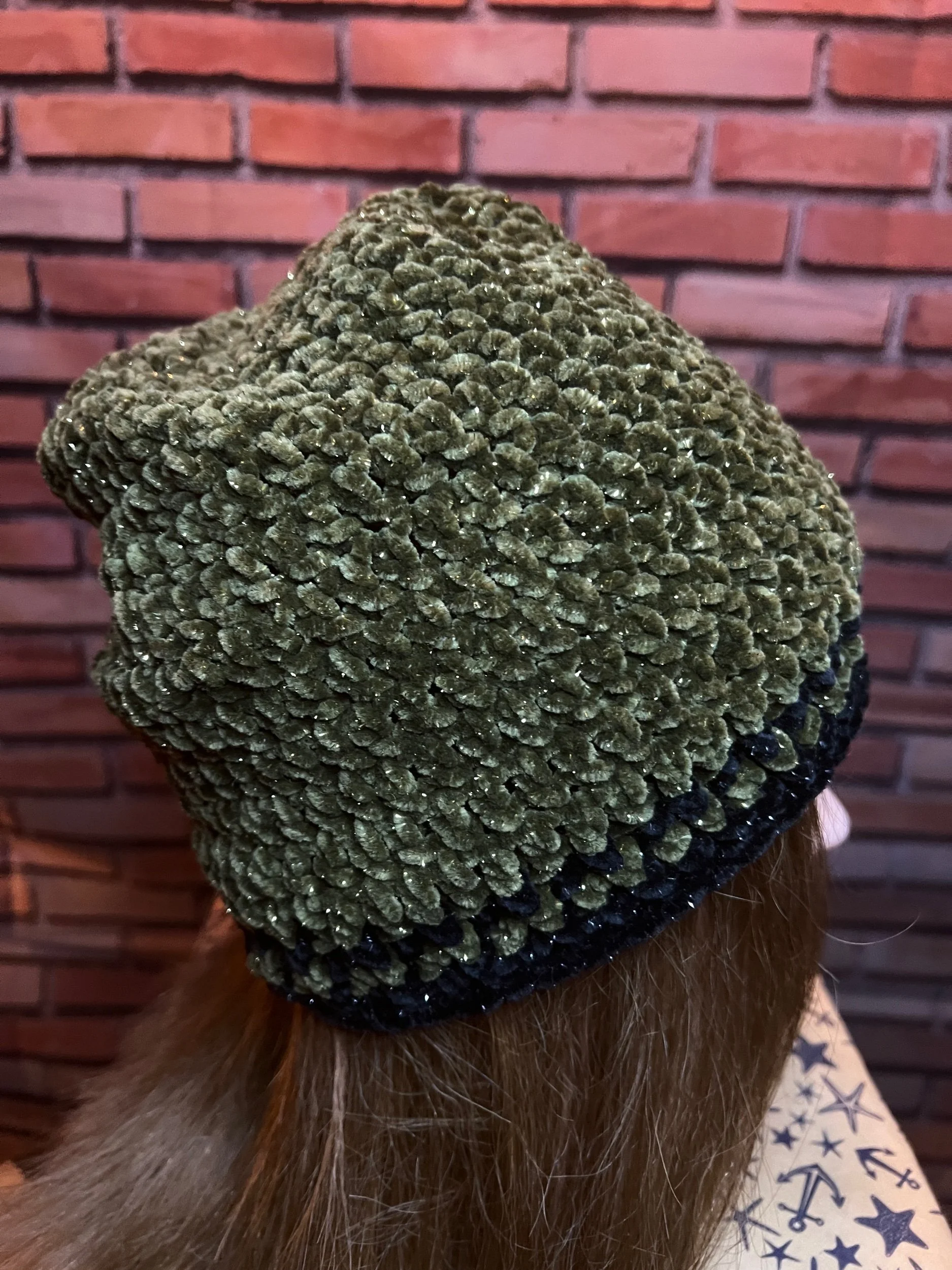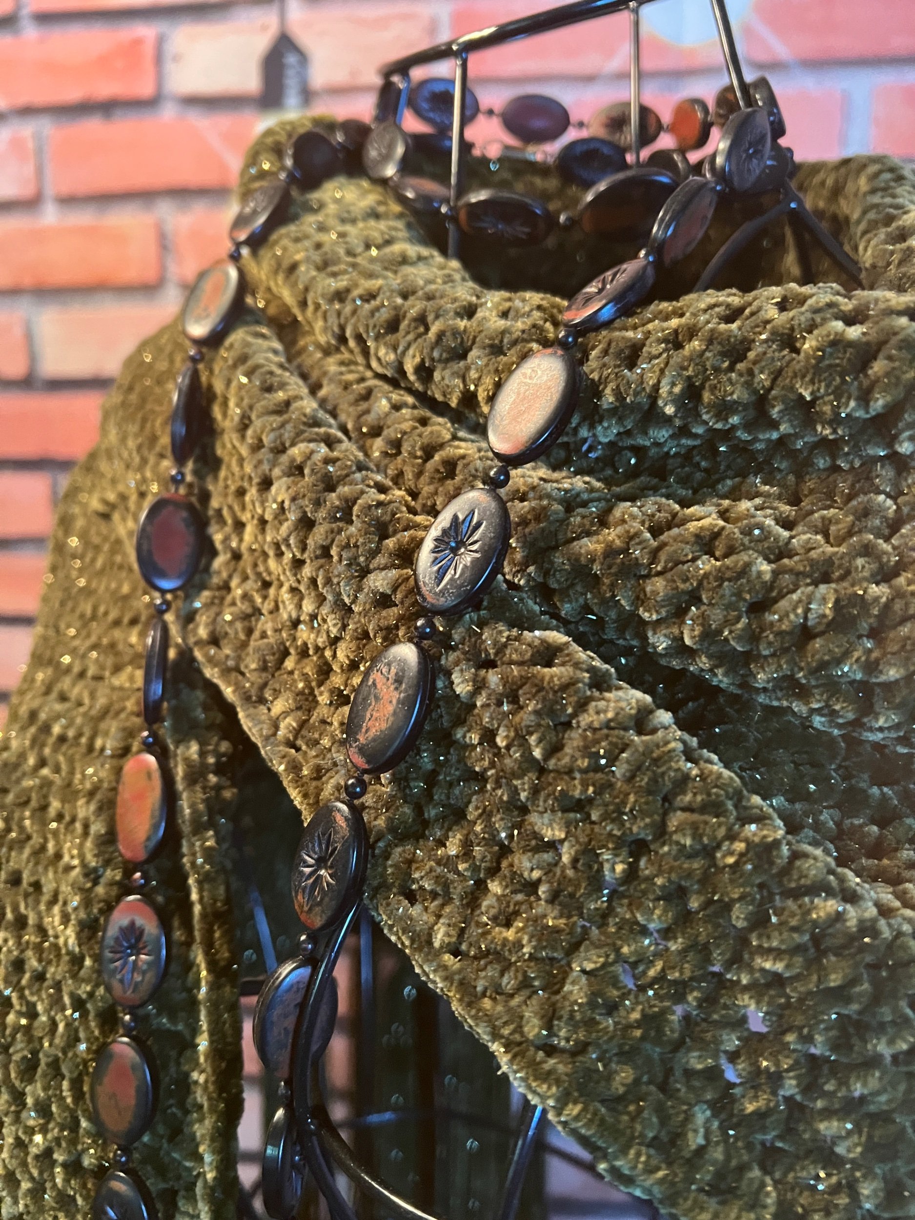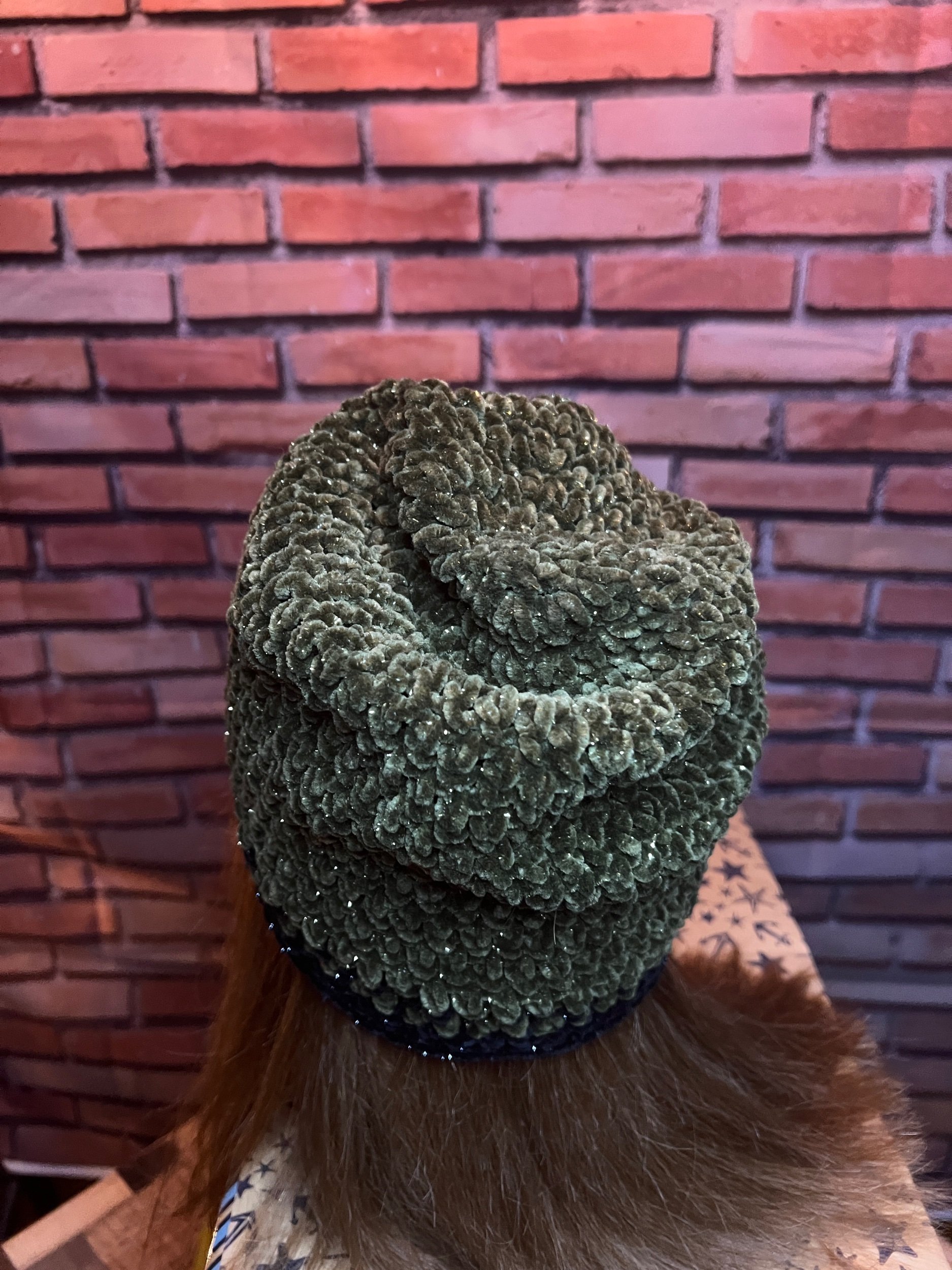 Luxe comfort meets subtle shimmer. Hand-crocheted by Anka from plush olive chenille yarn threaded with soft gold lurex, giving it just enough glint to catch the light without shouting for attention. Thick, ultra-soft, and designed for serious coziness with a touch of glam.