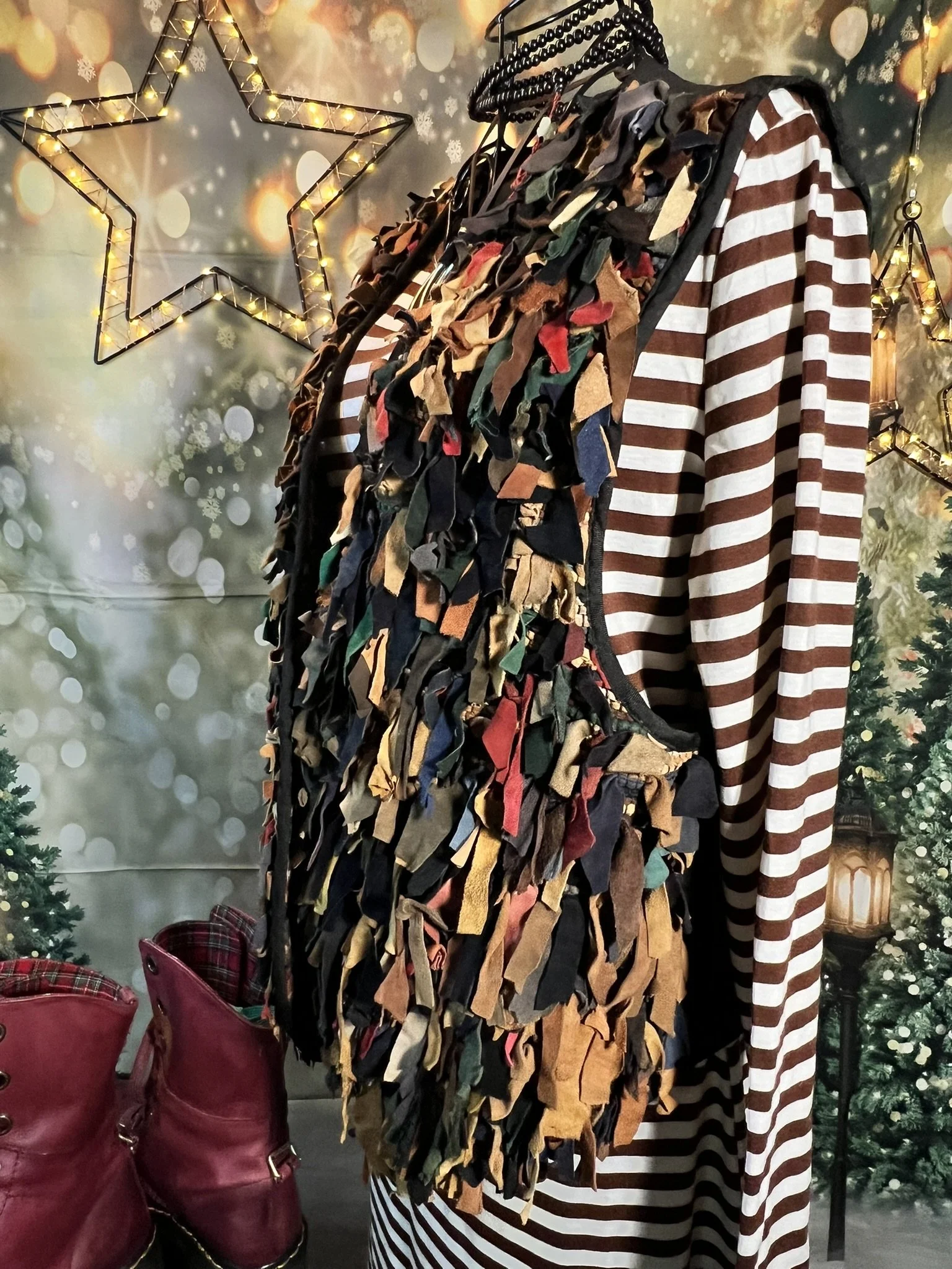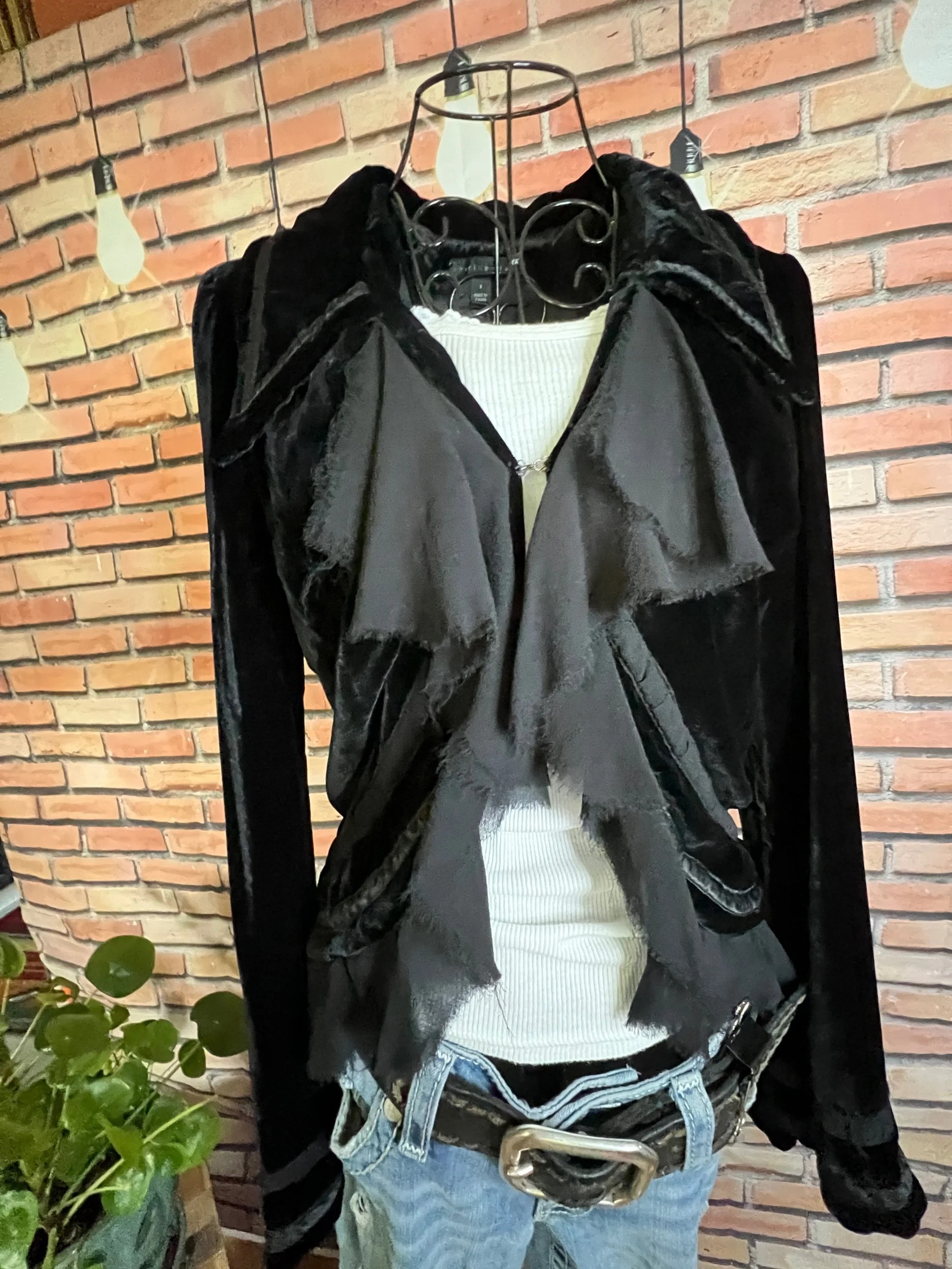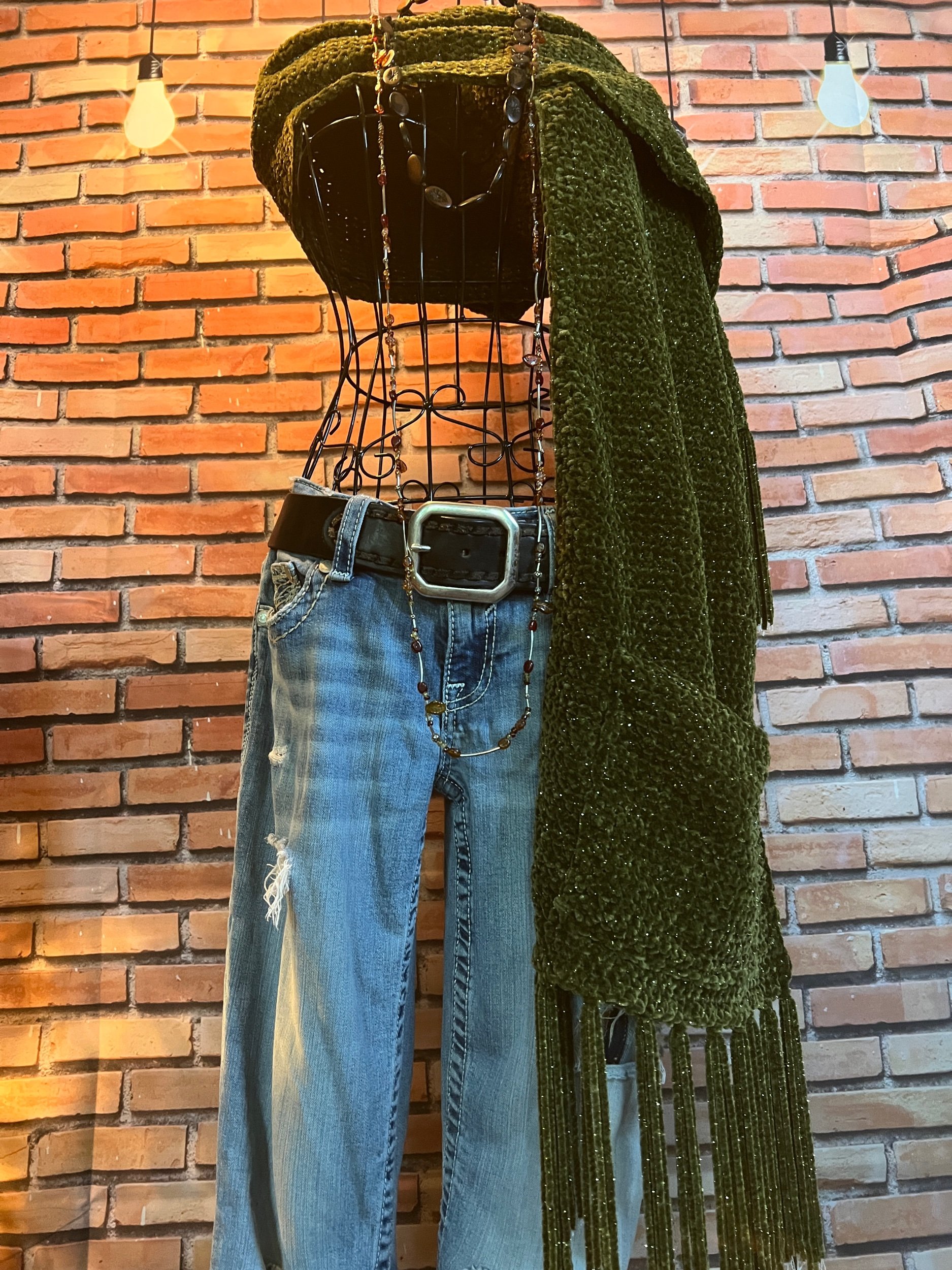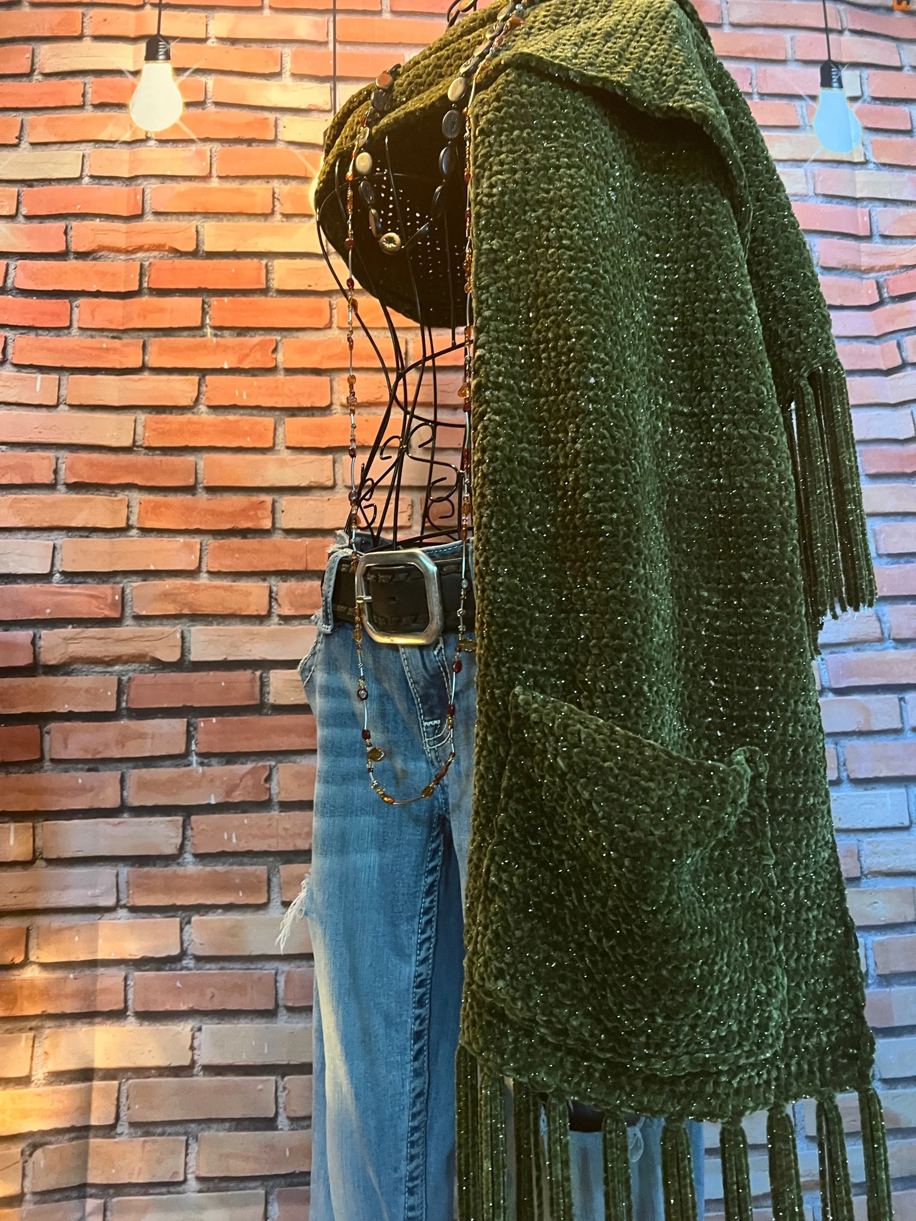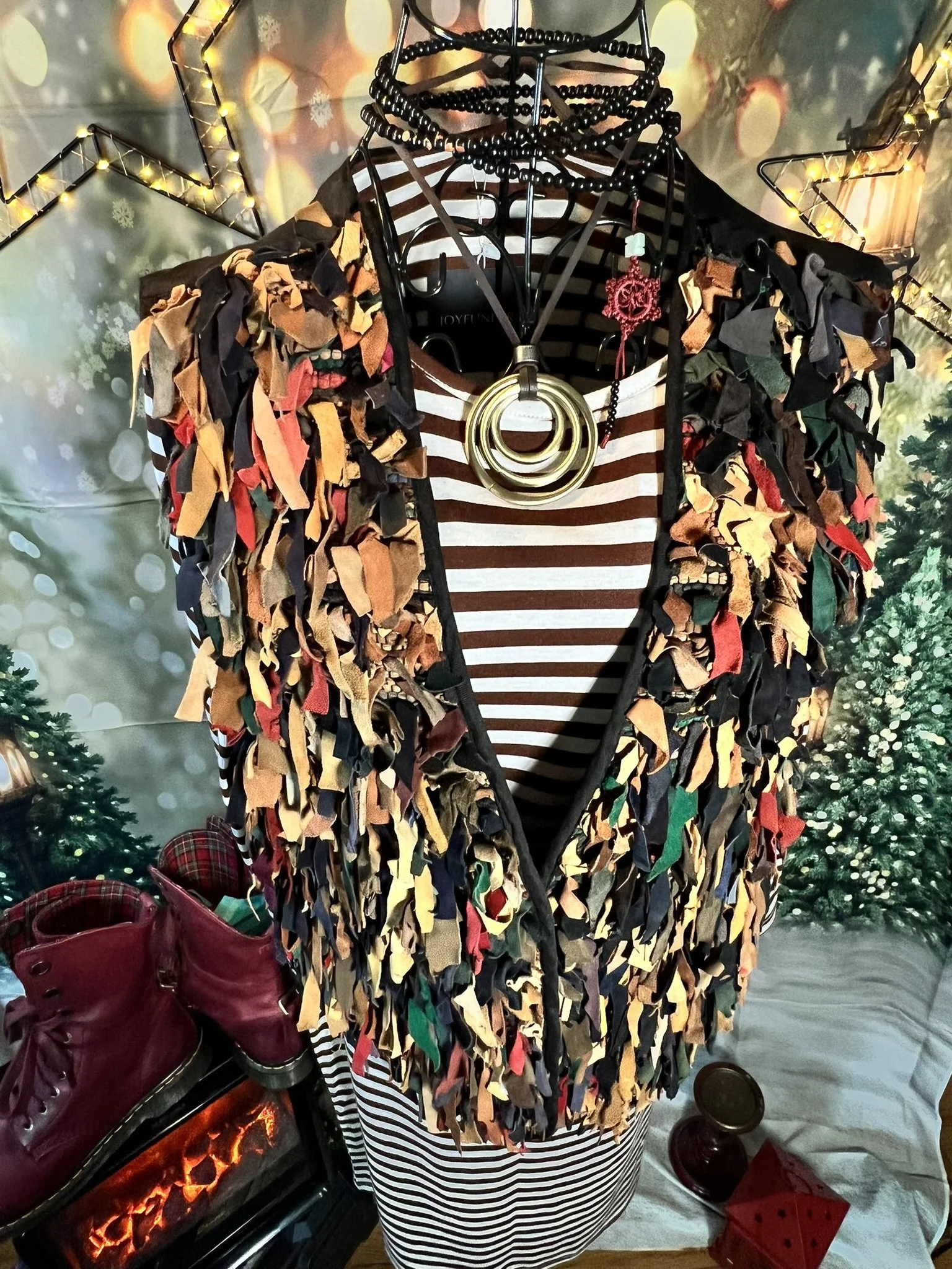 A full-blown textural masterpiece. Every single suede strip is hand-tied, giving it that lived-in, tribal, nomadic-warrior energy. It’s the kind of vest you only see once — on a runway, in a dream, or on that one woman who absolutely knows who she is. Heavy, dramatic, and impossible to ignore.