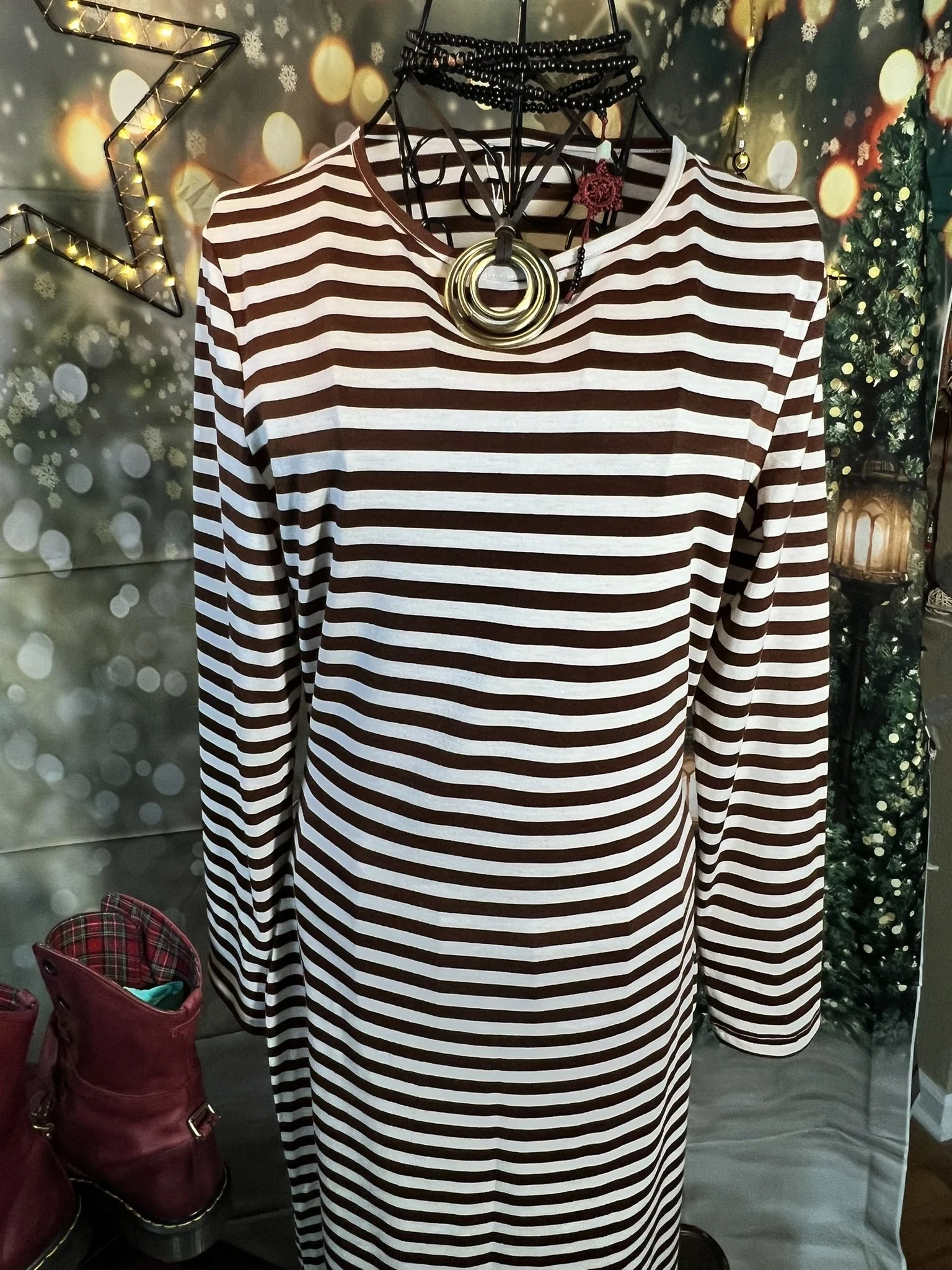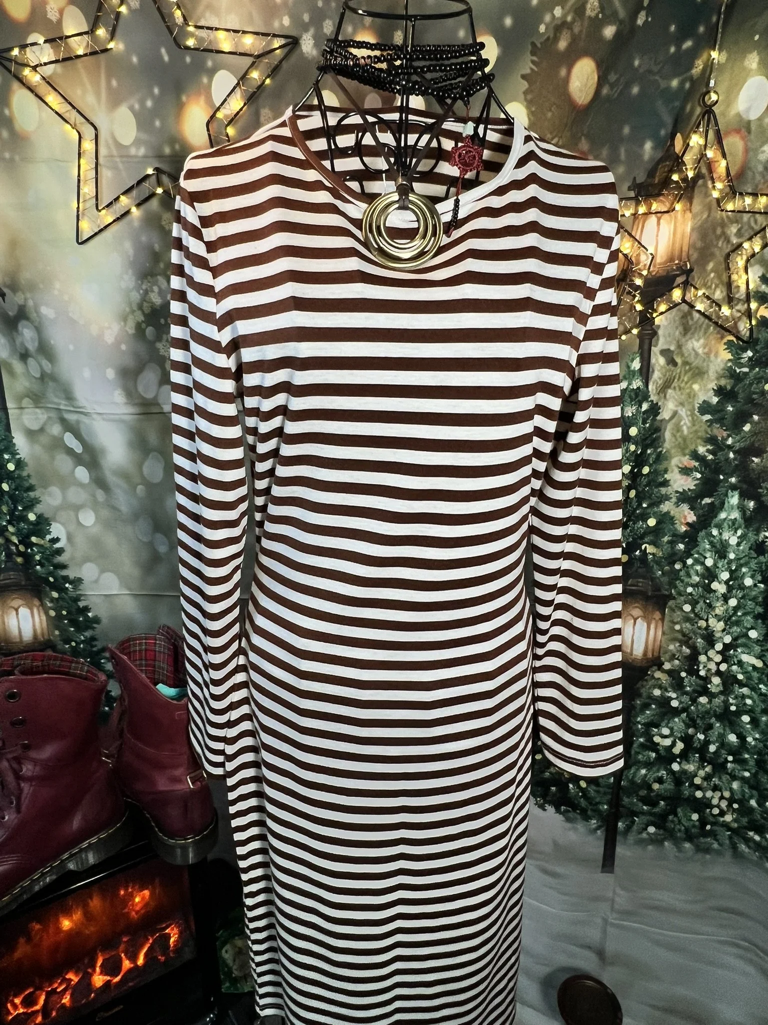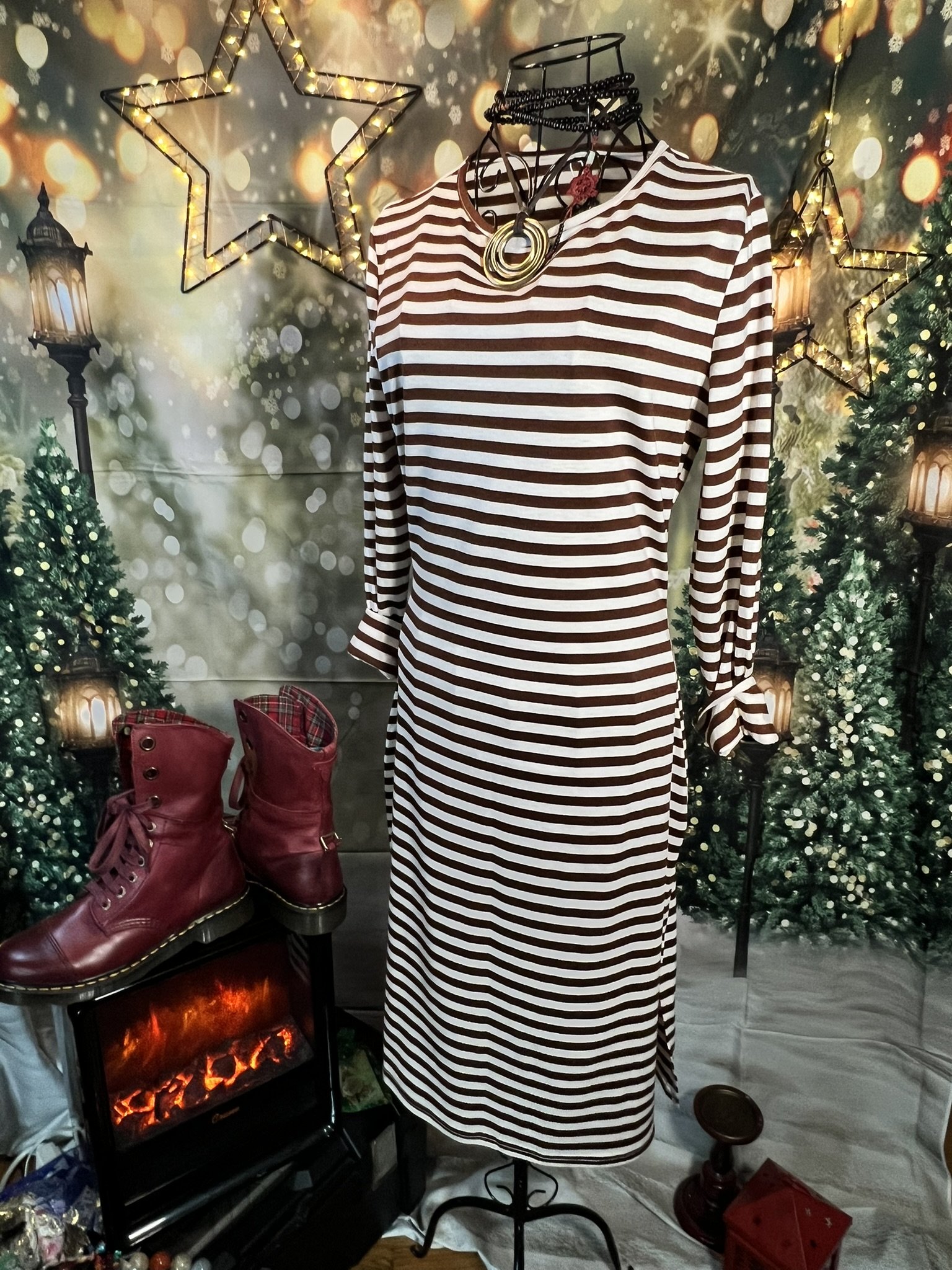 A clean, structured, hourglass-shaped shift dress masquerading as “simple.” Brown + ivory stripes, mid-weight knit, and a cut that actually respects your hips instead of fighting them. New with tags. Side slit for movement, attitude optional. Style it over jeans, with a belt, or just let it do its own thing.