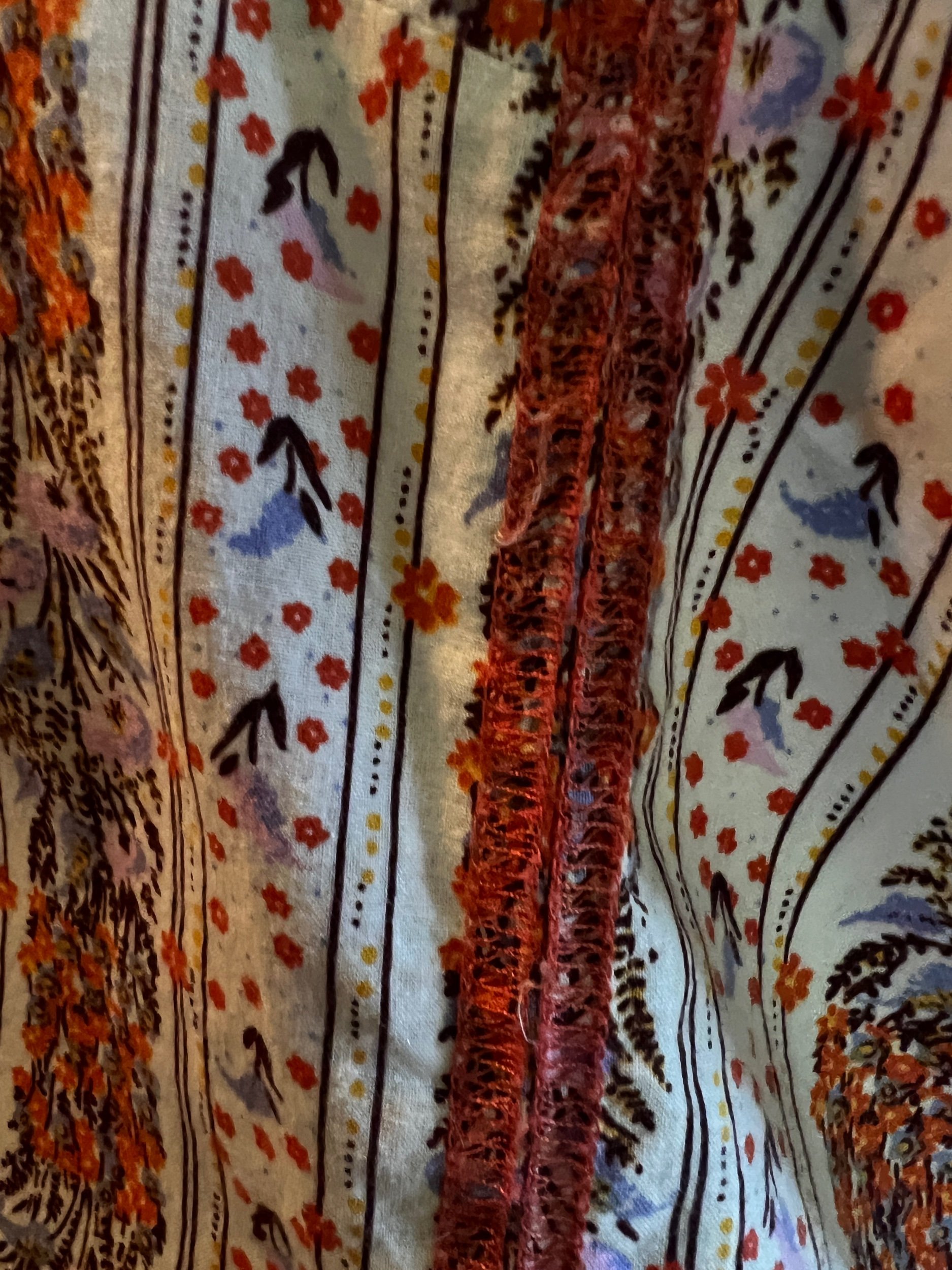 Color: Cream base with blue + coral floral pattern