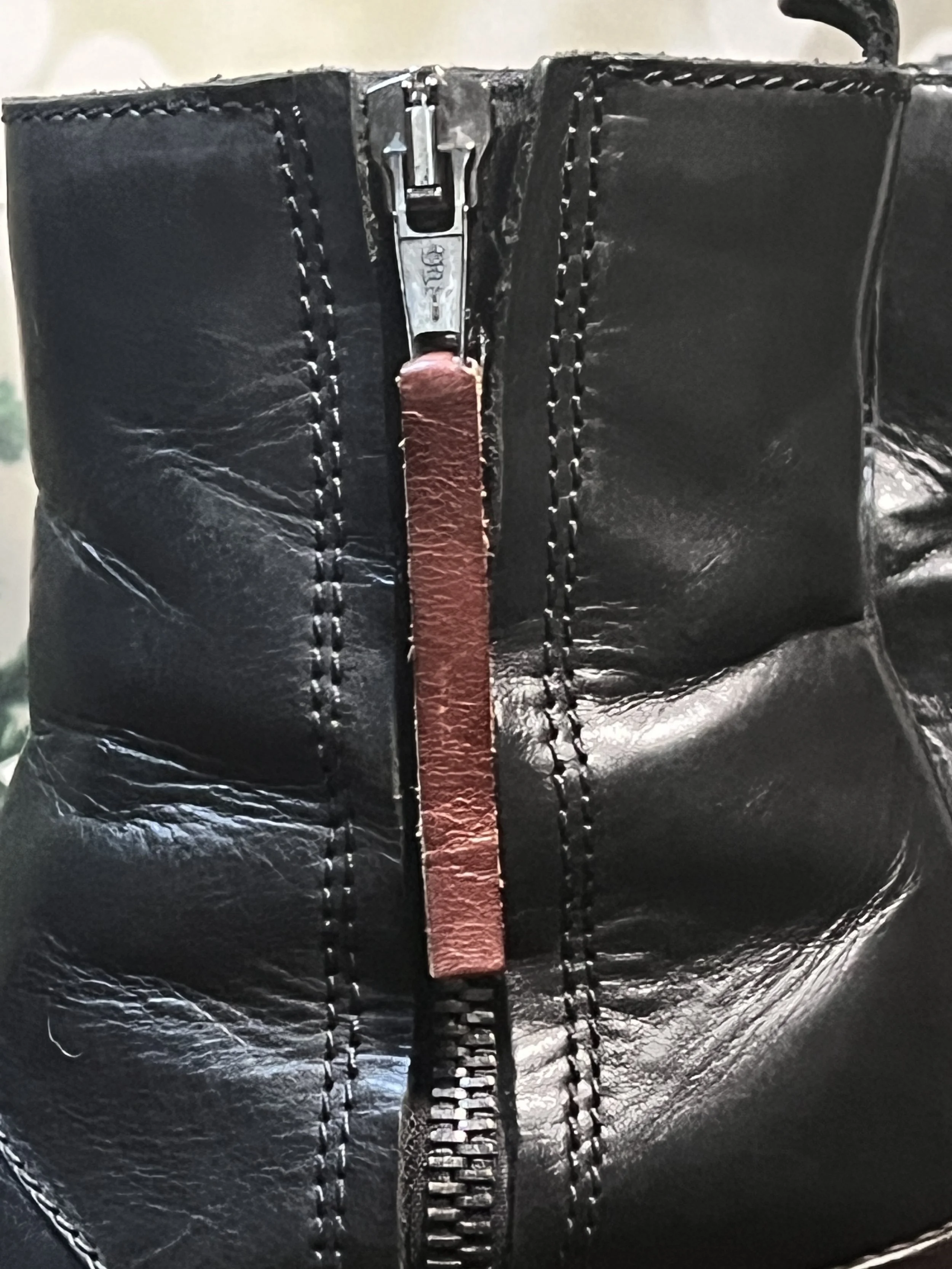 Sleek black leather exterior with attention-grabbing red zipper pull for a rock 'n' roll edge.