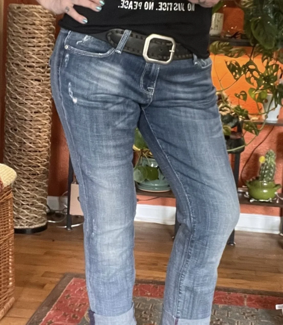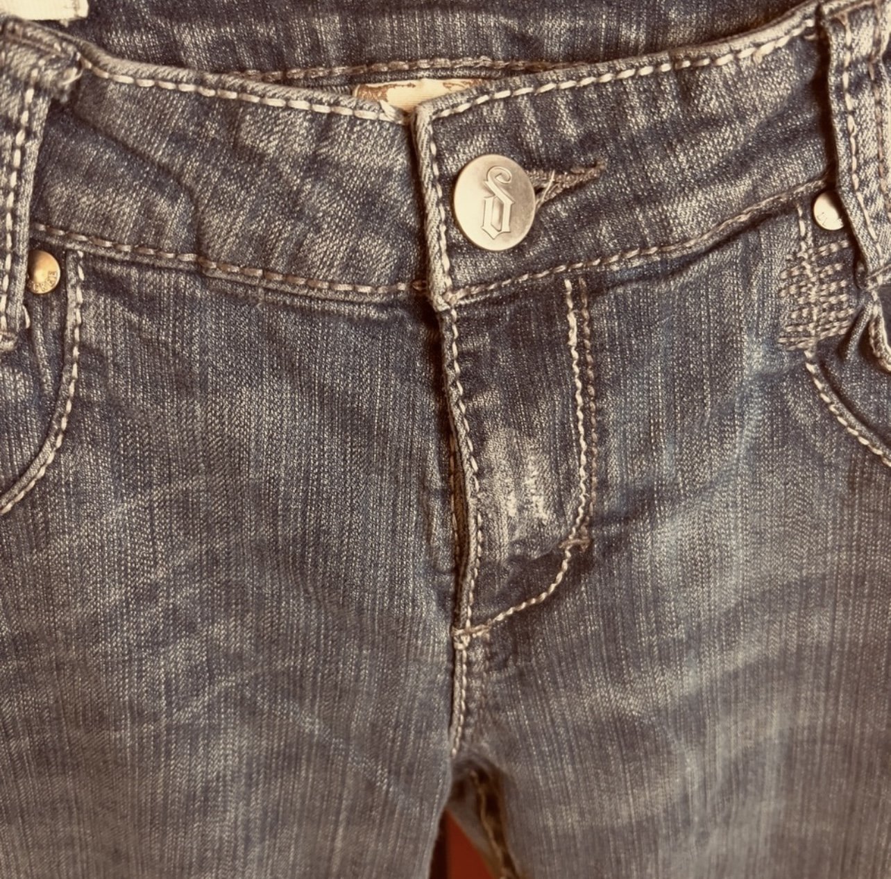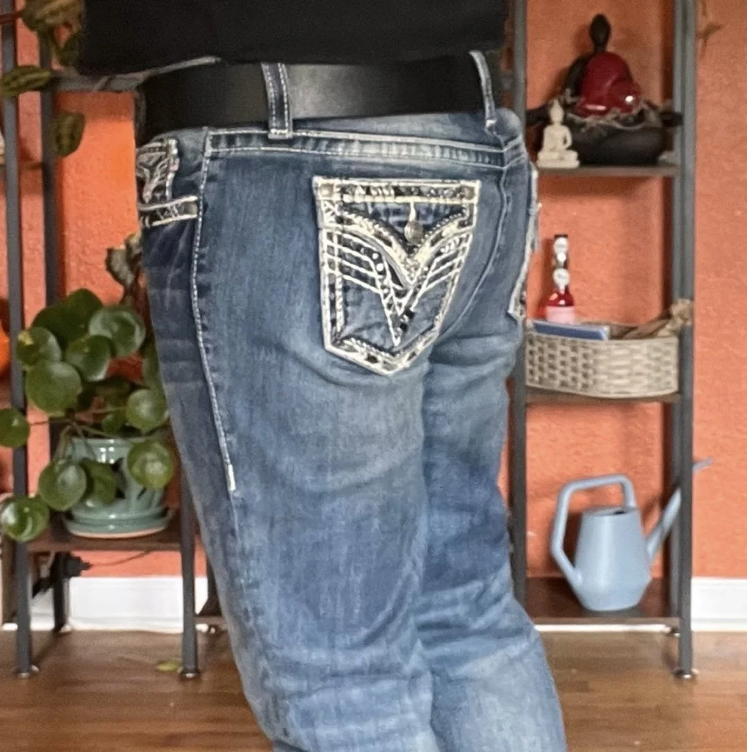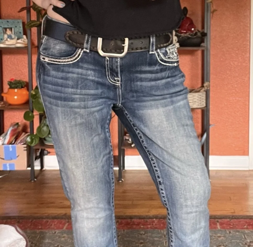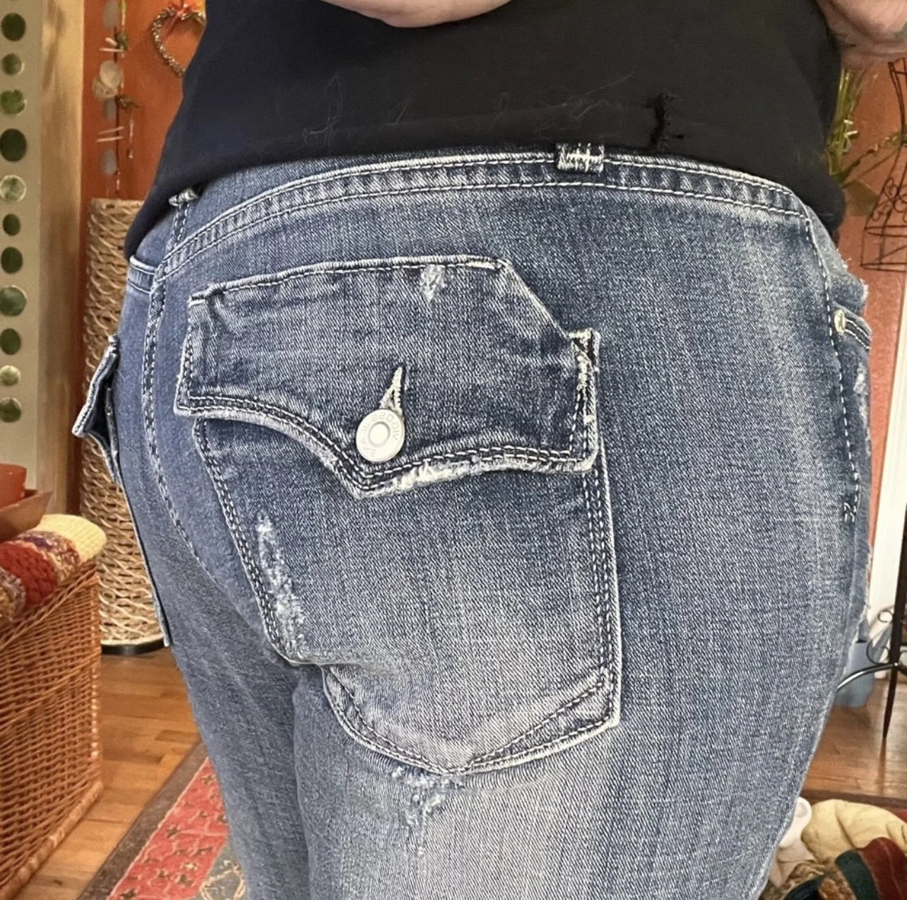 They’ve got a little extra “character” thanks to some real-life distressing—clearly someone had a good time in these. Mid-shine, mid-chaos, total Y2K vibe. Perfect with a baby tee, wedges, or whatever you’re brave enough to pull them off with