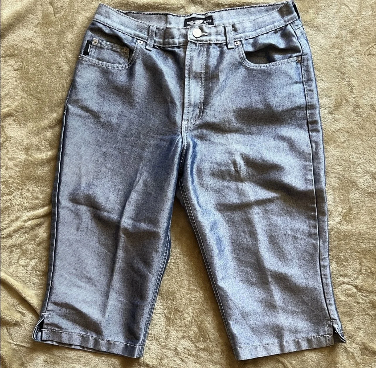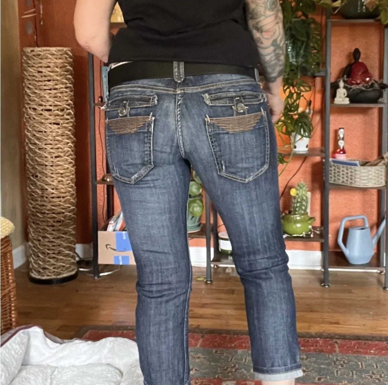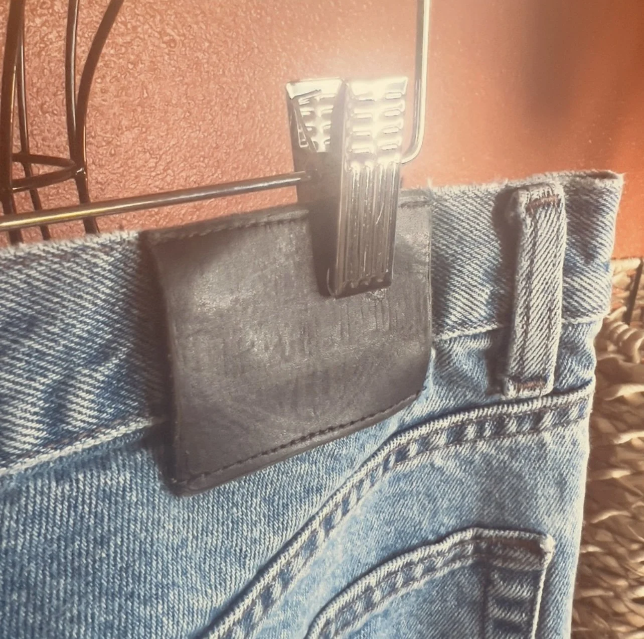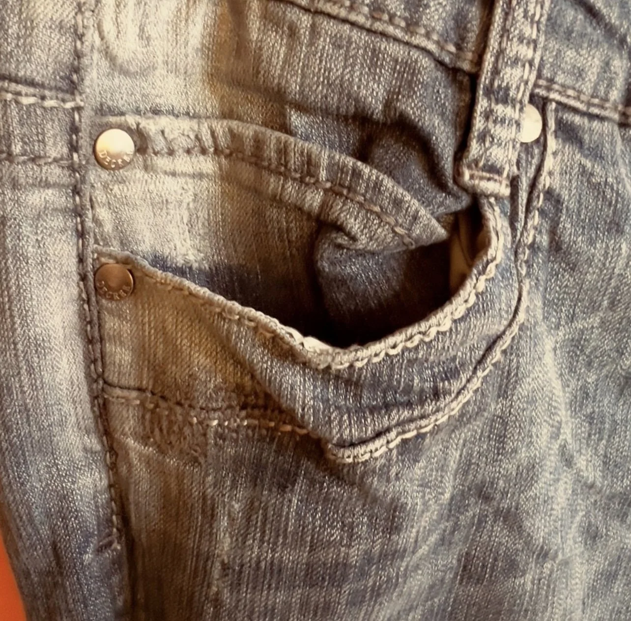 They’ve got a little extra “character” thanks to some real-life distressing—clearly someone had a good time in these. Mid-shine, mid-chaos, total Y2K vibe. Perfect with a baby tee, wedges, or whatever you’re brave enough to pull them off with