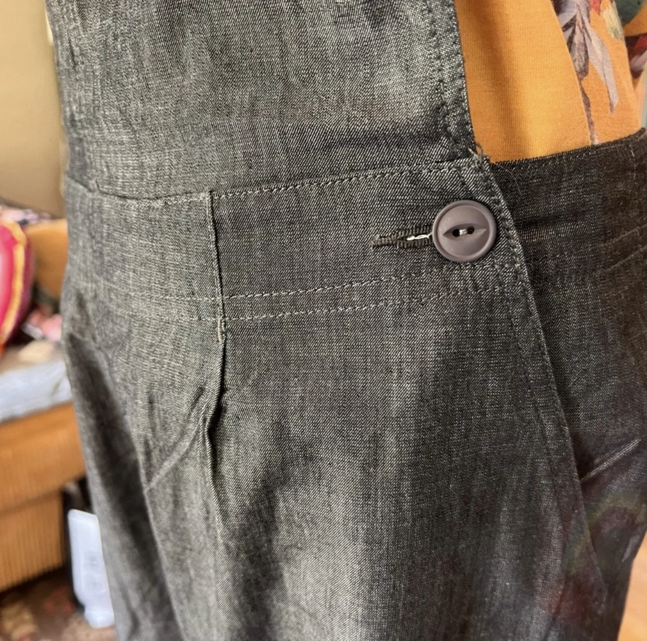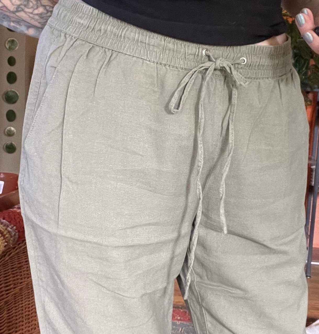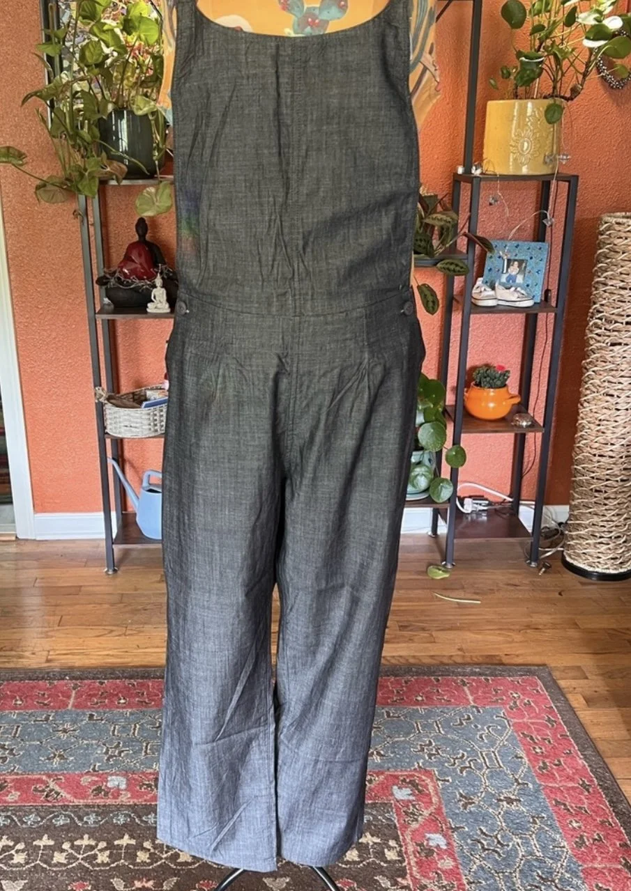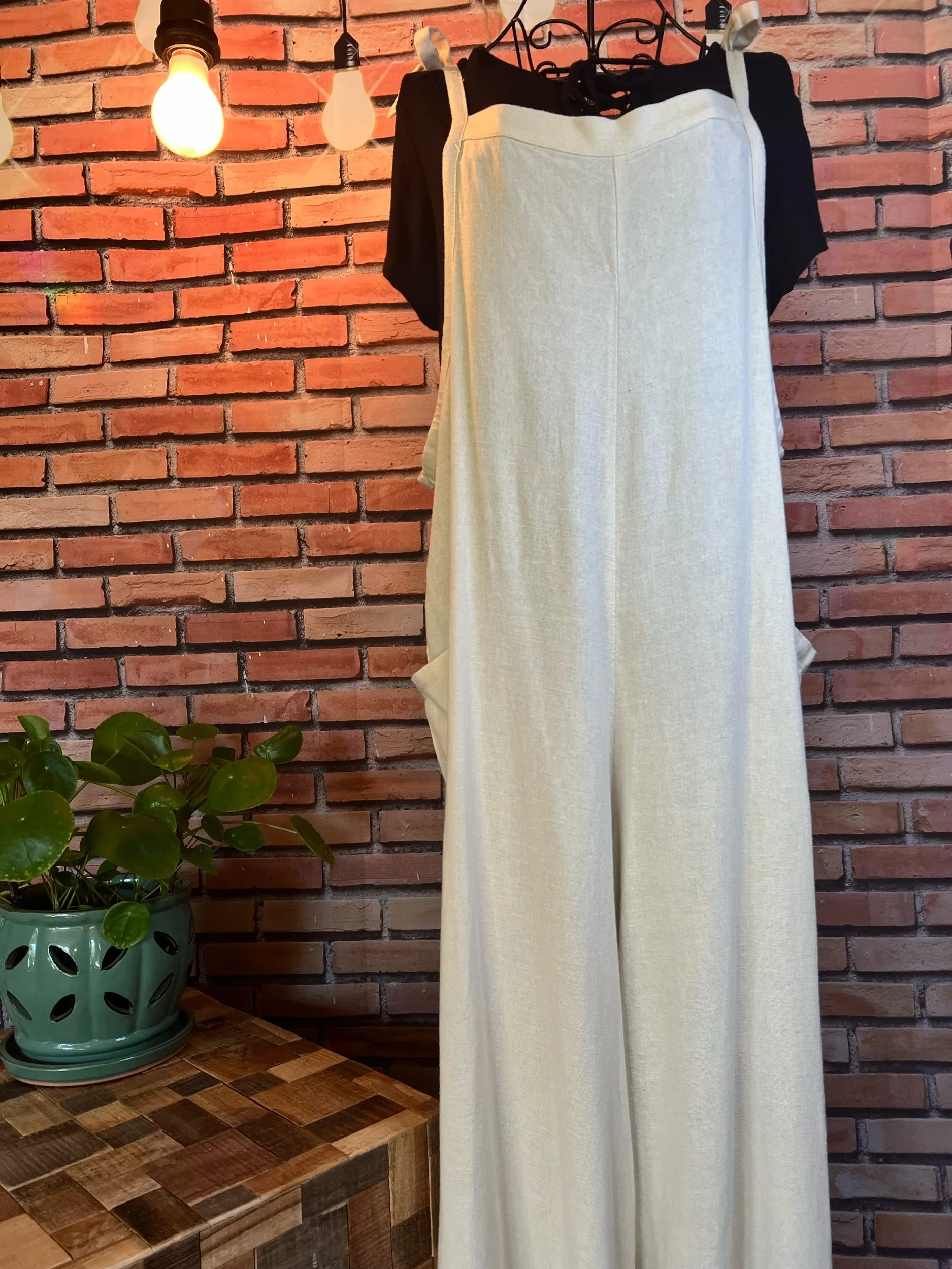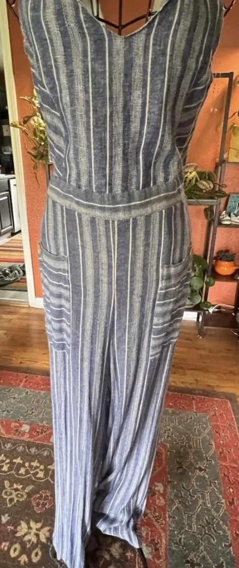Linen summer jump suit, great for the beach or the park, buttons and ties in the back, comfortable not too tight elastic waistband and pockets and wide legs! NWOT