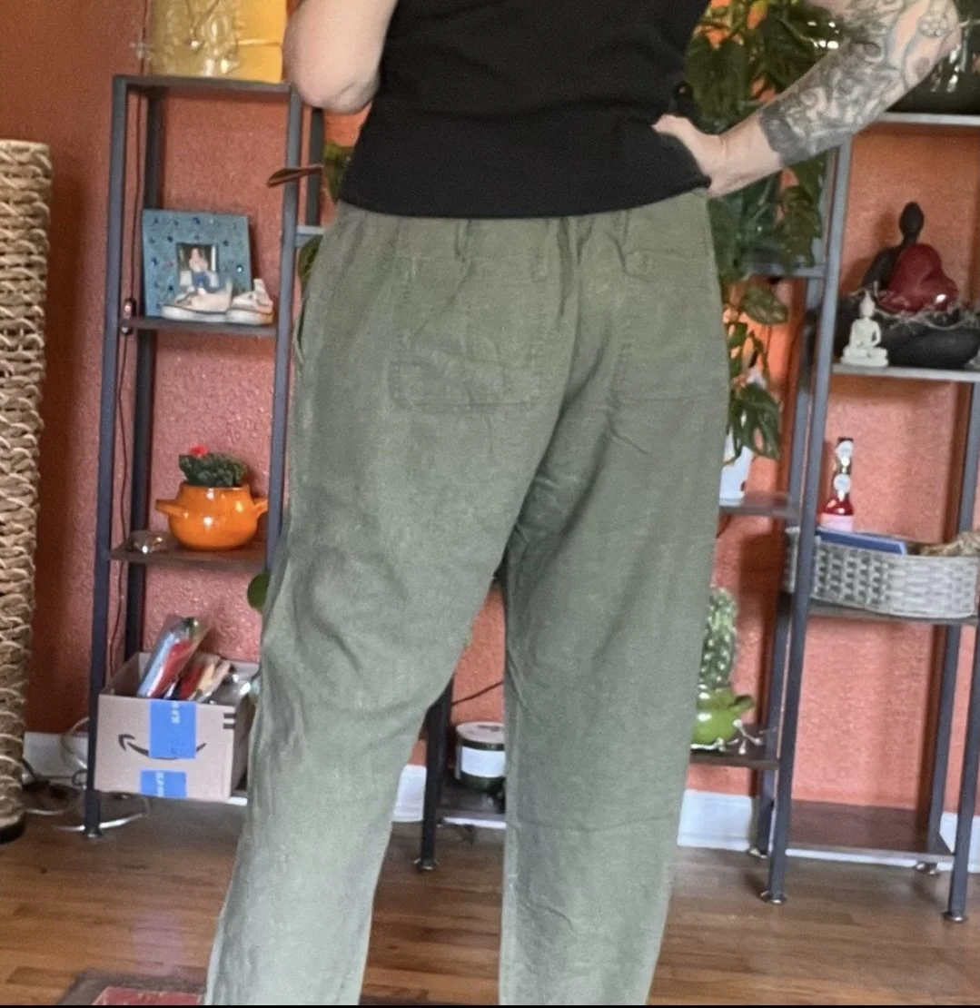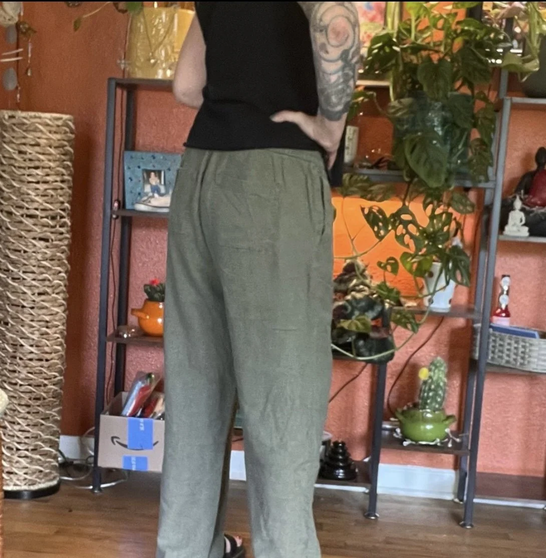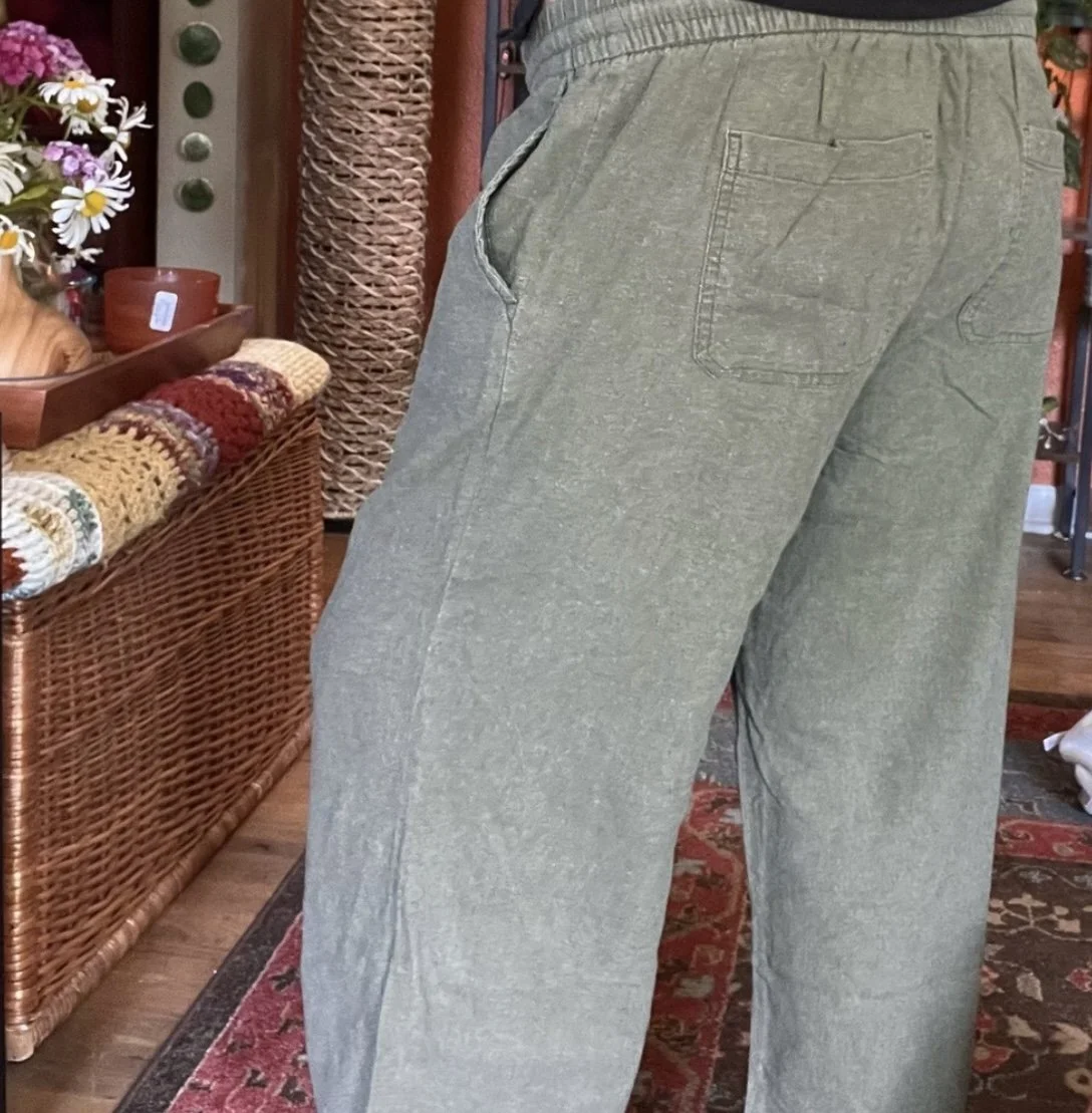 Super comfortable and stylish, these army green loungers are perfect for any casual relaxing. Enjoy a loose fit with a modern look. Drawstring and elastic waist, wide leg.