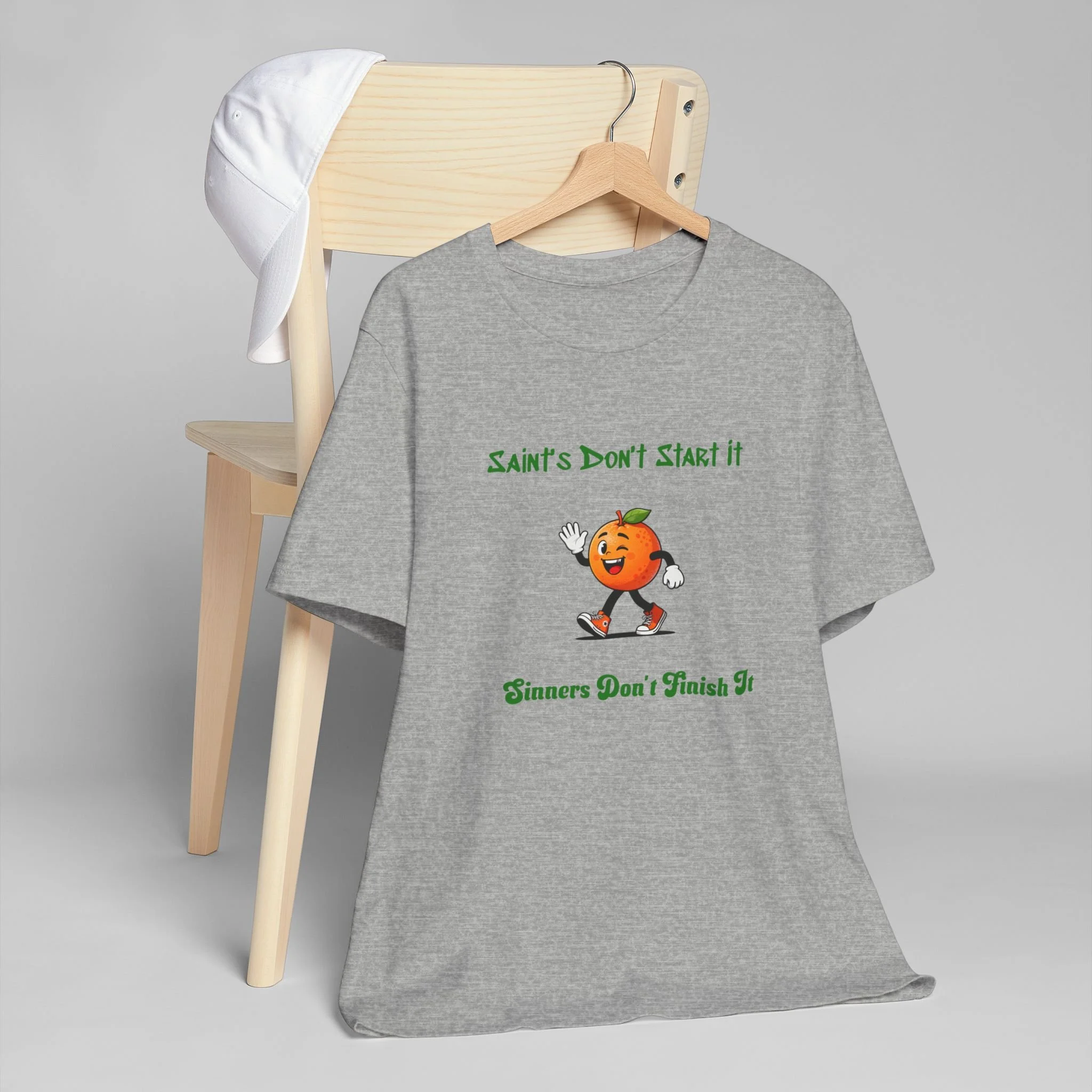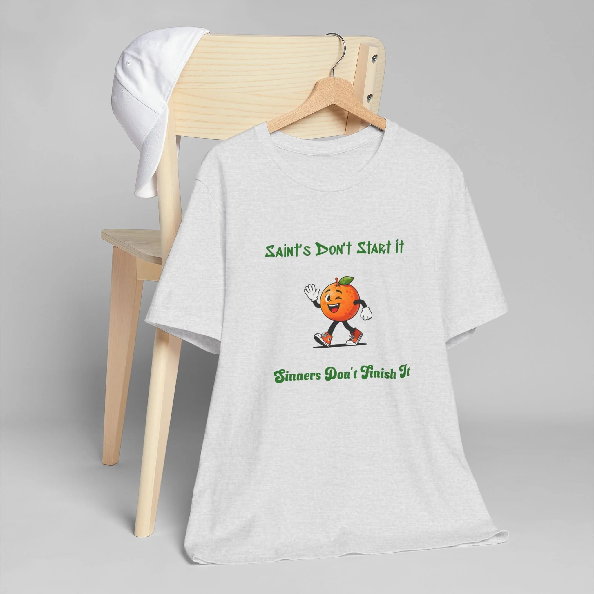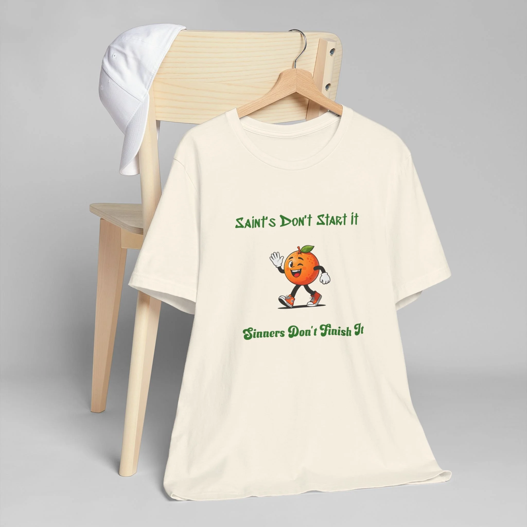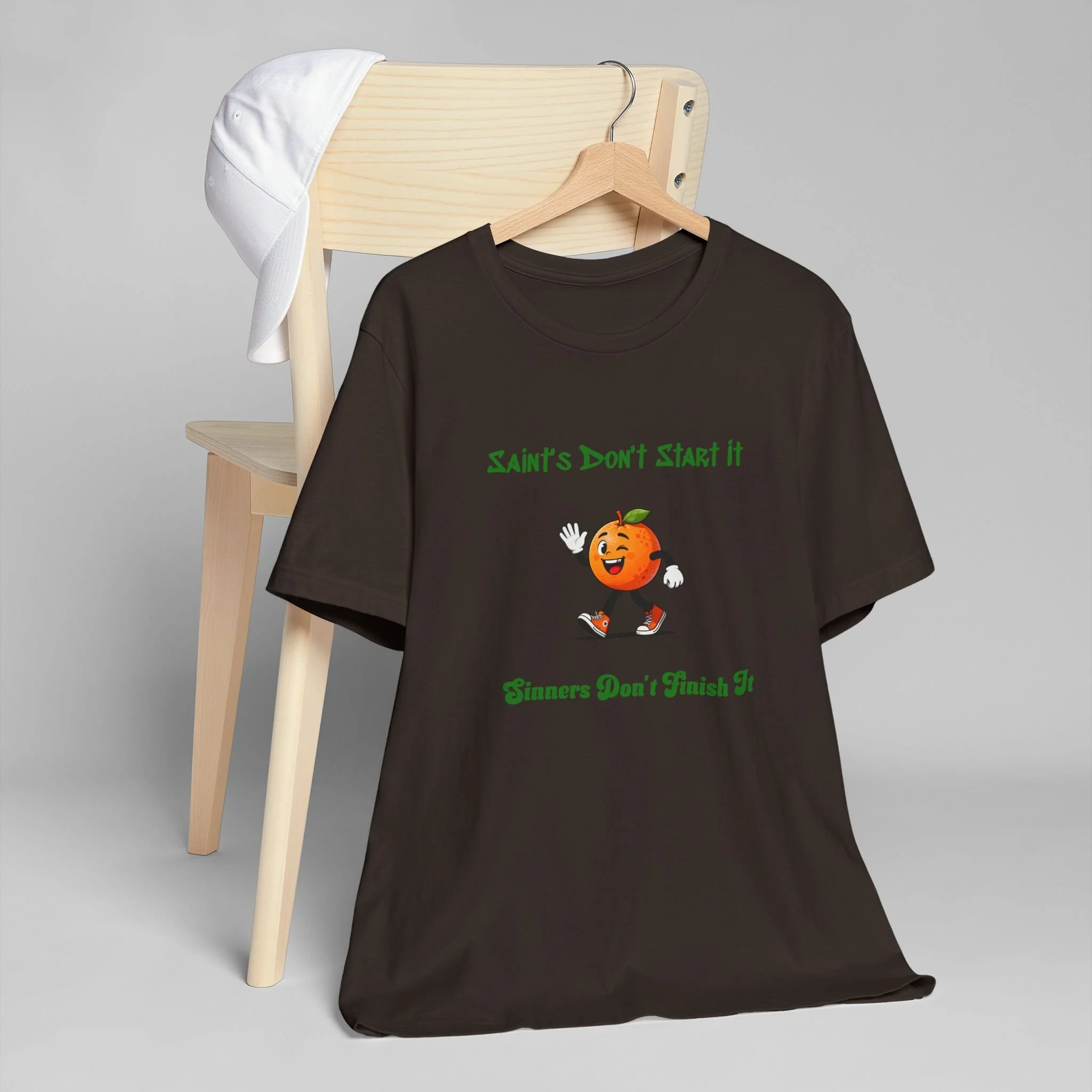 Light, airy, and quietly playful — this jersey tee carries a cheeky vintage-orange mascot and the phrase “Saints Don’t Start It / Sinners Don’t Finish It.” It sits softly on the body with a relaxed retail fit that layers easily under jackets or wears solo on warm days. The breathable, responsibly sourced cotton keeps you cool at the gym, on a walk, or while sharing a laugh with friends. The clean crew neckline and neat hem give it a classic silhouette, while the subtle printed neck label keeps the feel irritation-free. Wear it when you want to blend retro humor with everyday comfort.