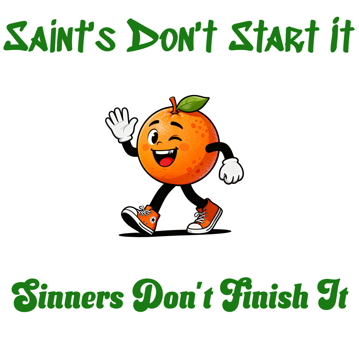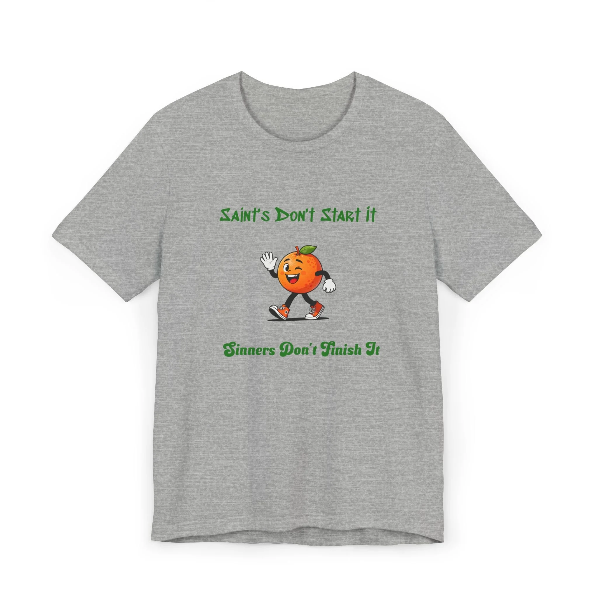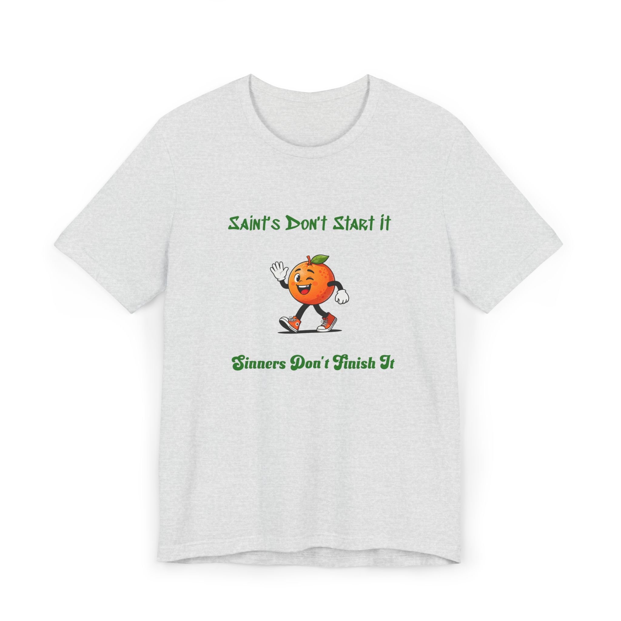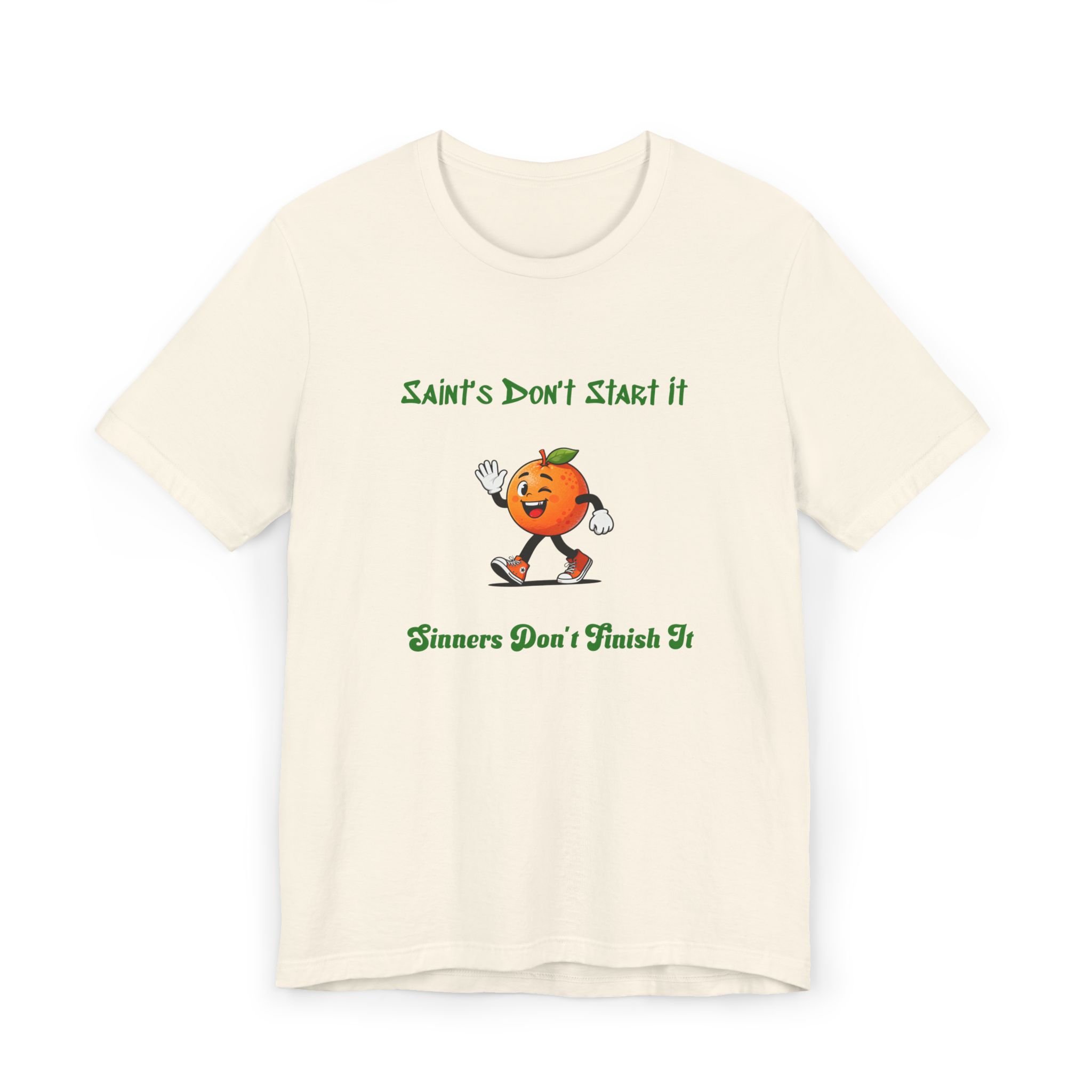 Light, airy, and quietly playful — this jersey tee carries a cheeky vintage-orange mascot and the phrase “Saints Don’t Start It / Sinners Don’t Finish It.” It sits softly on the body with a relaxed retail fit that layers easily under jackets or wears solo on warm days. The breathable, responsibly sourced cotton keeps you cool at the gym, on a walk, or while sharing a laugh with friends. The clean crew neckline and neat hem give it a classic silhouette, while the subtle printed neck label keeps the feel irritation-free. Wear it when you want to blend retro humor with everyday comfort.