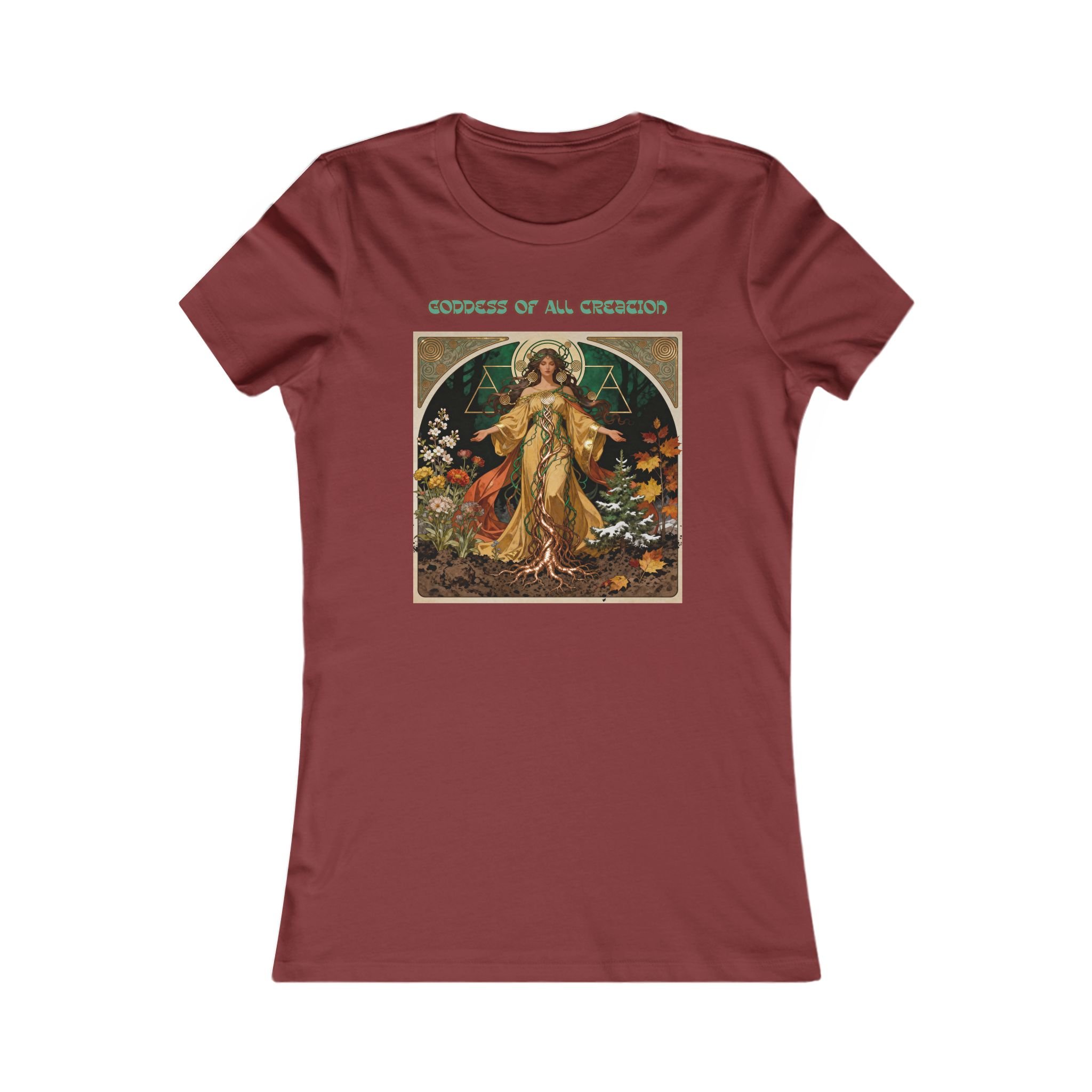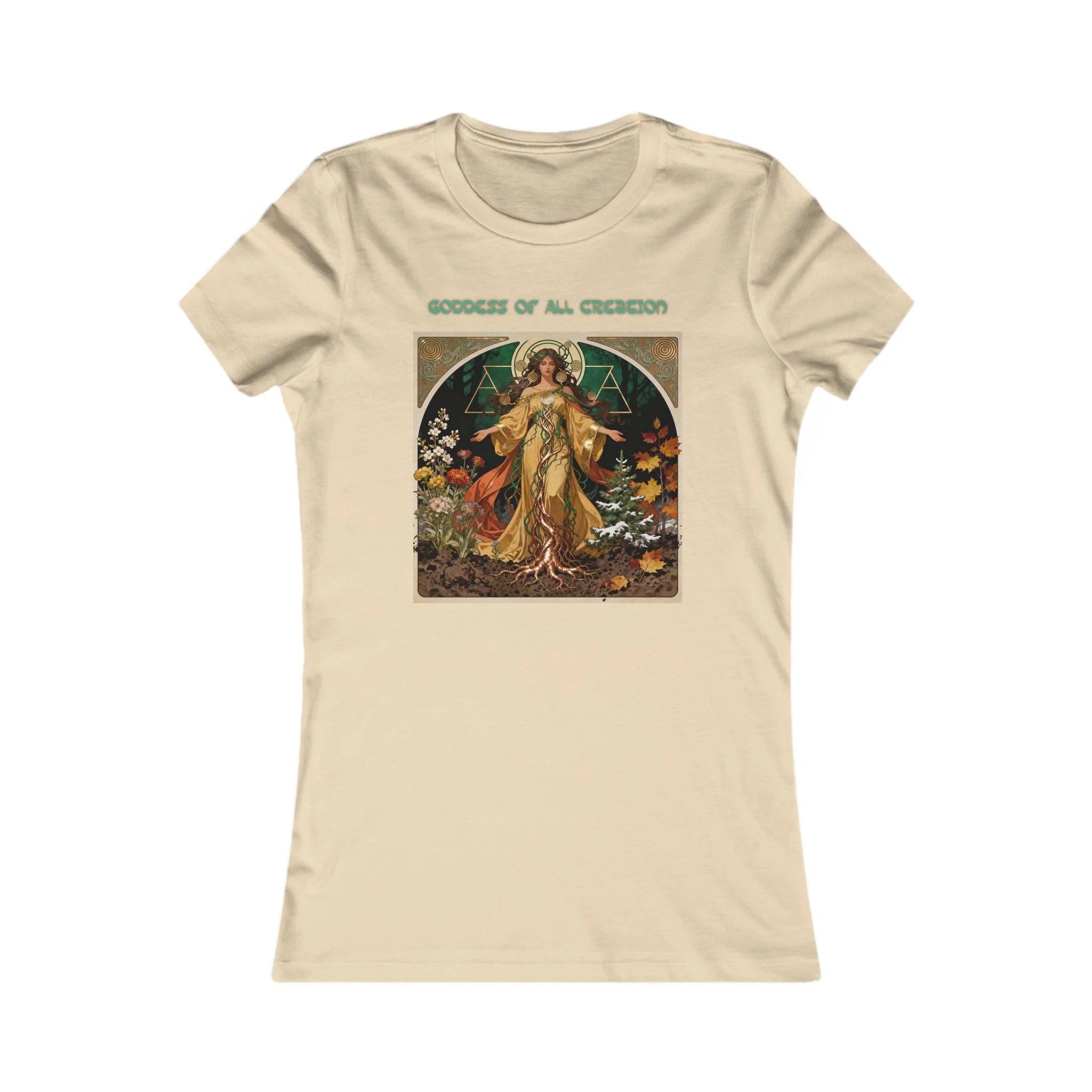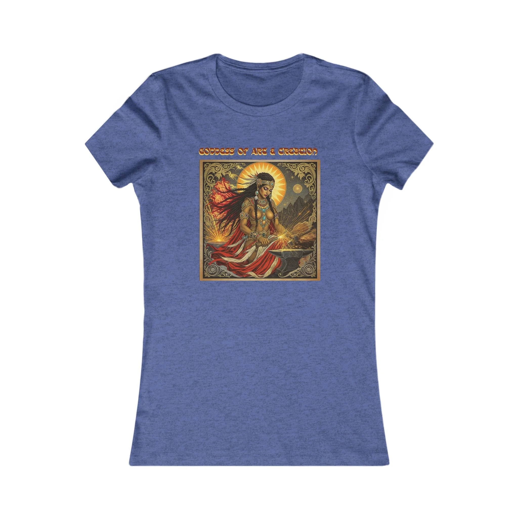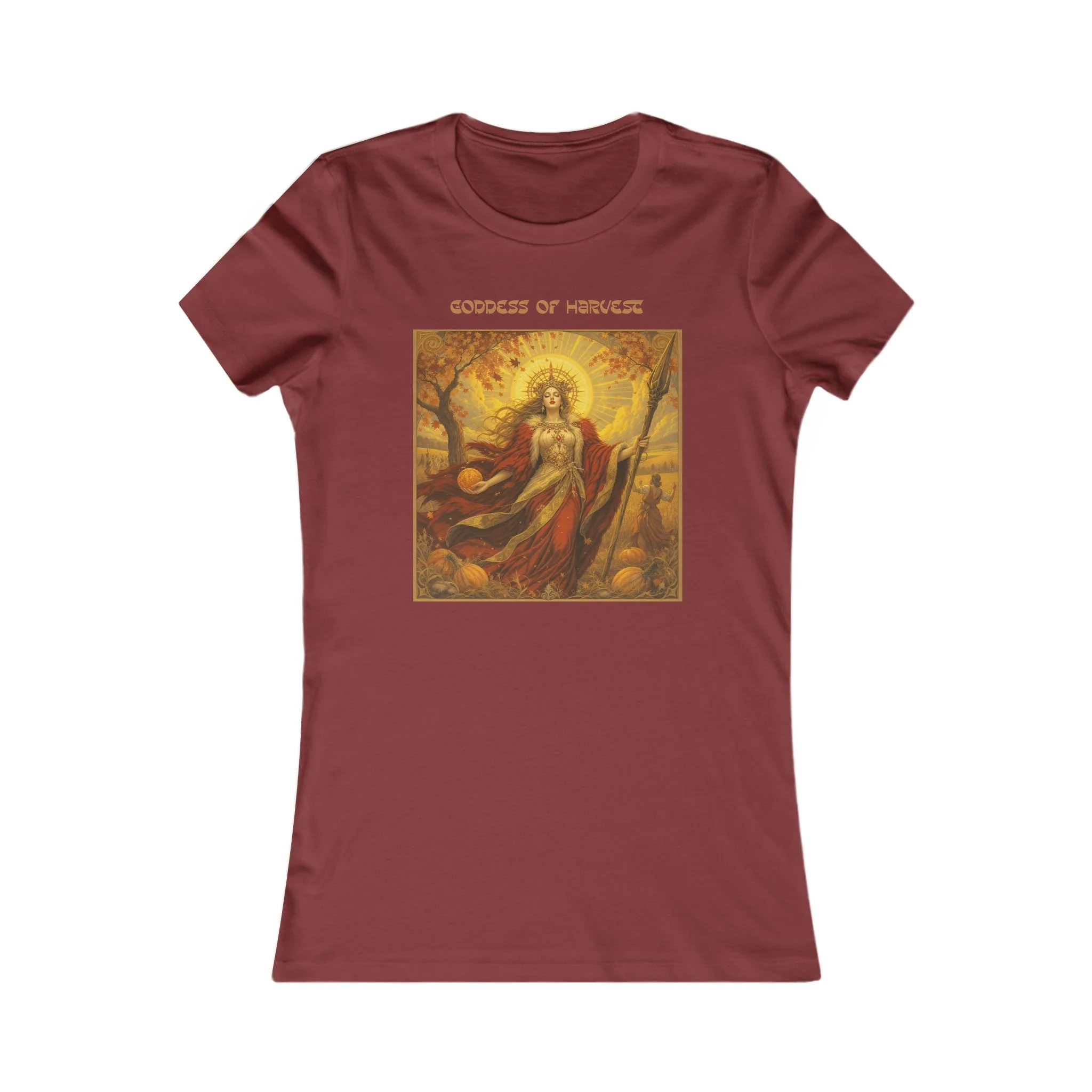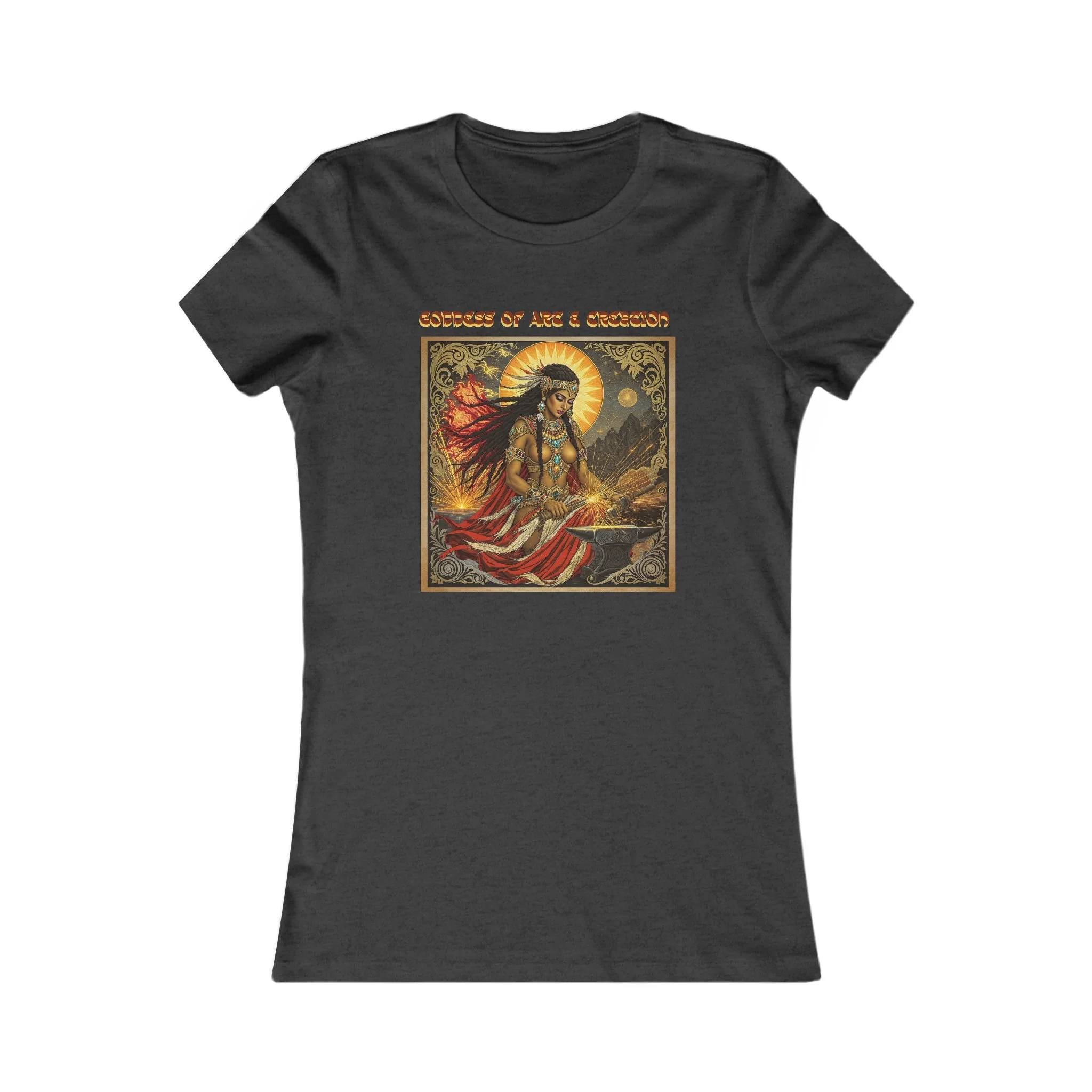 A slim, lightweight tee that feels like a second skin and carries a quiet, mystical presence. The art—an ornate, vintage-inspired goddess illustration framed in warm golds and muted earth tones—lands squarely on the chest, turning the shirt into a wearable talisman. It drapes close to the body without bulk, so the design stays front-and-center whether you’re layering it under a cardigan or wearing it solo. This tee speaks to those who collect soft, thoughtfully made pieces with a story: evenings lit by candles, record-player crackle, and a slow ritual of getting ready. It’s the kind of shirt you reach for when you want to feel grounded and a little enchanted.