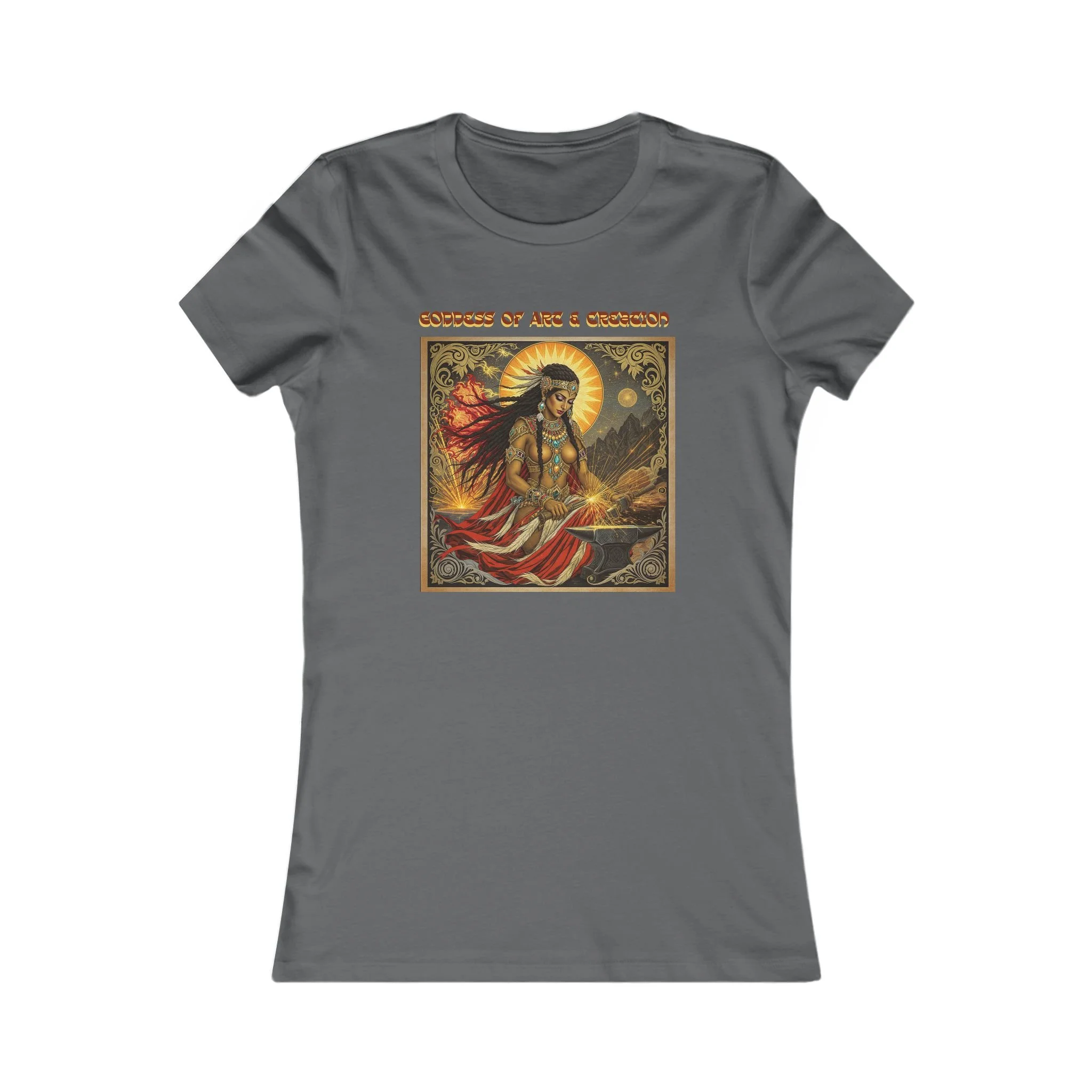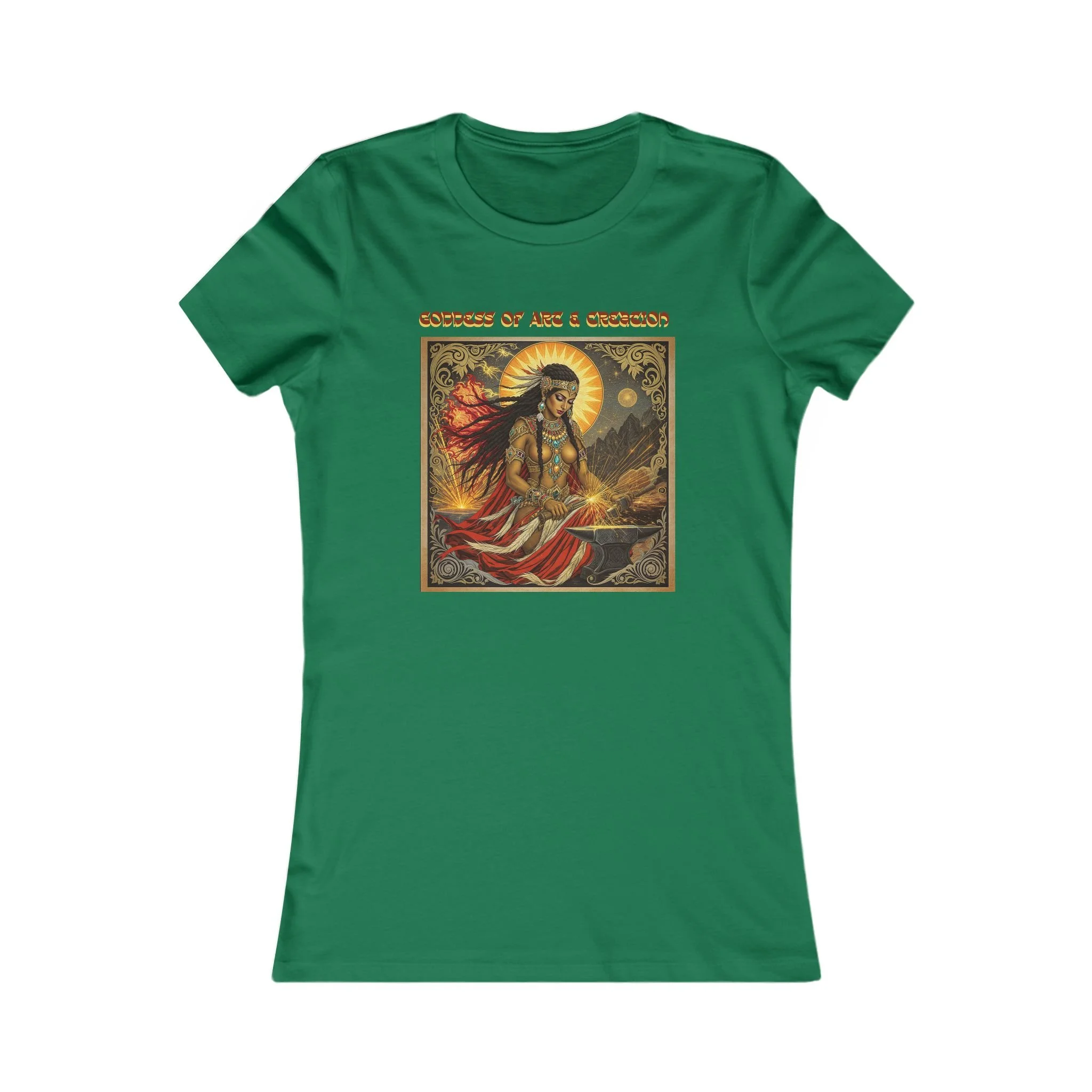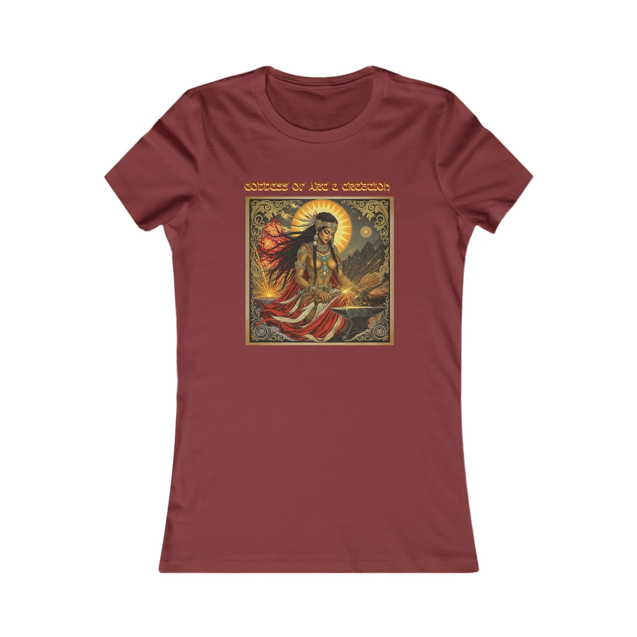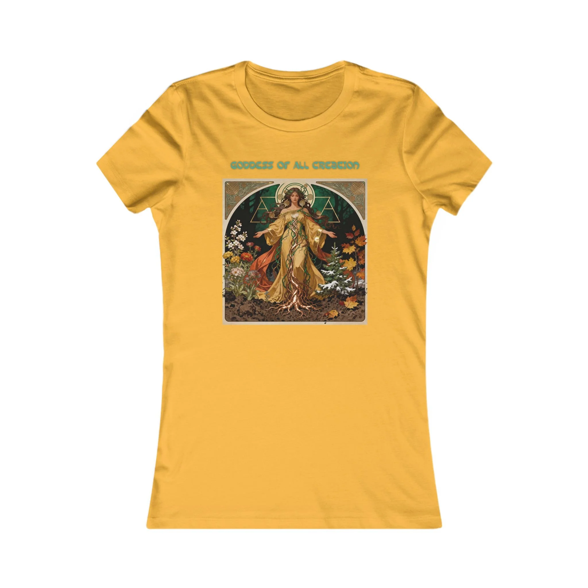 A slim, lightweight tee that feels like a second skin and carries a quiet, mystical presence. The art—an ornate, vintage-inspired goddess illustration framed in warm golds and muted earth tones—lands squarely on the chest, turning the shirt into a wearable talisman. It drapes close to the body without bulk, so the design stays front-and-center whether you’re layering it under a cardigan or wearing it solo. This tee speaks to those who collect soft, thoughtfully made pieces with a story: evenings lit by candles, record-player crackle, and a slow ritual of getting ready. It’s the kind of shirt you reach for when you want to feel grounded and a little enchanted.