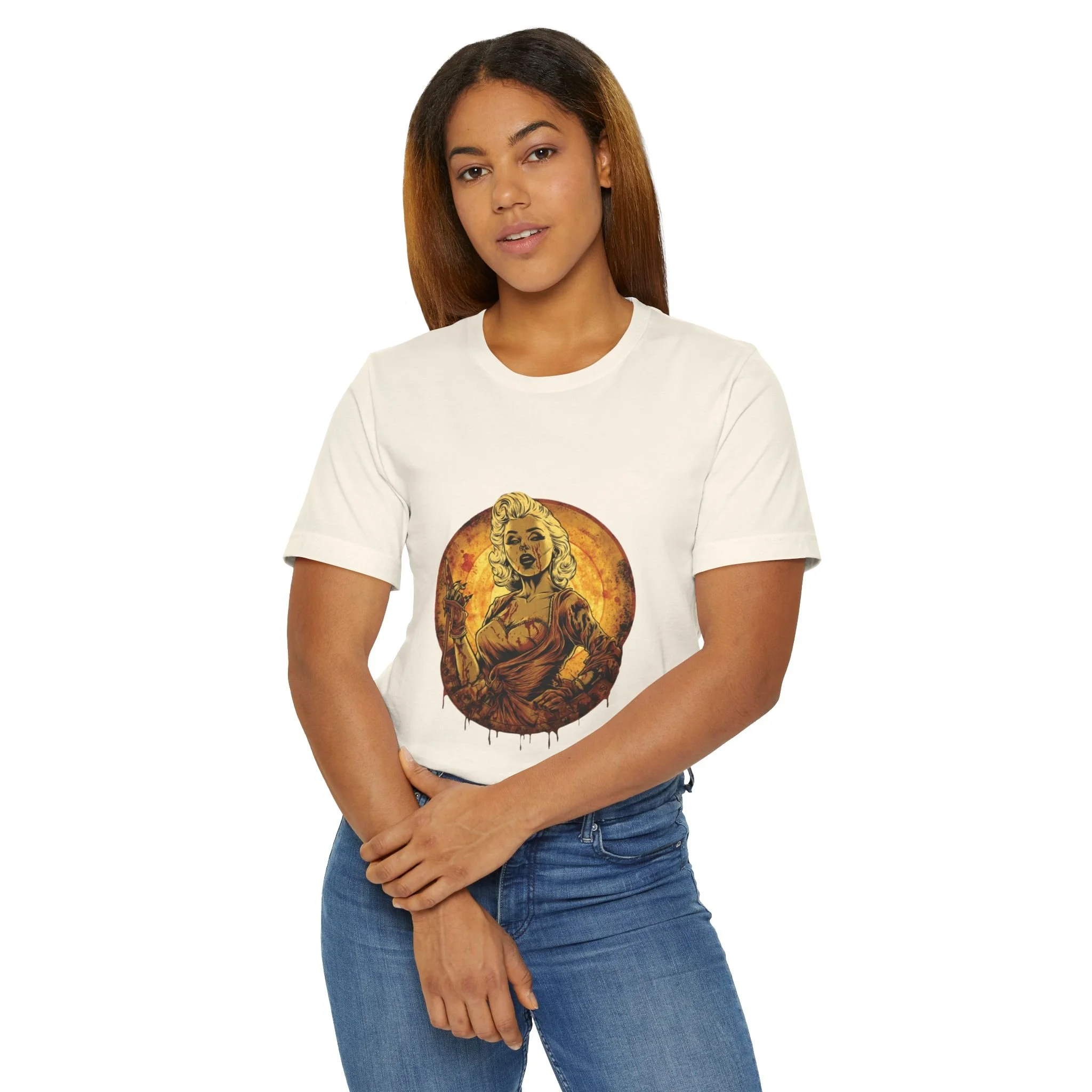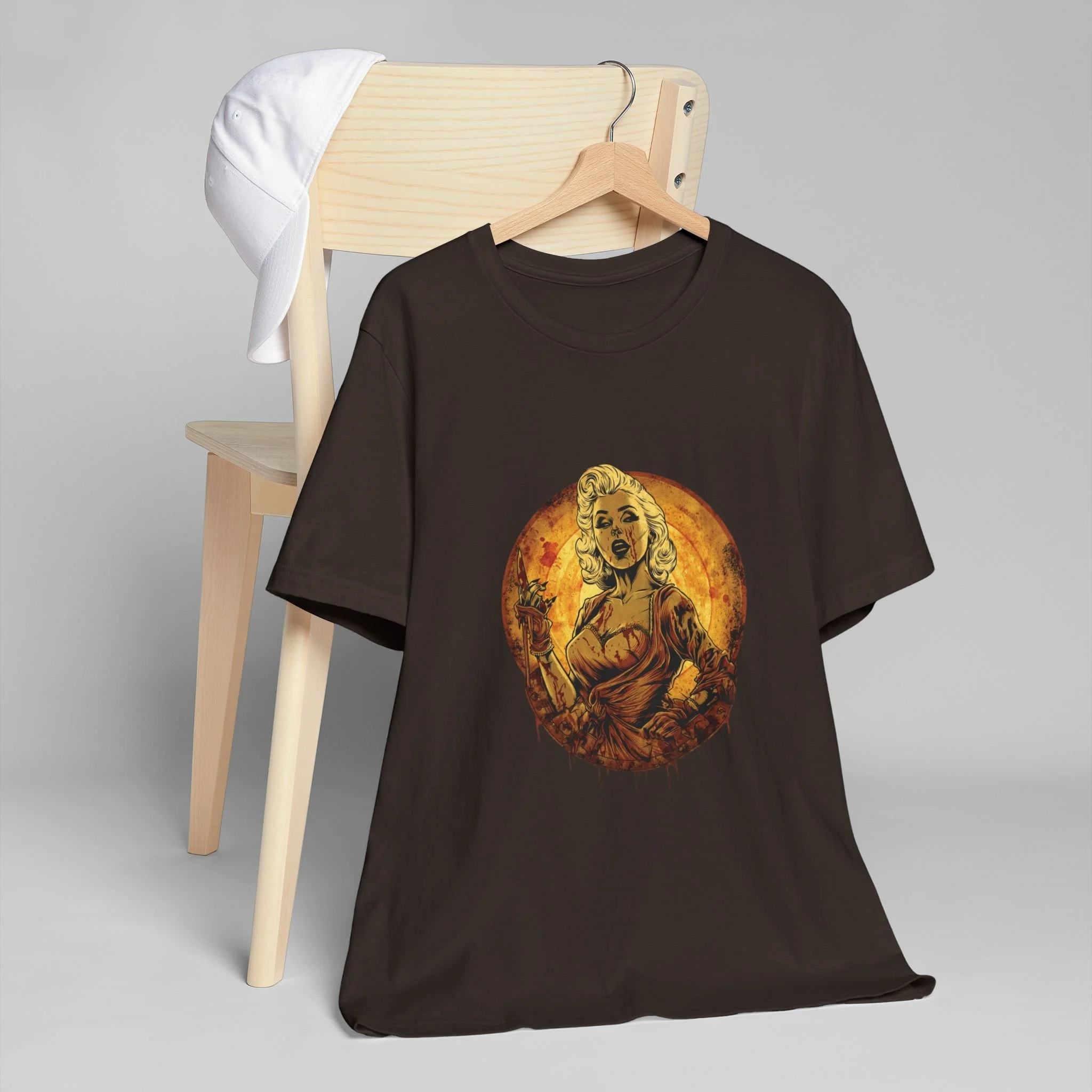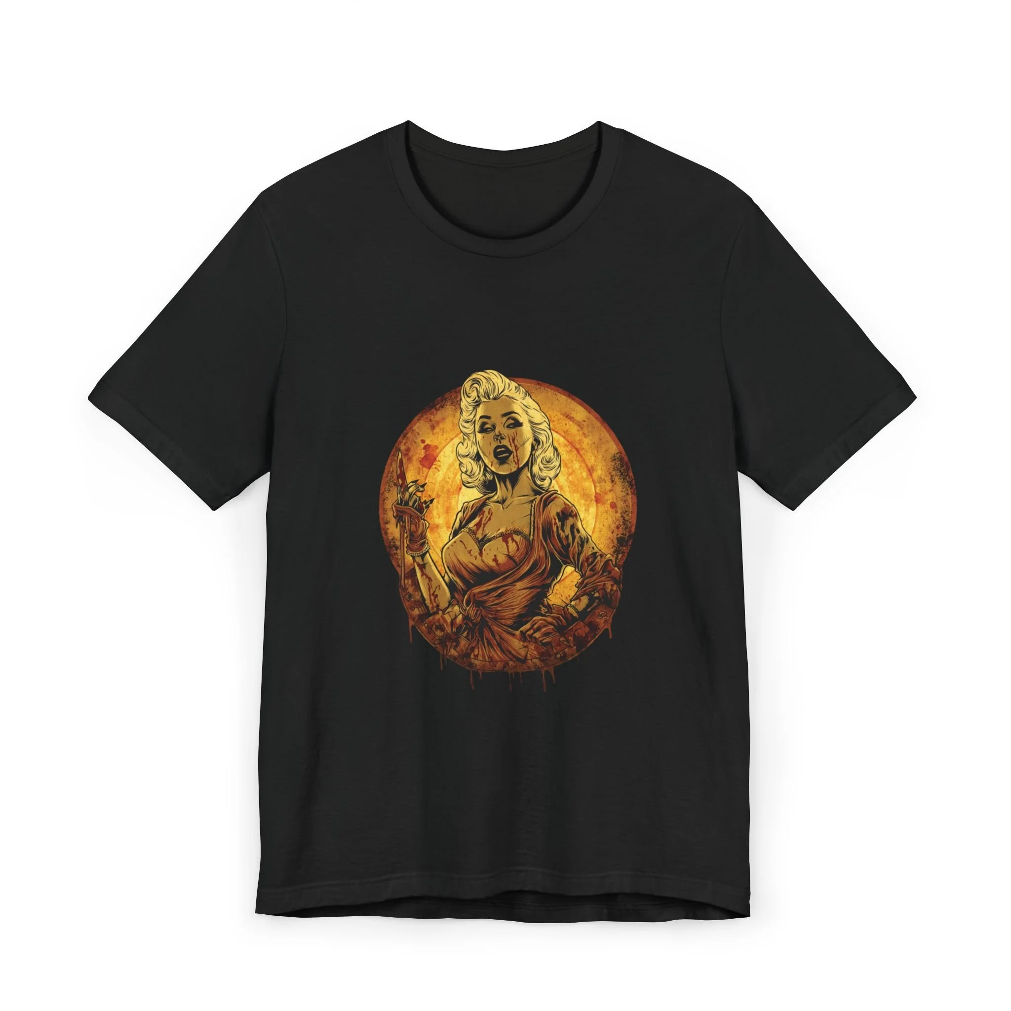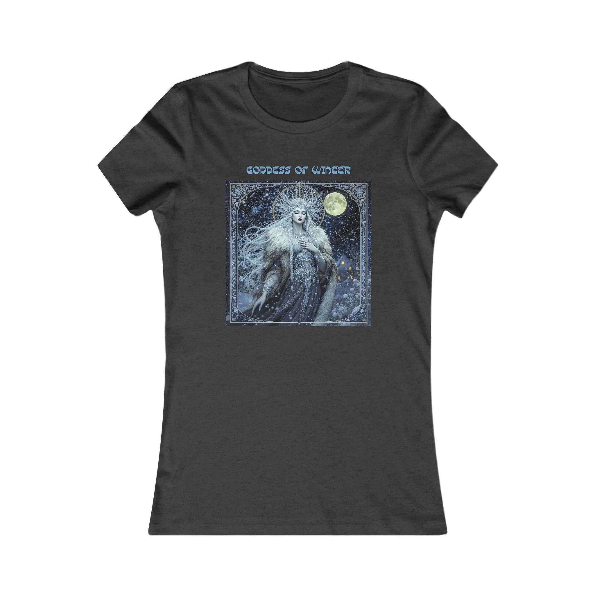 A slim-fit tee that carries the hush of a moonlit winter forest. The artwork shows a pale, ethereal figure framed by falling snow and a full moon — a quiet, gothic elegance that pairs easily with layered jackets or flowing skirts. Lightweight and form-fitting, this shirt becomes a wearable mood: cool nights, candlelit playlists, and slow walks home through frosted streets. Wear it to nights out with friends who appreciate darker aesthetics, to seasonal gatherings, or when you want to lean into a calm, otherworldly vibe.