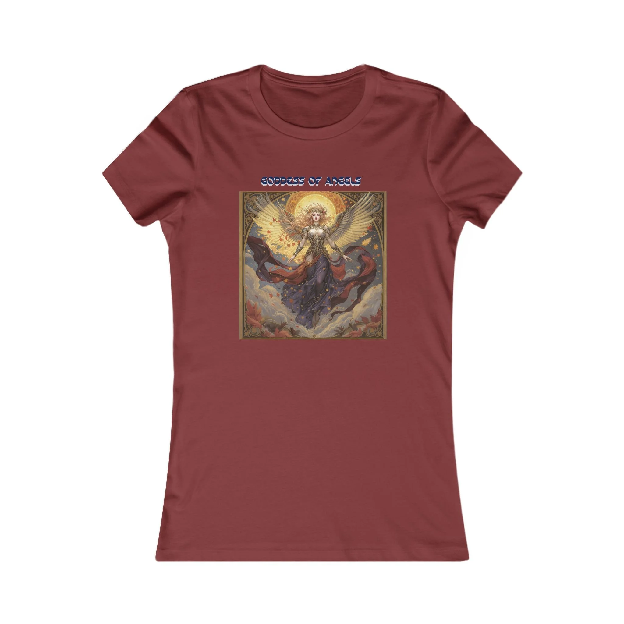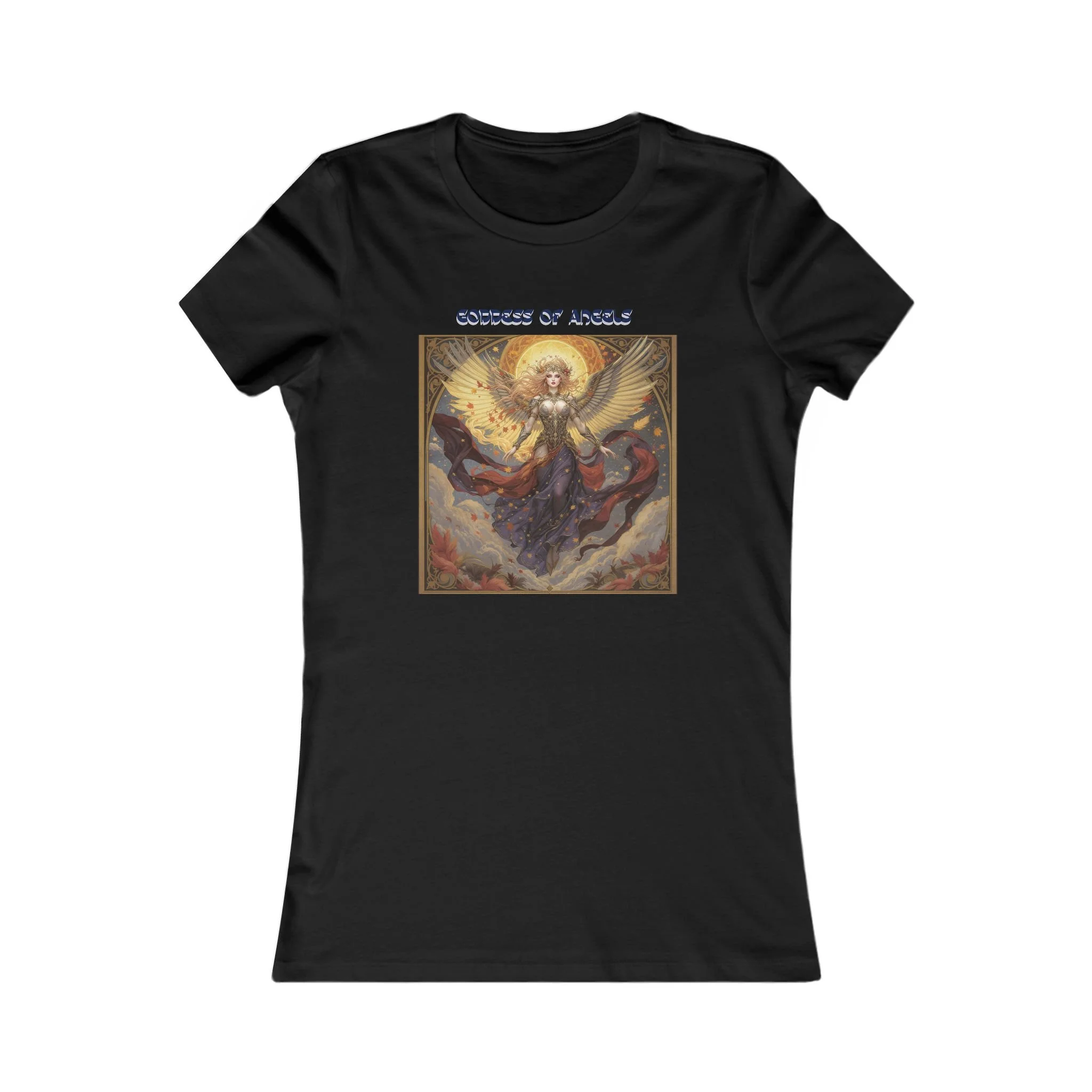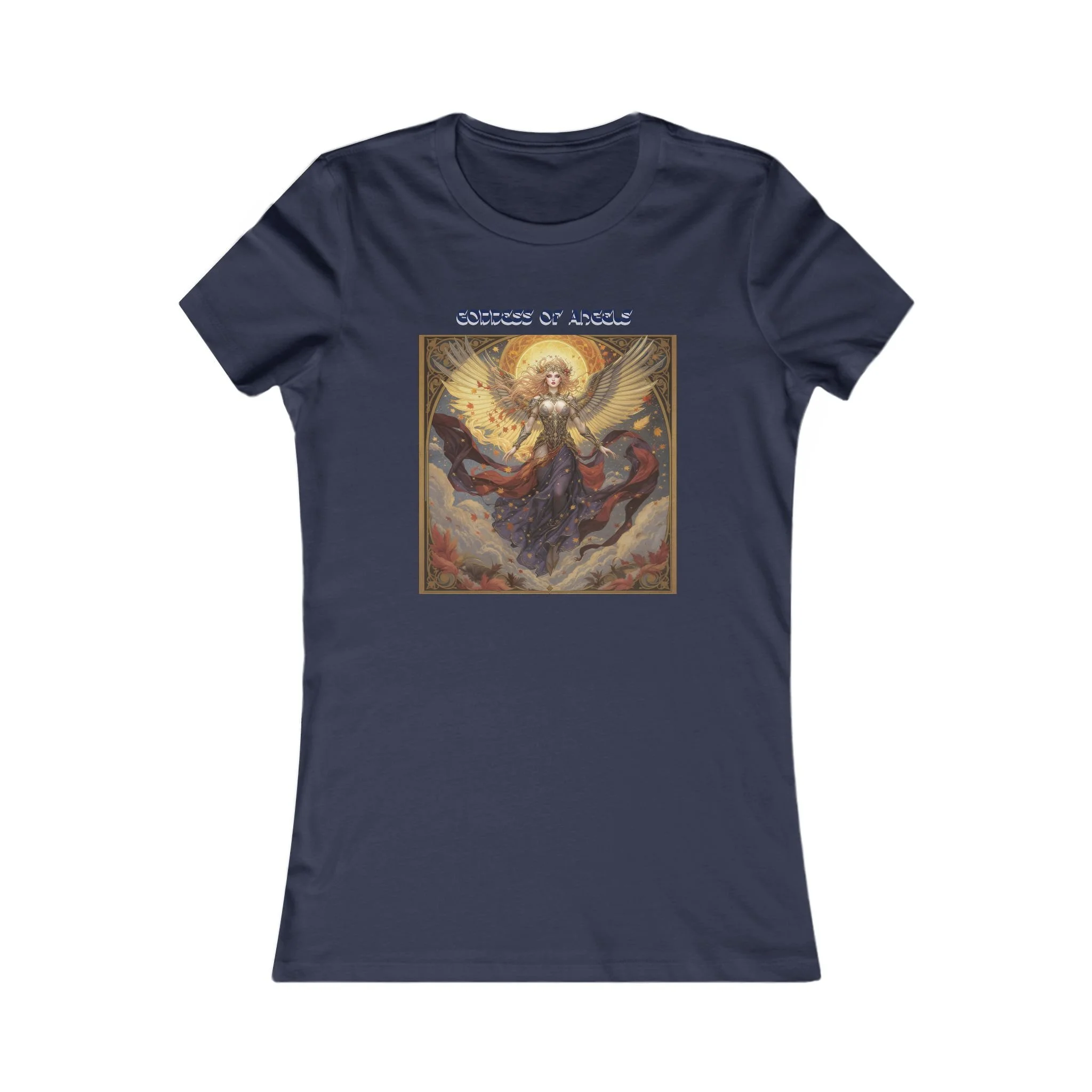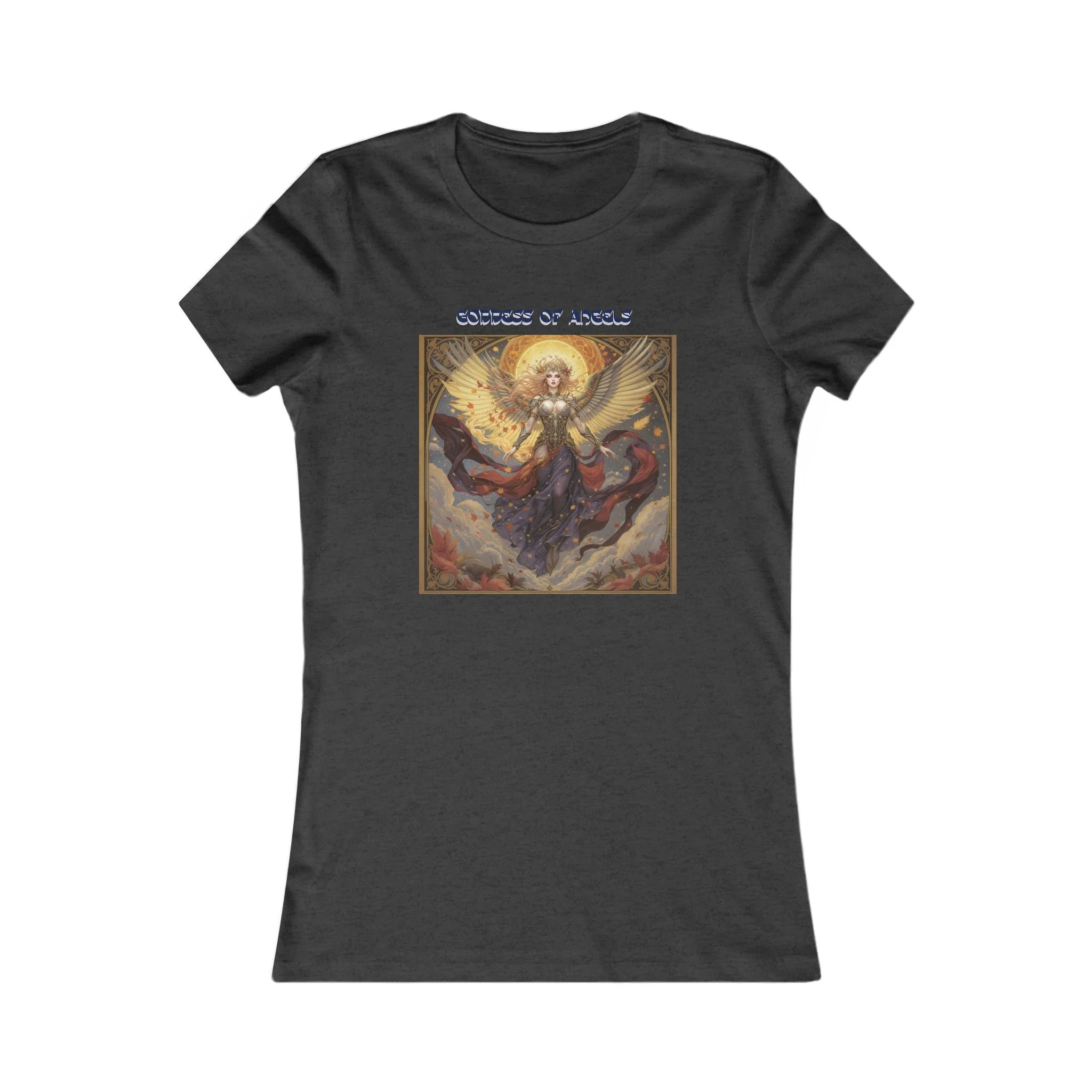 This slim-fit tee carries an old-world, mythic illustration at its heart — a radiant winged figure framed by clouds and twilight, with subtle lettering above. Lightweight and soft to the touch, it sits closer to the body and falls a bit longer, creating a flattering silhouette under jackets or worn alone. The dark background lets the warm golds and muted reds of the artwork glow, giving the shirt a wearable piece-of-art vibe. It’s for someone who prefers clothing that feels personal and quietly expressive — a t-shirt that reads like a favorite album cover or an art print you can move in.