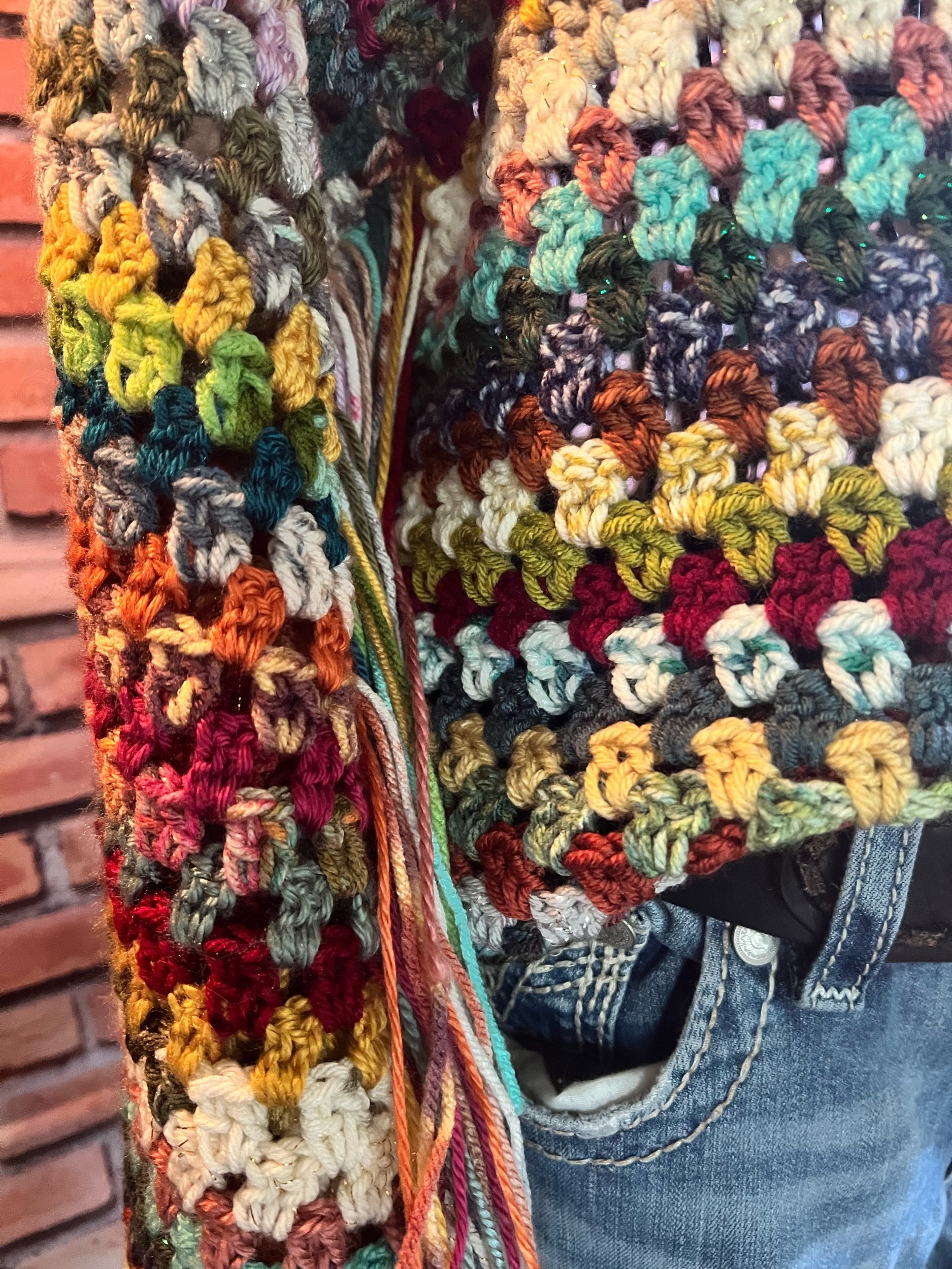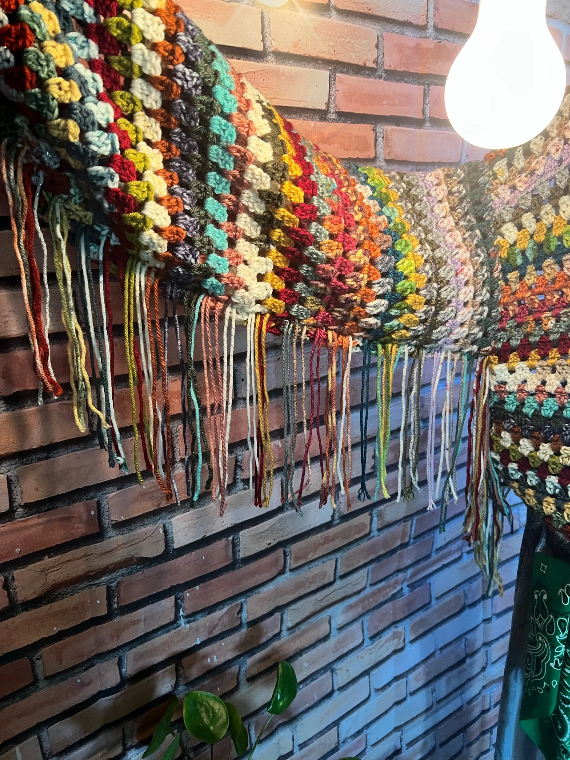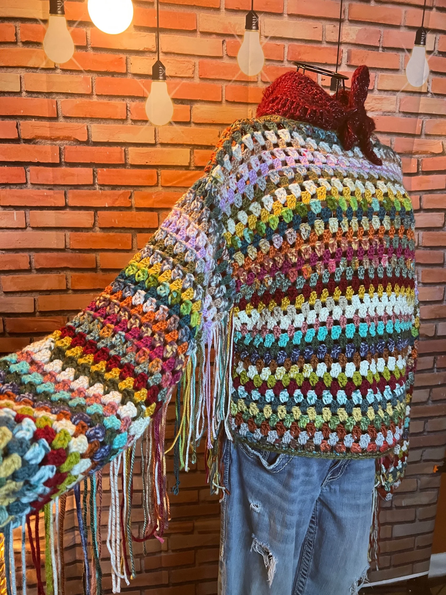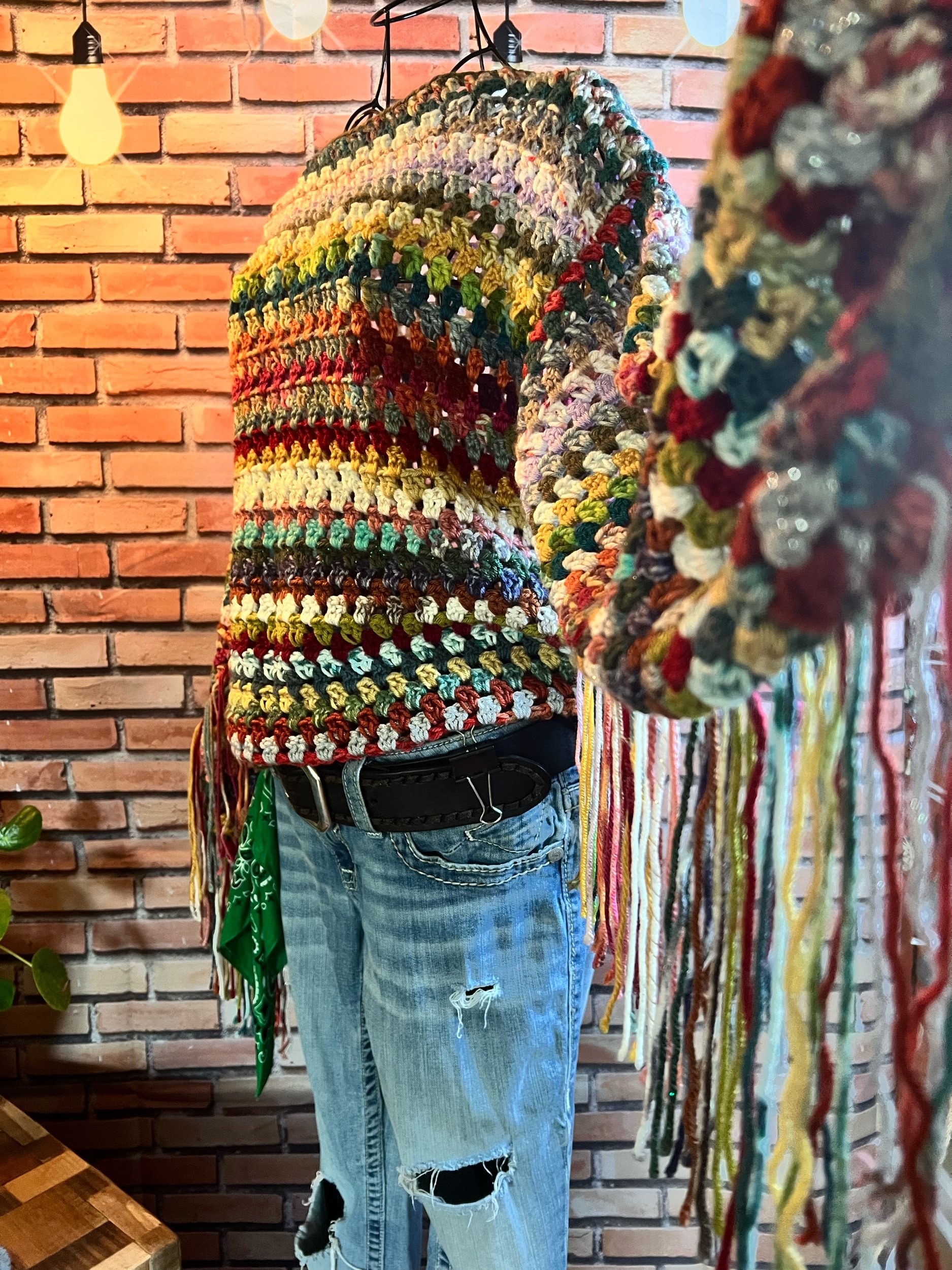 Hand-crocheted heavyweight sweater loaded with fringe attitude. Every stitch is its own rebellion—thick, textured, and unapologetically colorful. Made start-to-finish by hand, one of one.