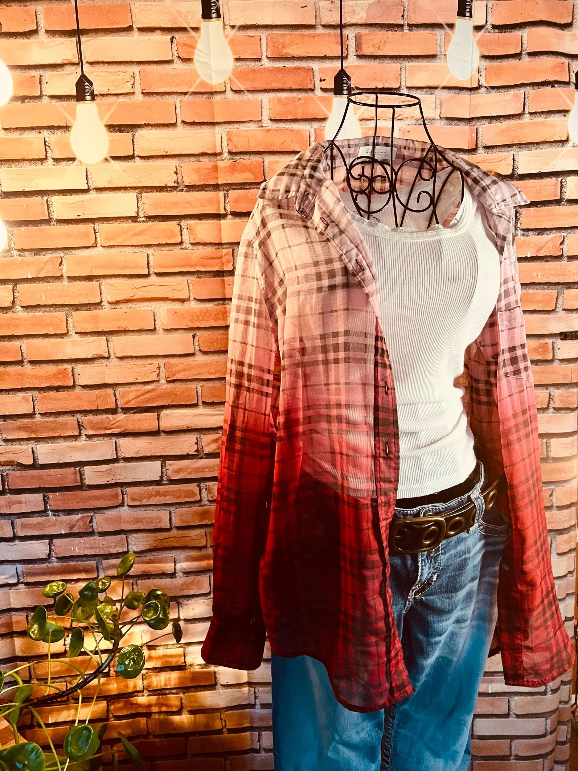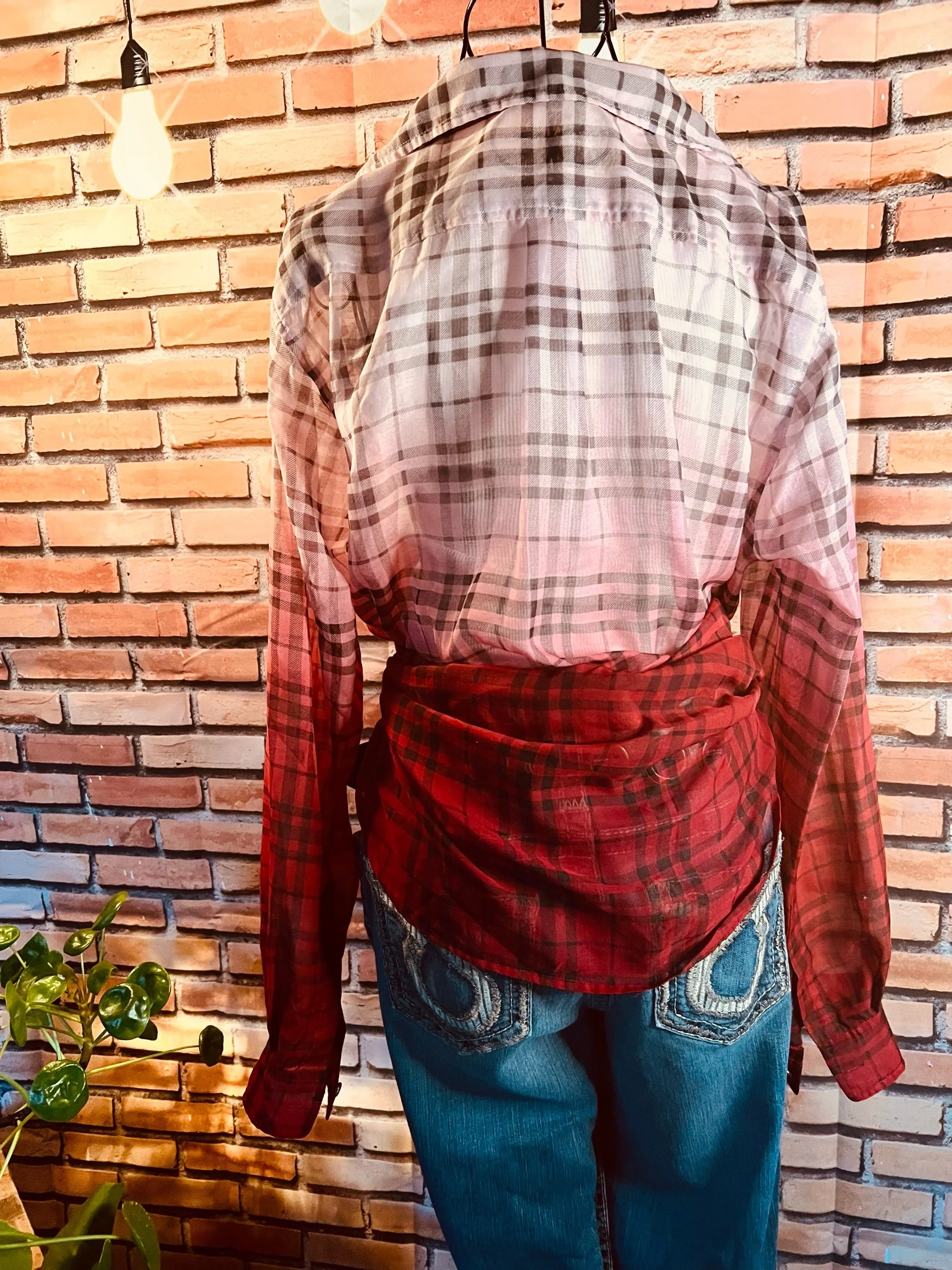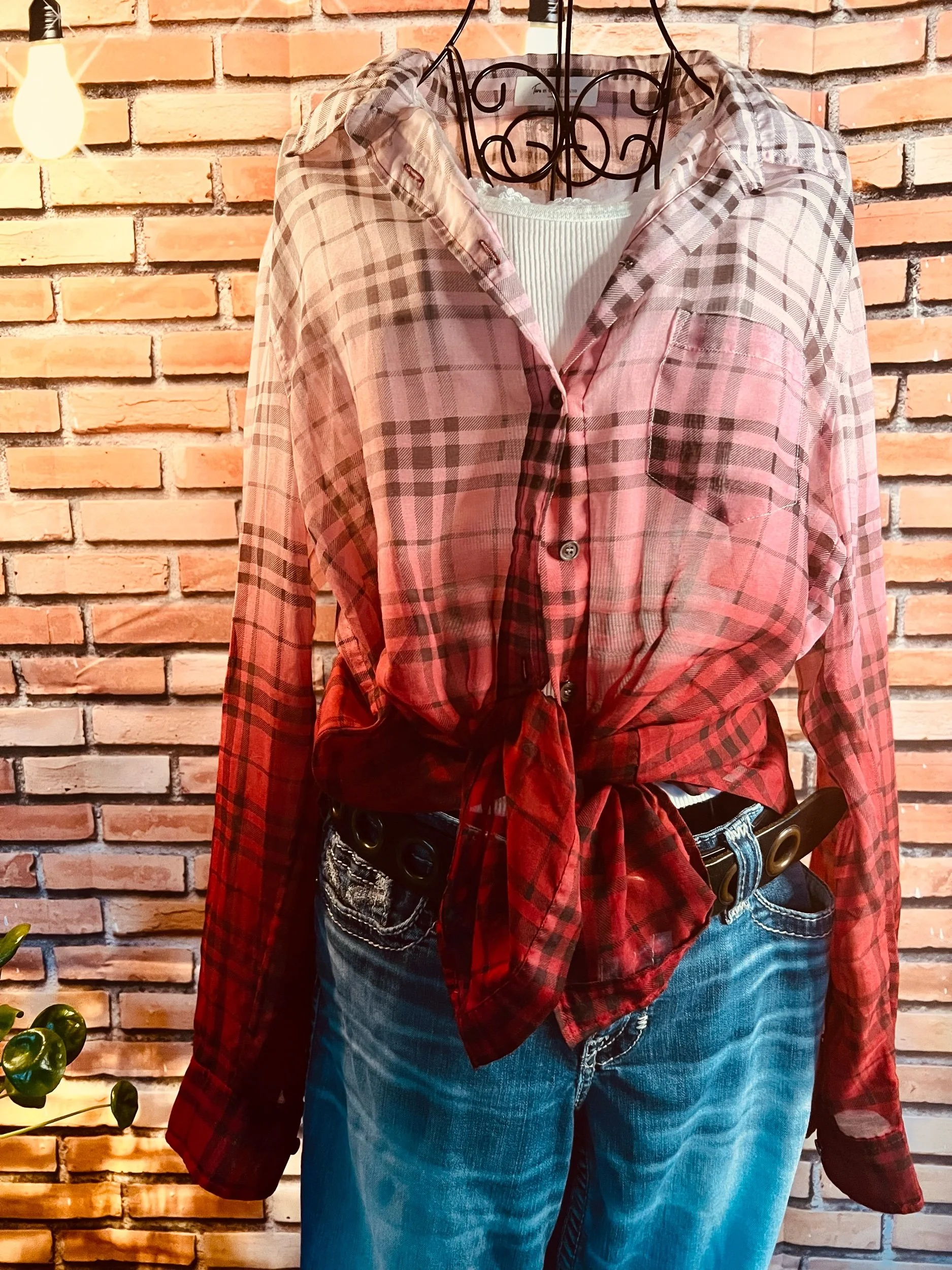 Not your average plaid—this one starts out fiery raspberry red and fades into a soft blush pink. Perfectly lightweight for layering, it still brings attitude when tied at the waist or thrown over a black turtleneck.