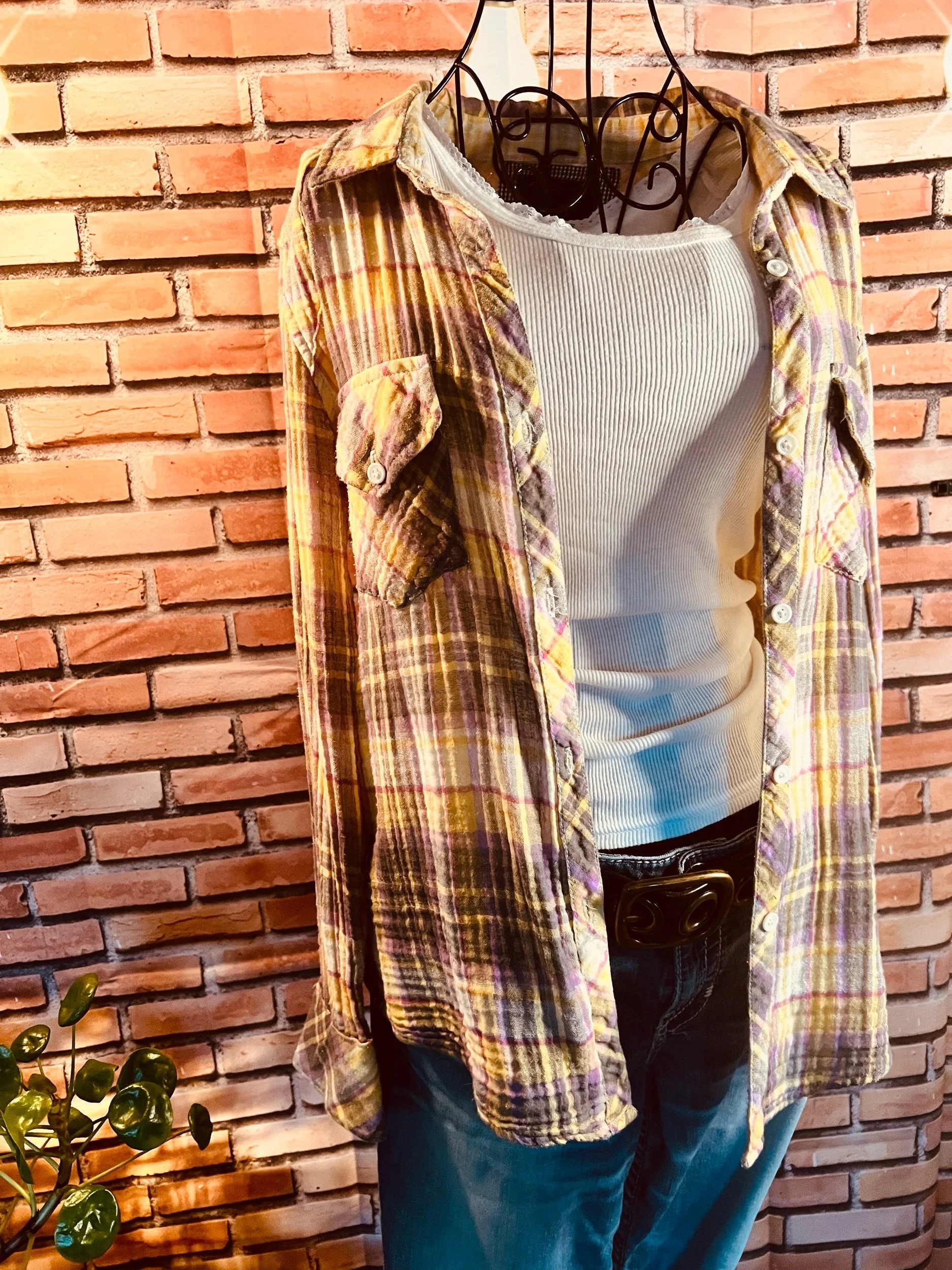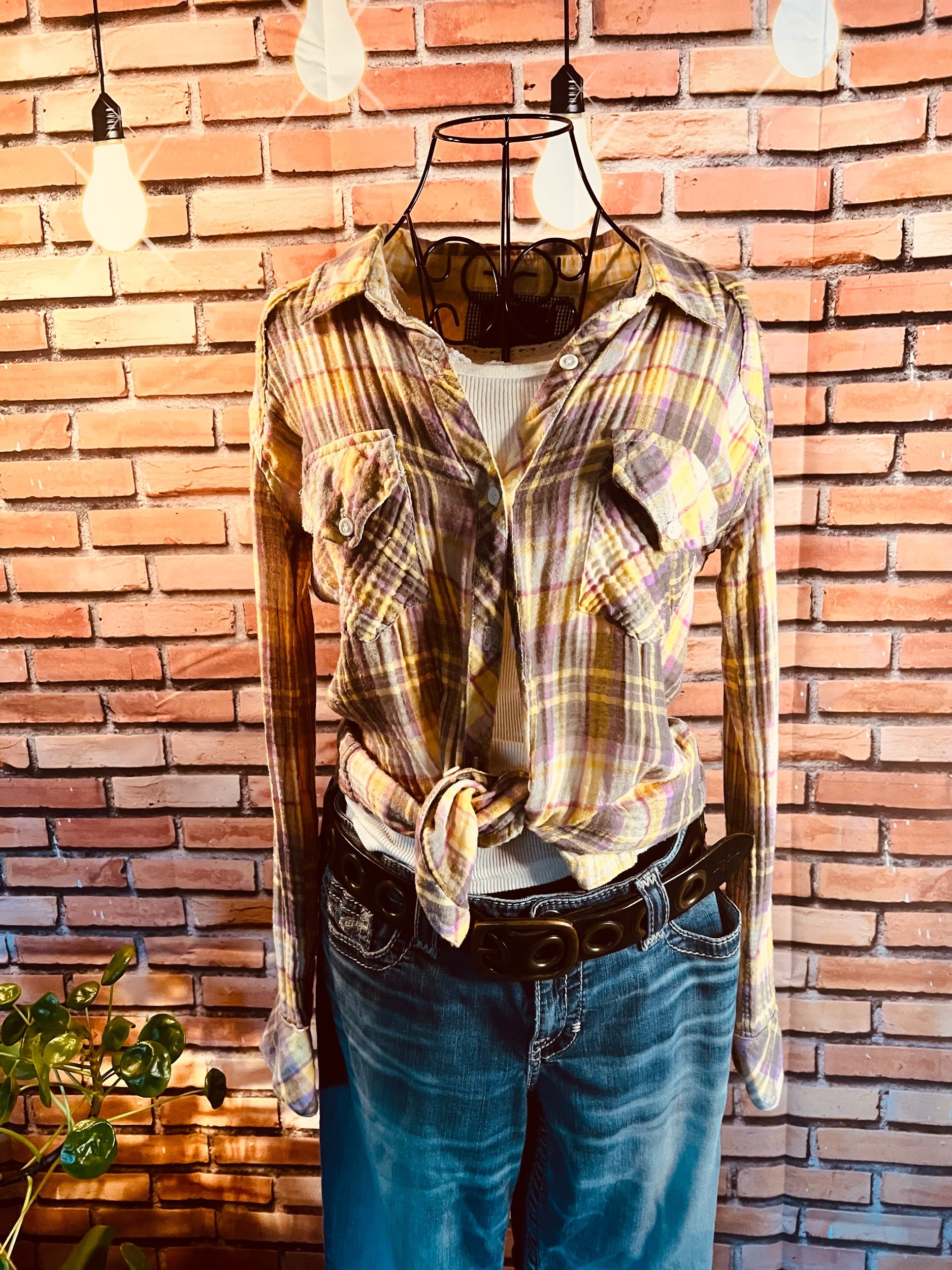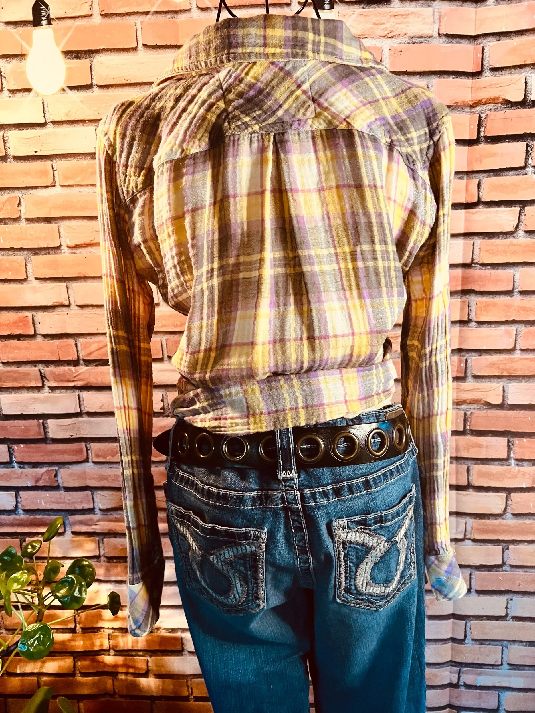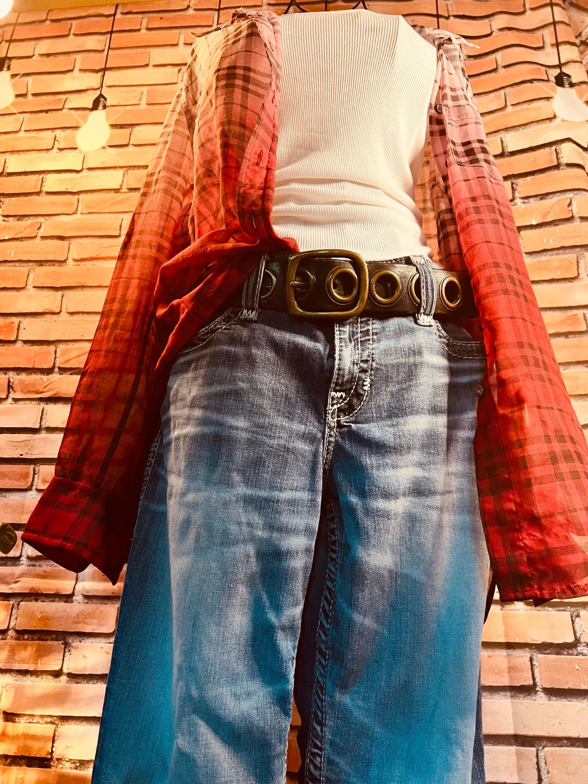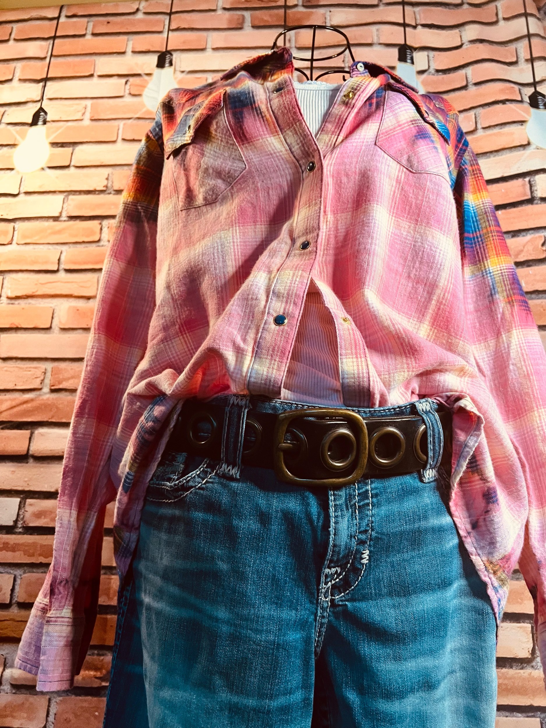 The “borrowed-from-him” look—except it’s actually yours. Soft red plaid, pearl snaps, and that broken-in comfort that says “I ride my own horse, thanks.” Does the curves some gooood!