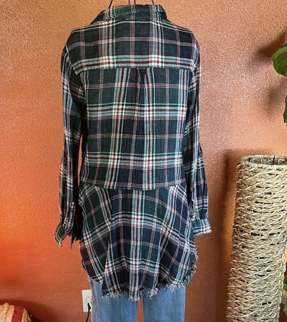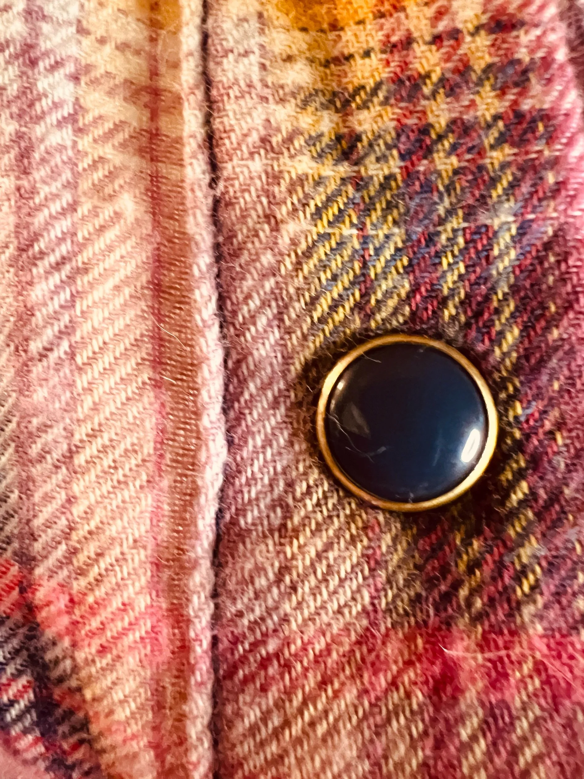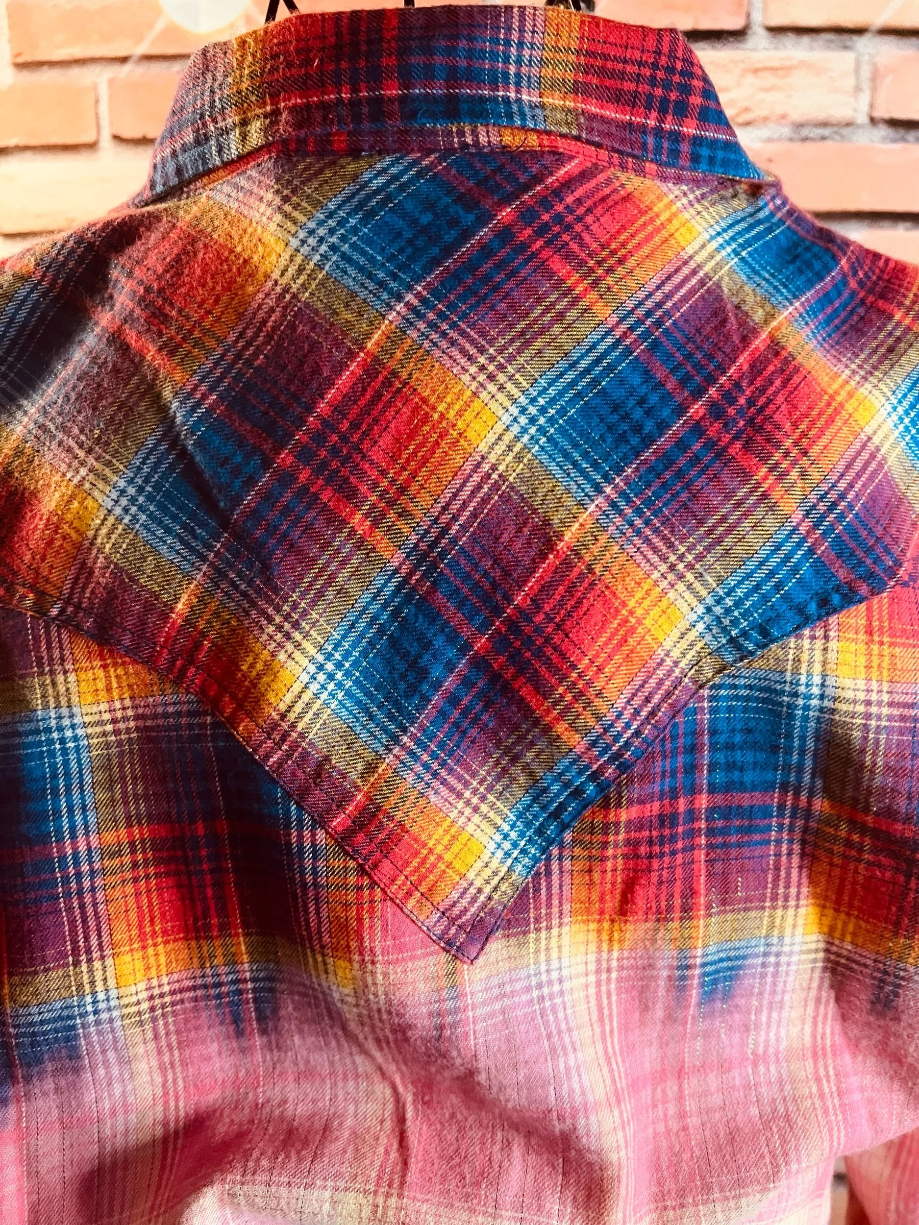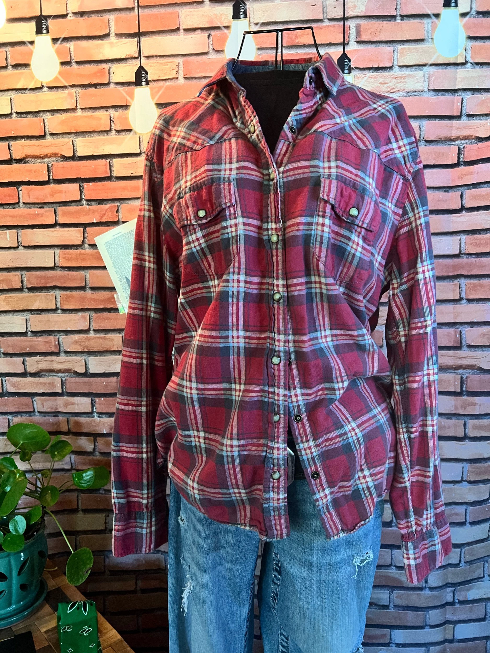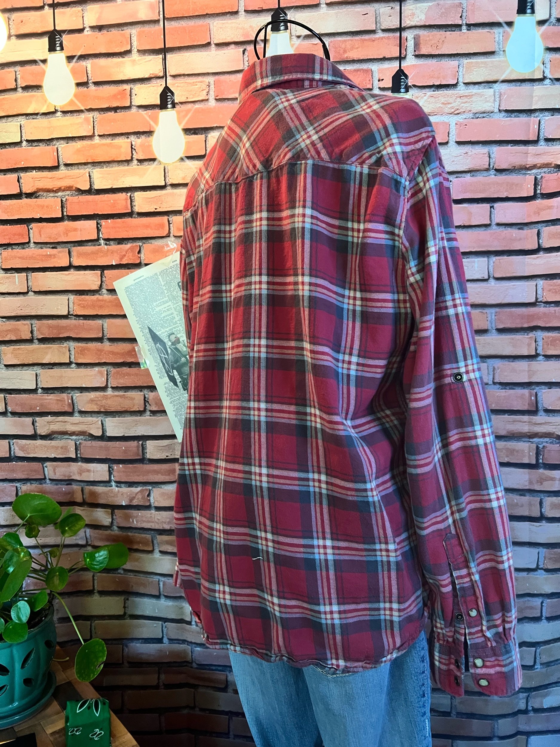 Color: Muted plaid in red, navy, and tan (vintage wash)