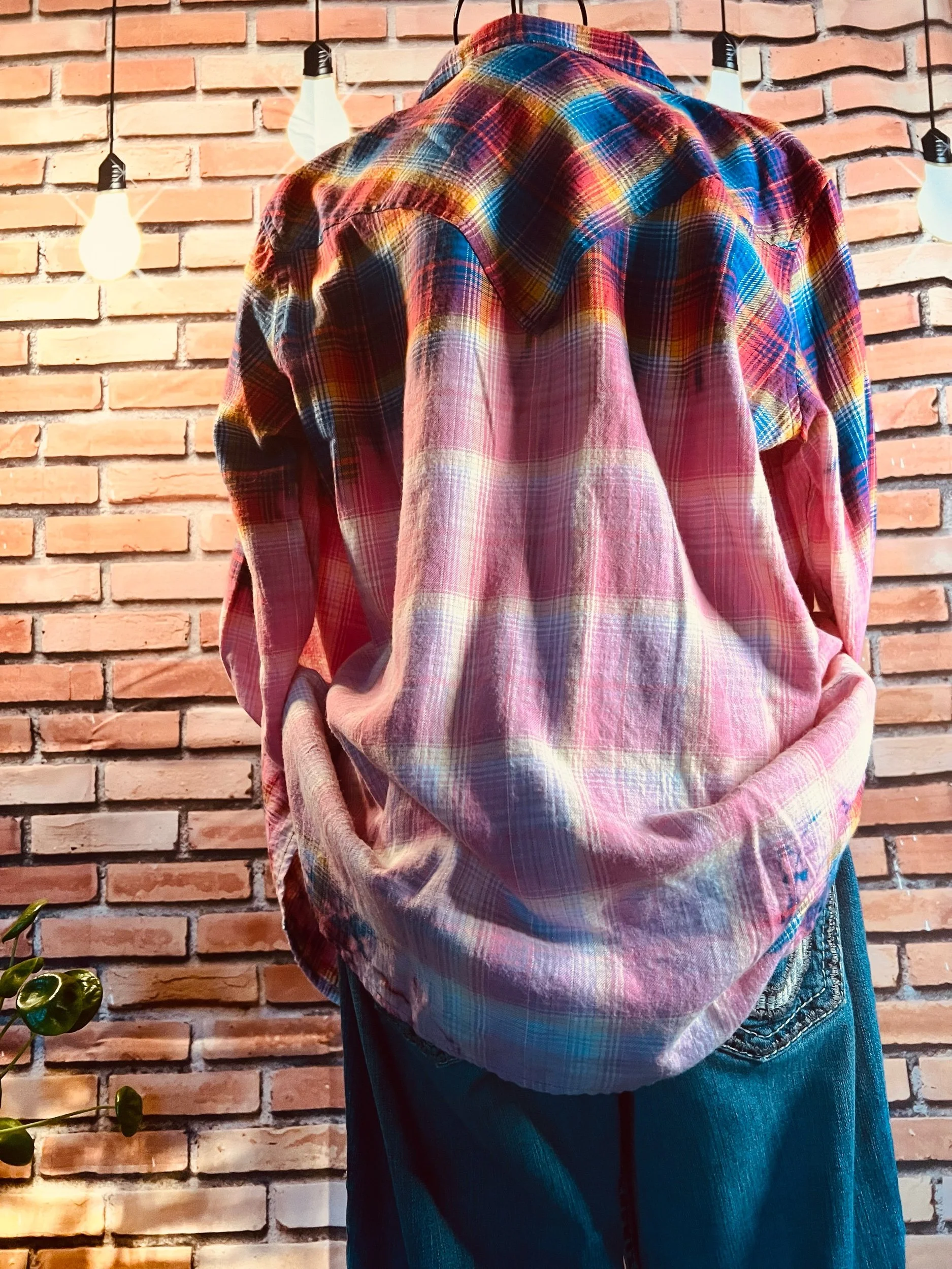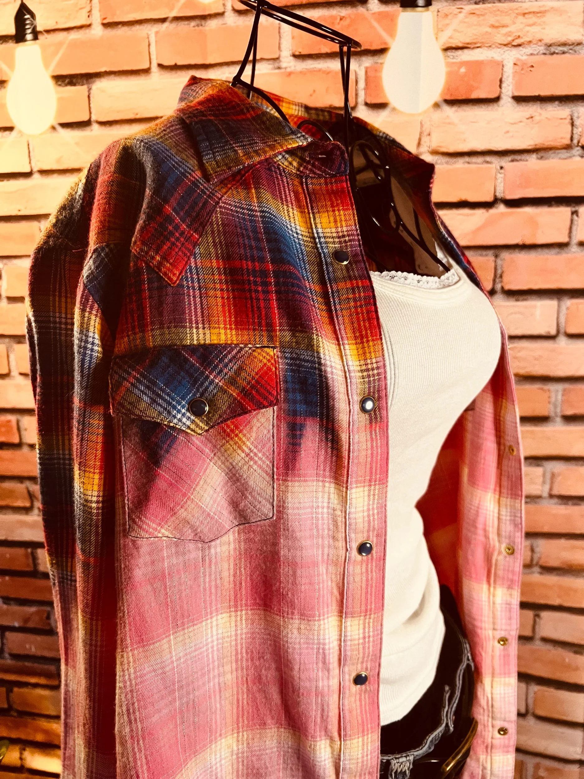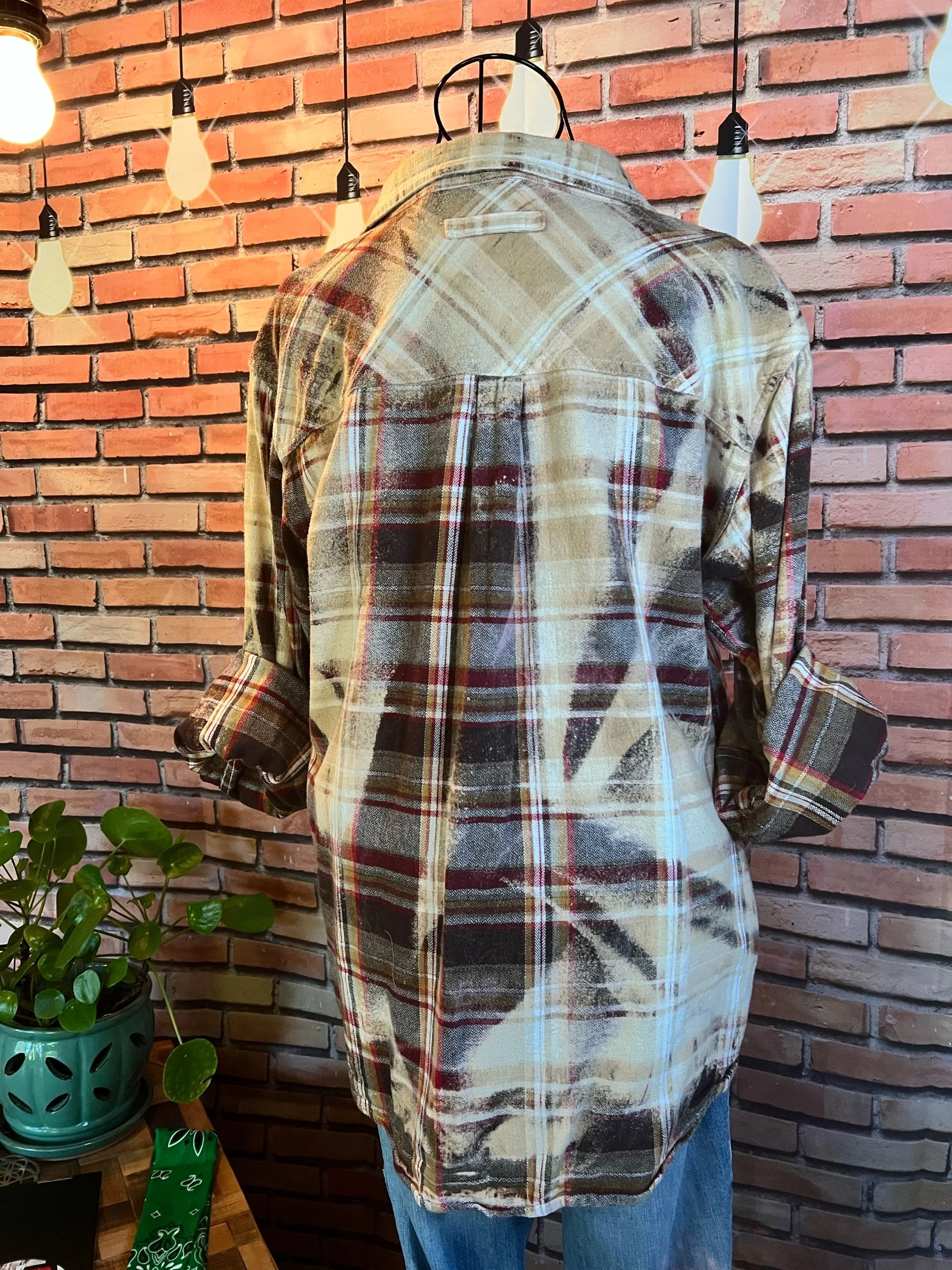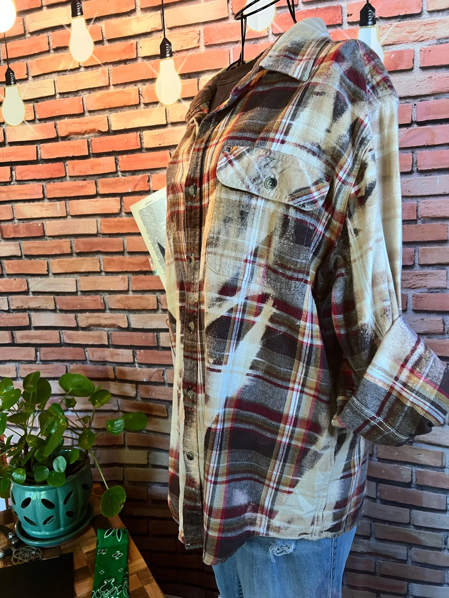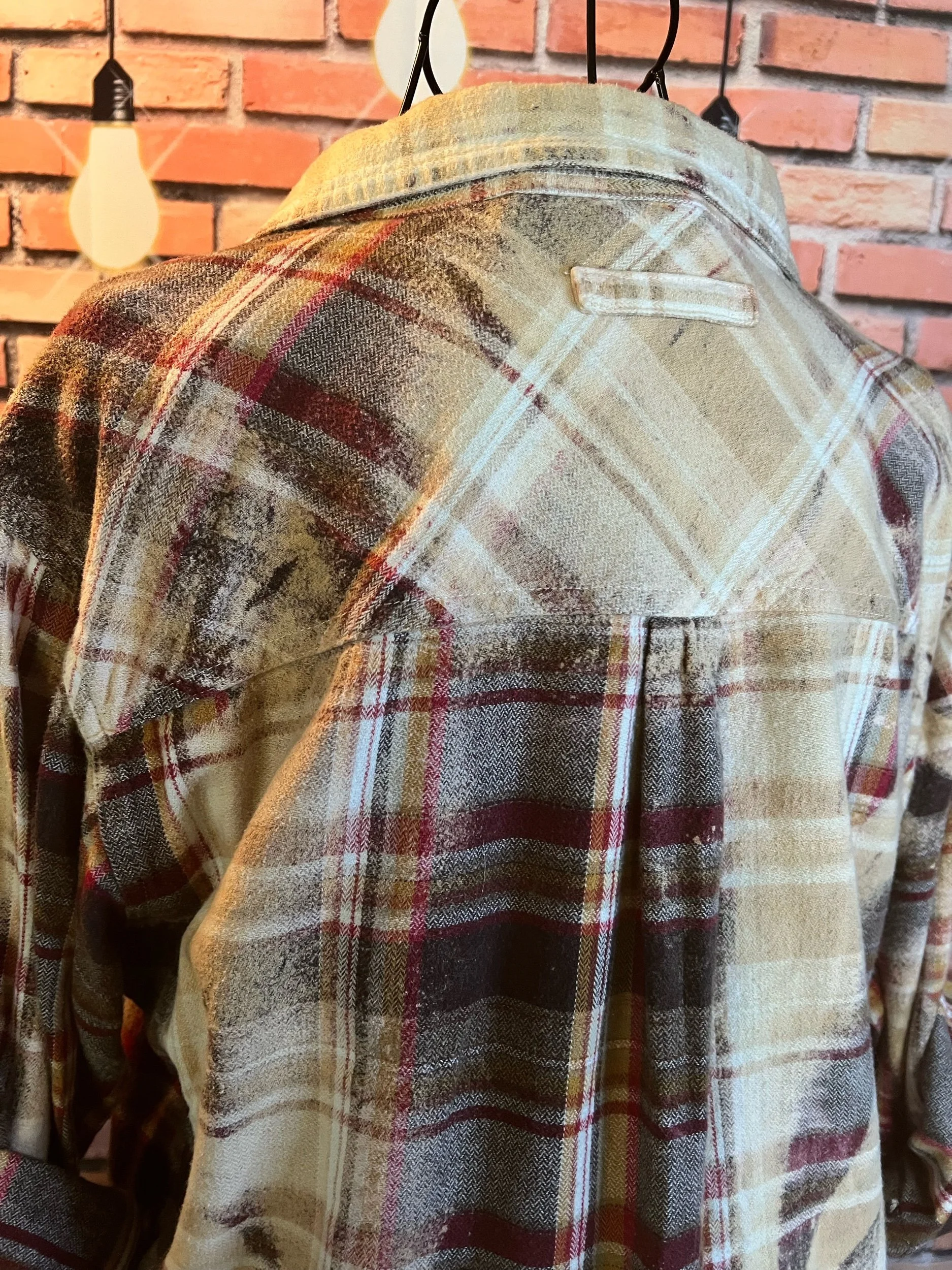 Color: Maroon, tan, and cream plaid with acid-washed fade