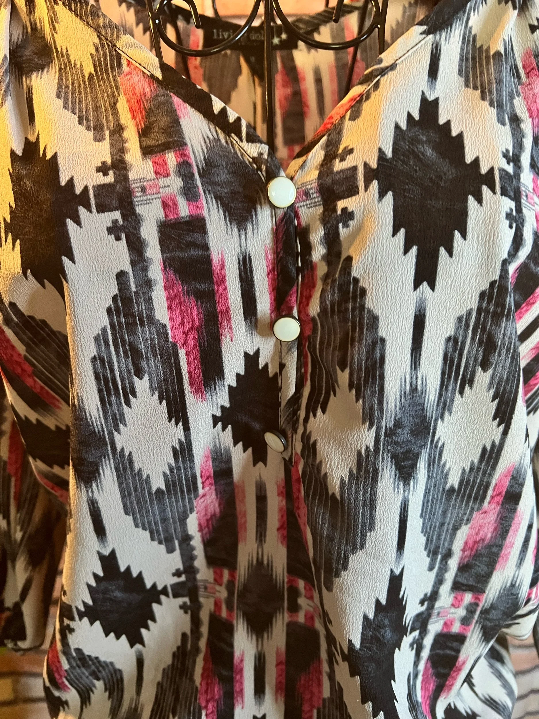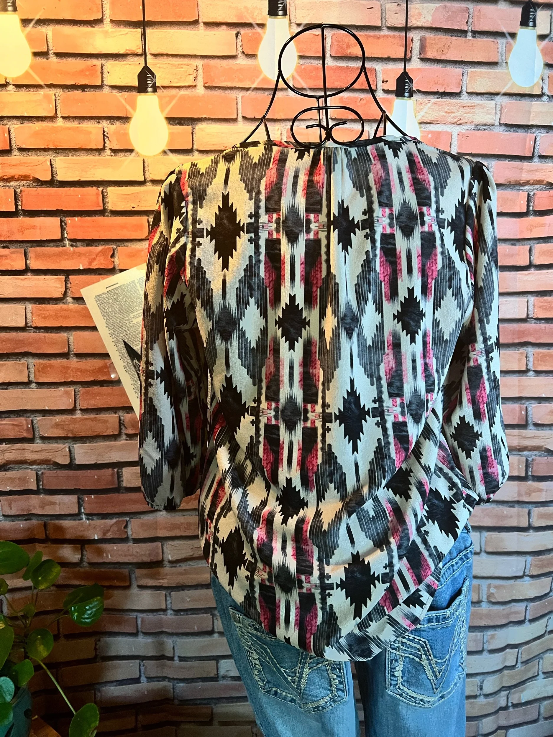 Proof that geometry and chaos can get along just fine. This silky lightweight blouse has a bold Aztec-inspired pattern in black, taupe, and deep raspberry with shell buttons that say I accessorize naturally. Perfect for jeans, leather, or full-on desert outlaw vibes.