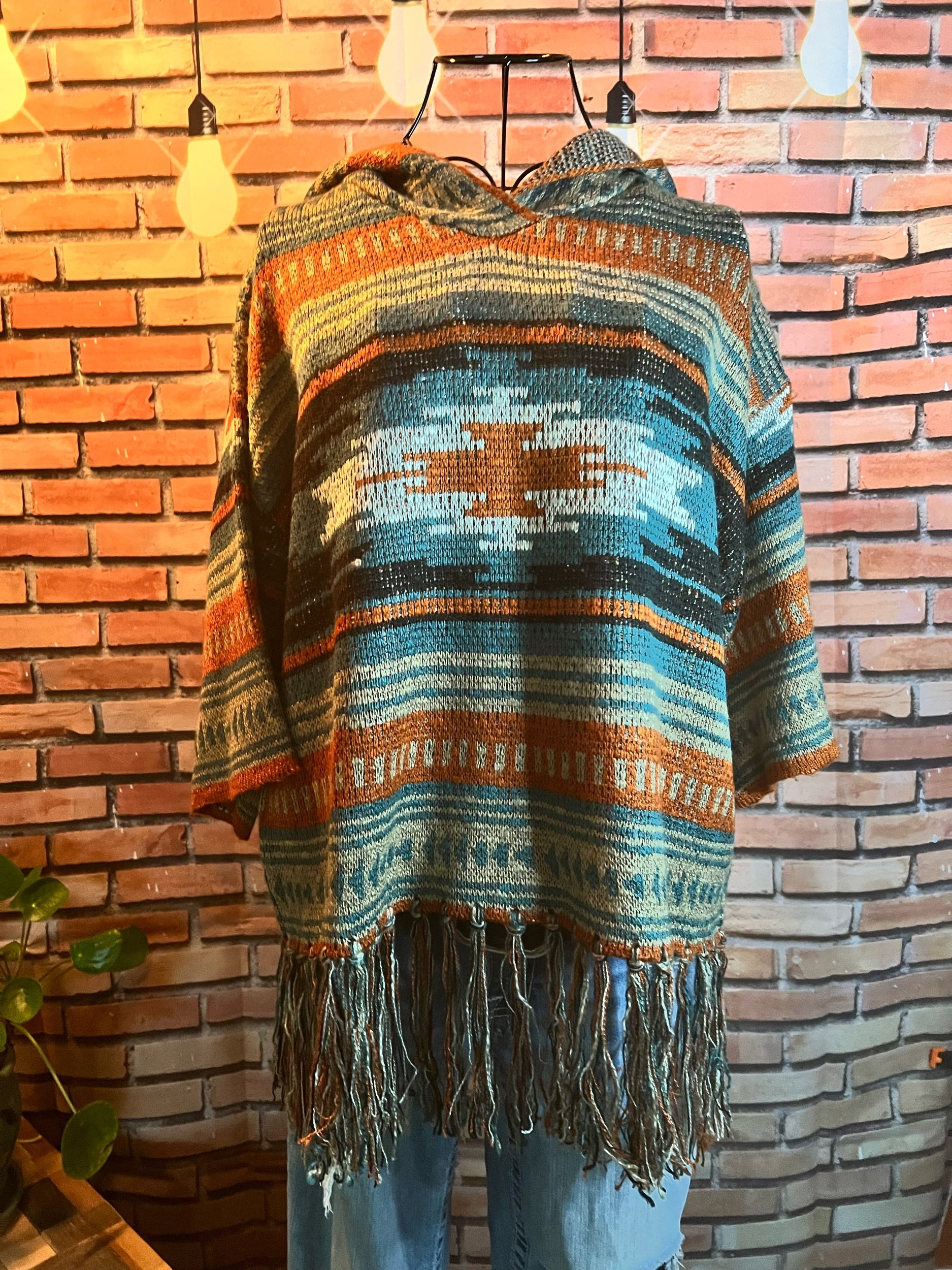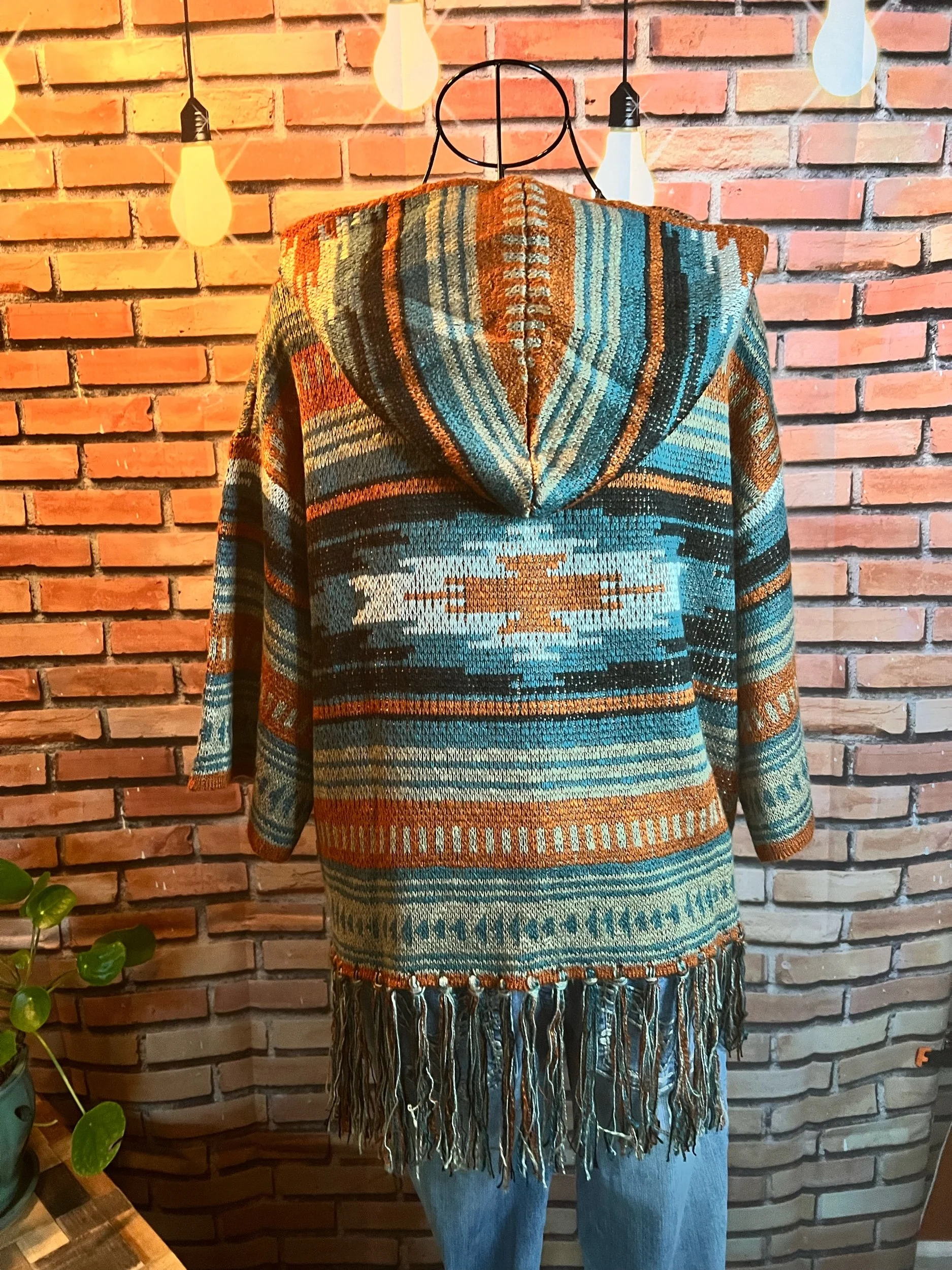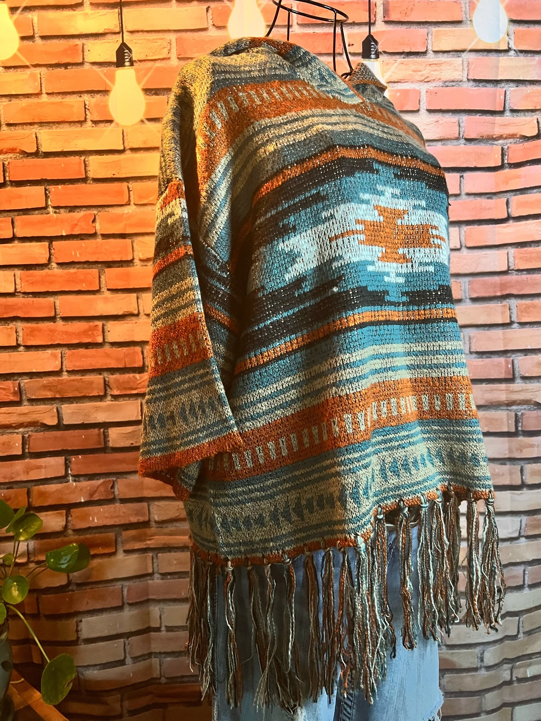 Heavy knit with that rustic turquoise, rust, and sand stripe pattern — finished with long fringe for maximum road-trip drama.