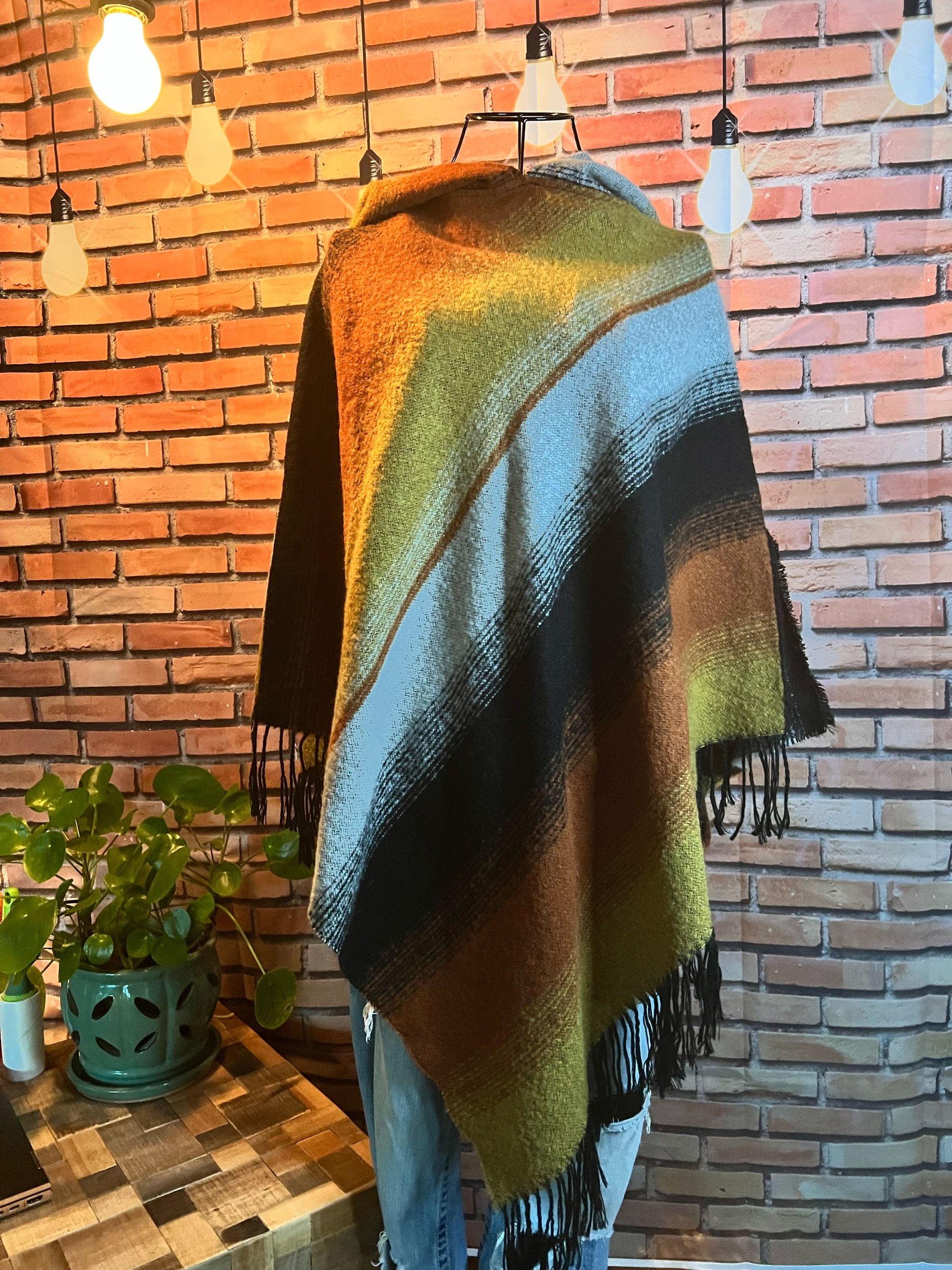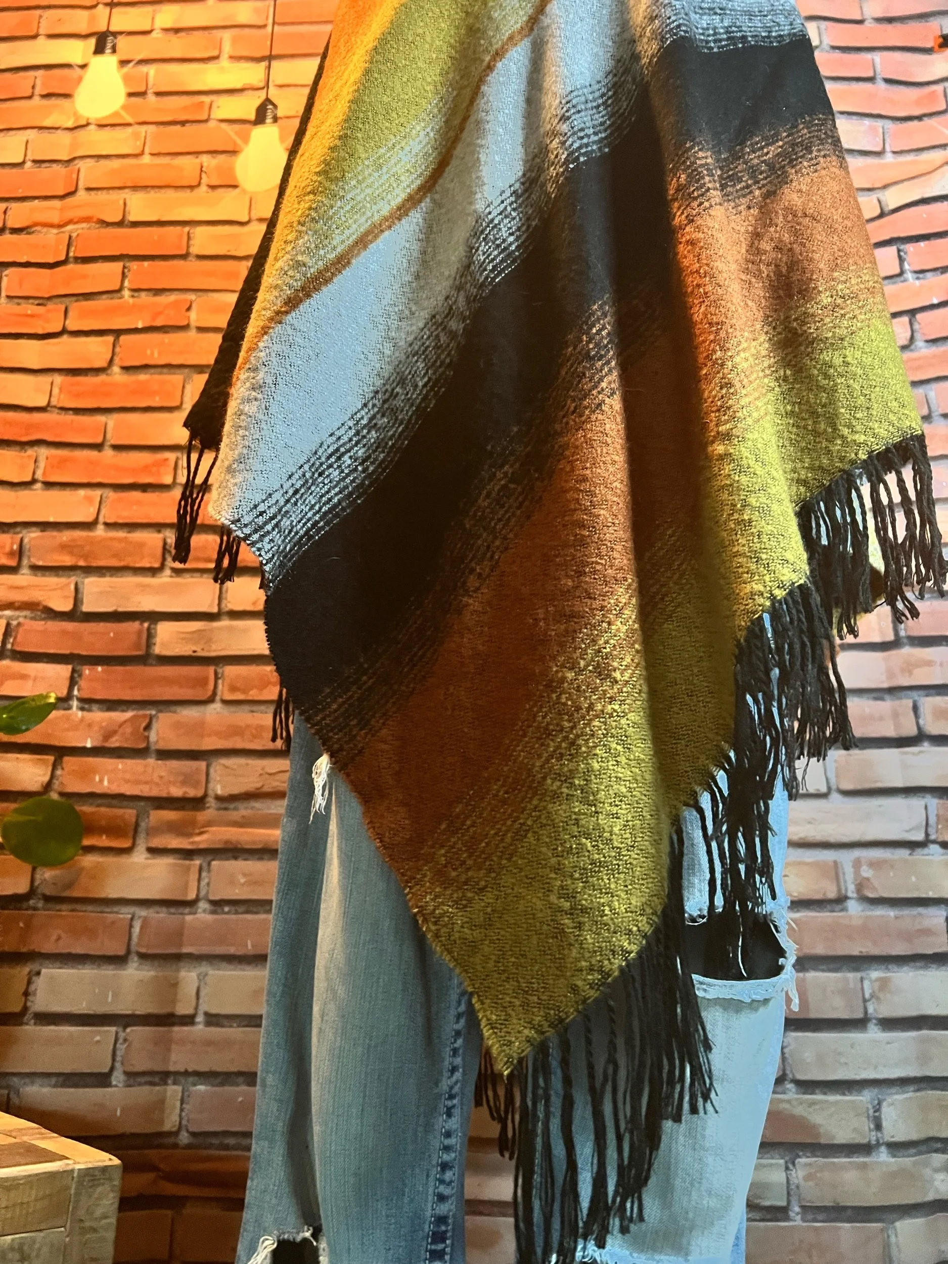 Lightweight but loud. Burnt amber, moss, charcoal, and wheat tones in wide woven stripes that look like someone turned autumn into fabric.