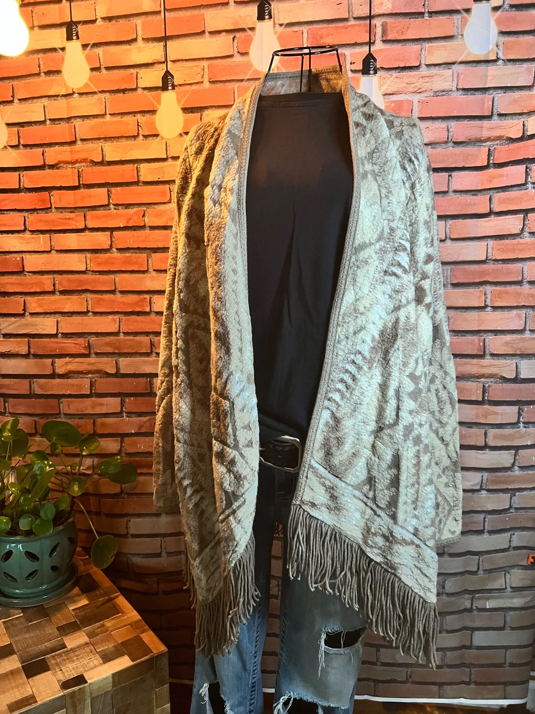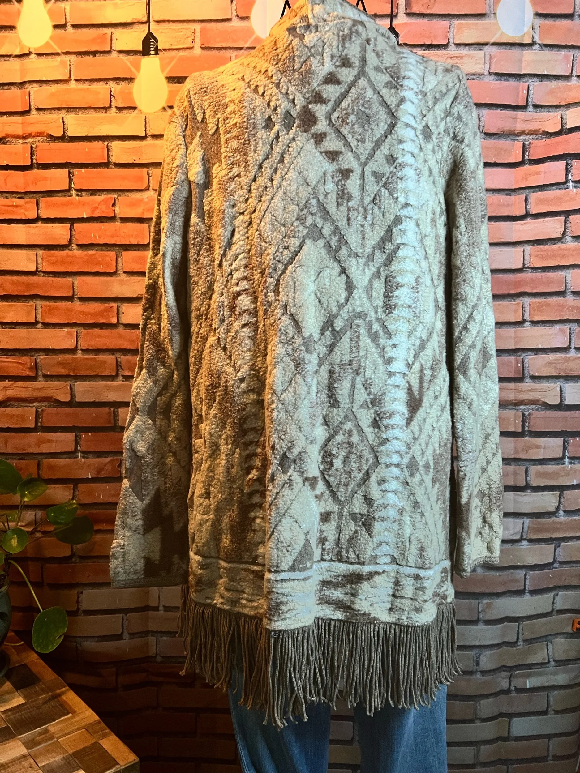 Features: Open front, long fringe hem, relaxed drape, western-boho pattern