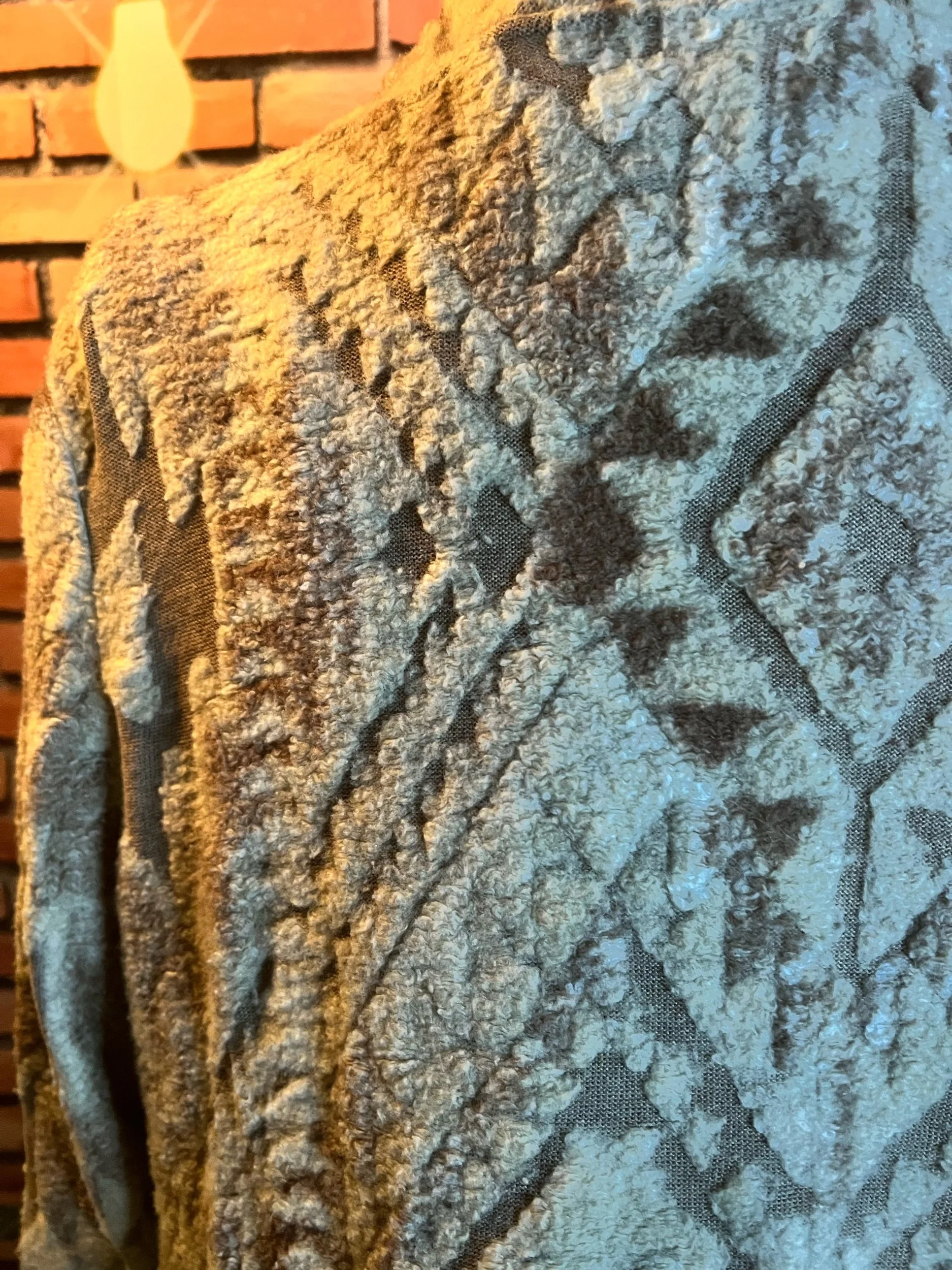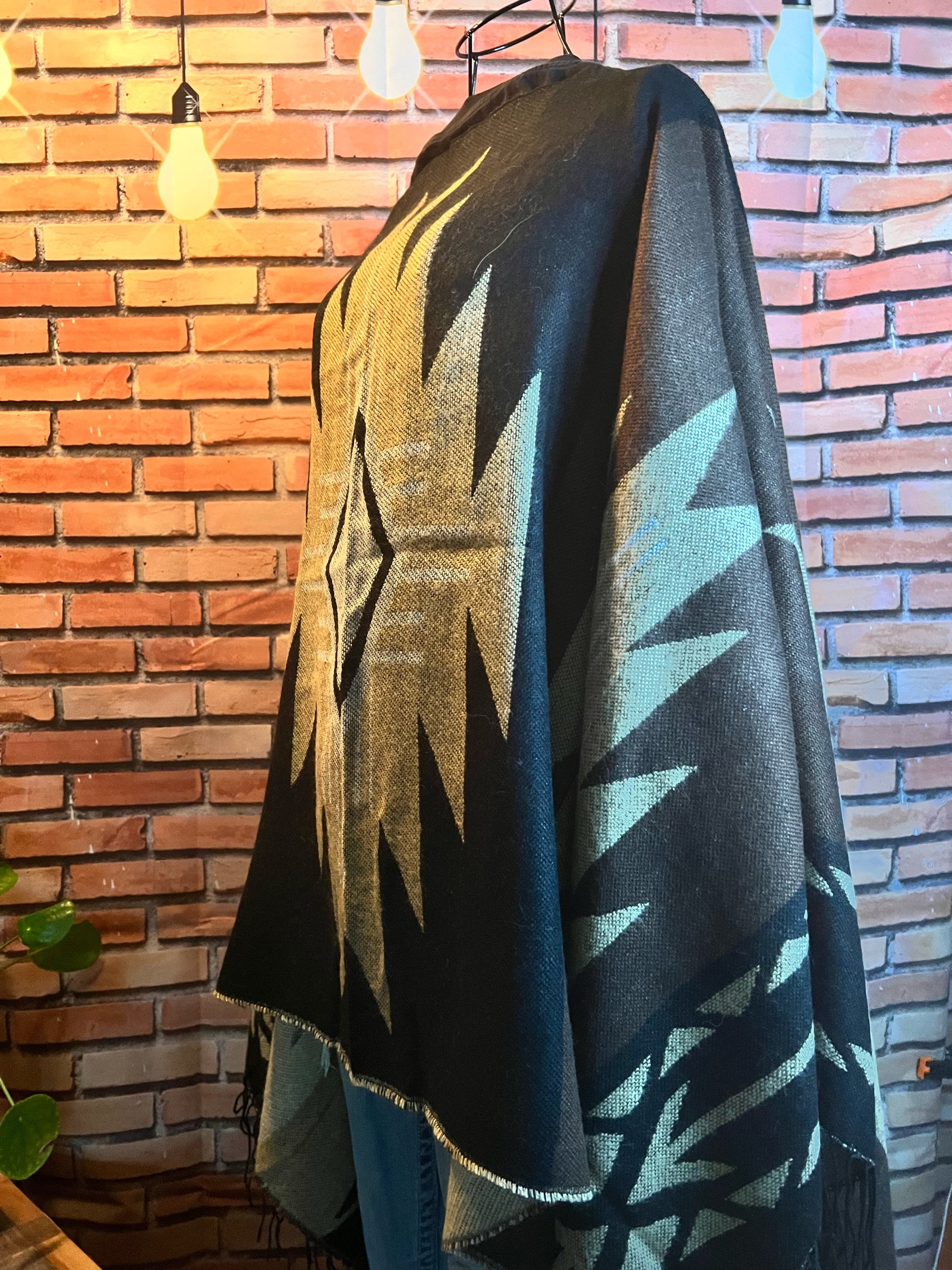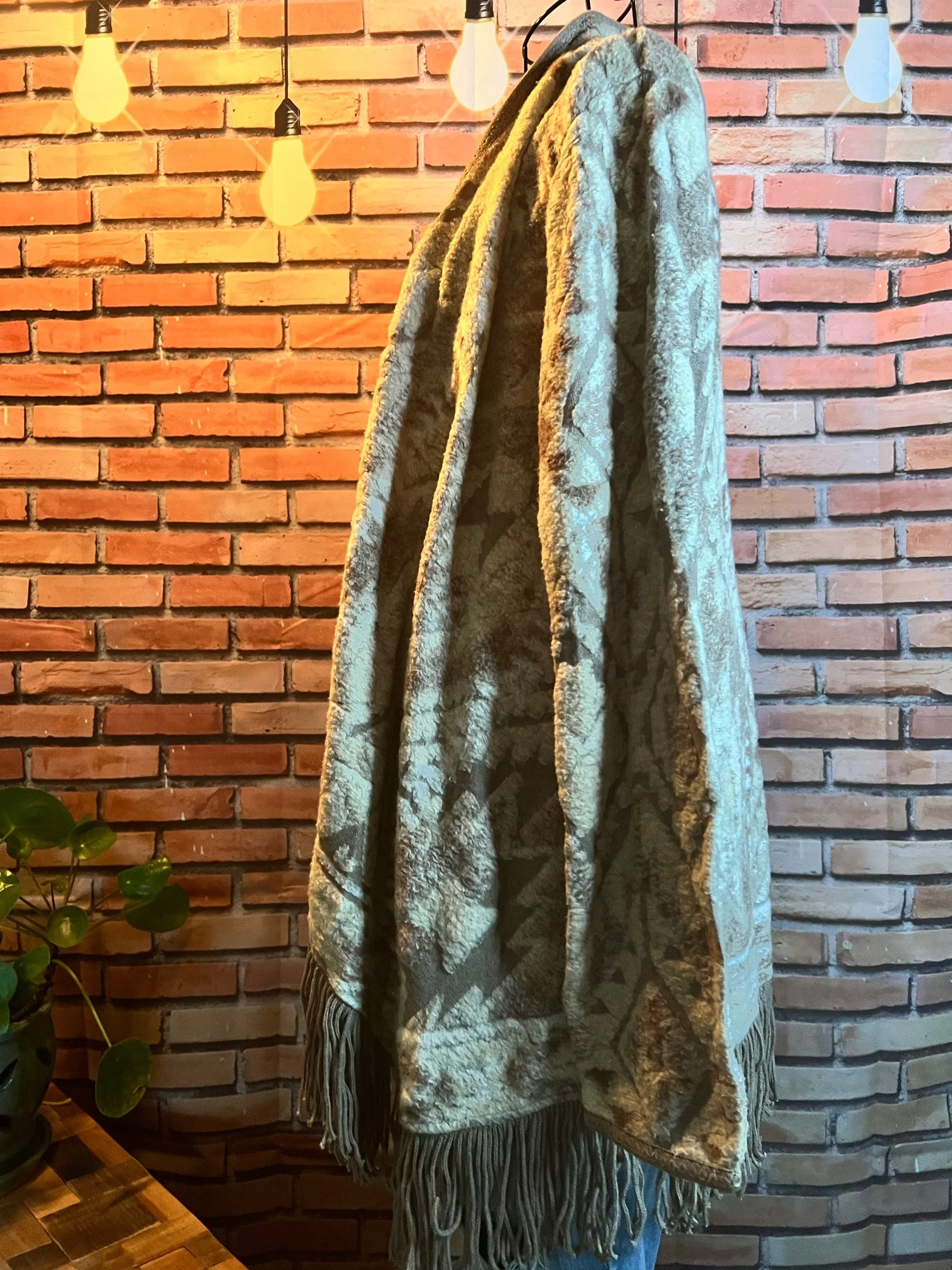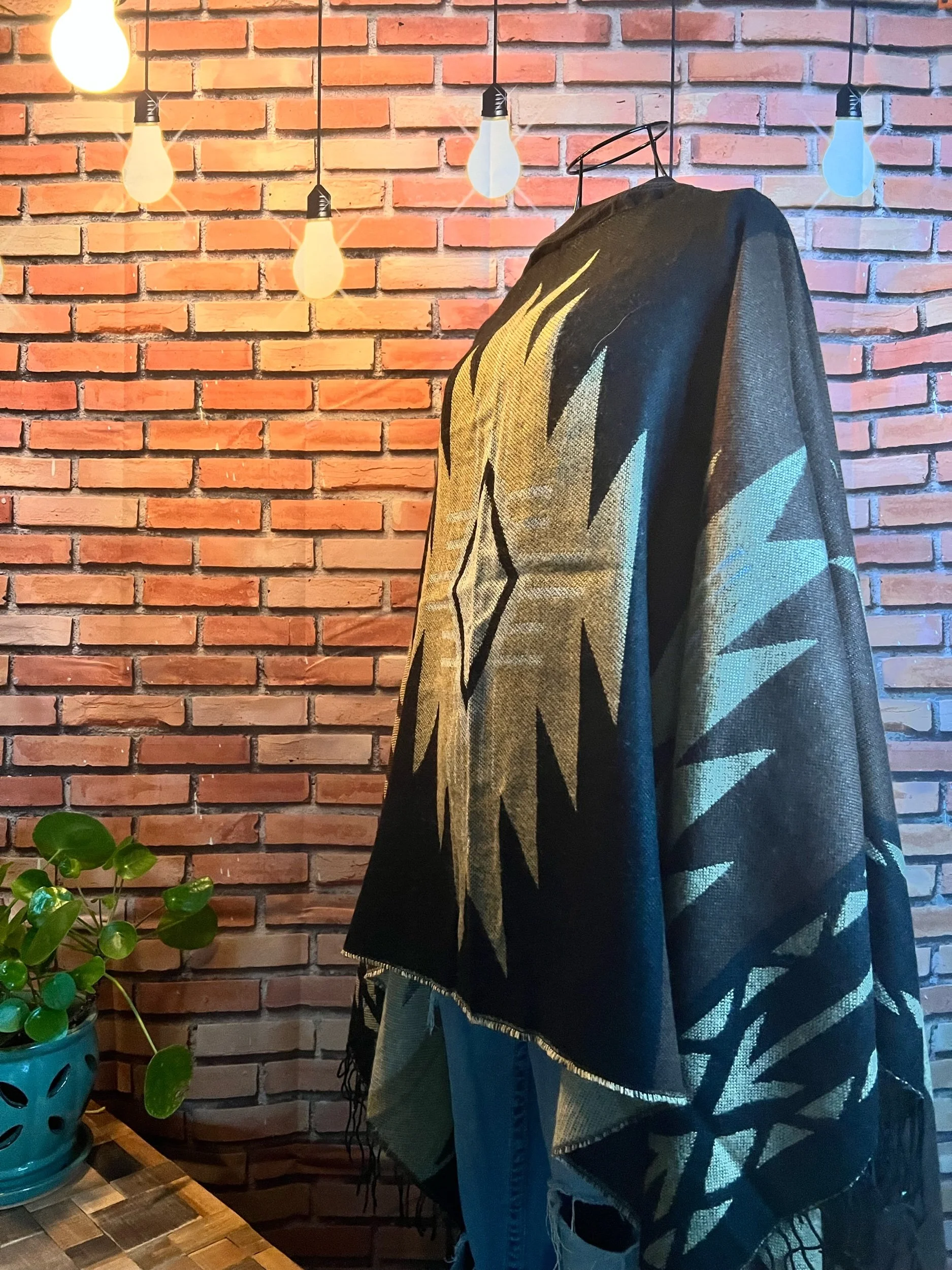 This heavyweight drape shawl serves rugged desert energy with soft-luxury comfort — think road-trip poet who stole her ex’s blanket and never gave it back. Chunky textured weave, earth-toned geometry, and a fringe hem made for wind-catching exits.