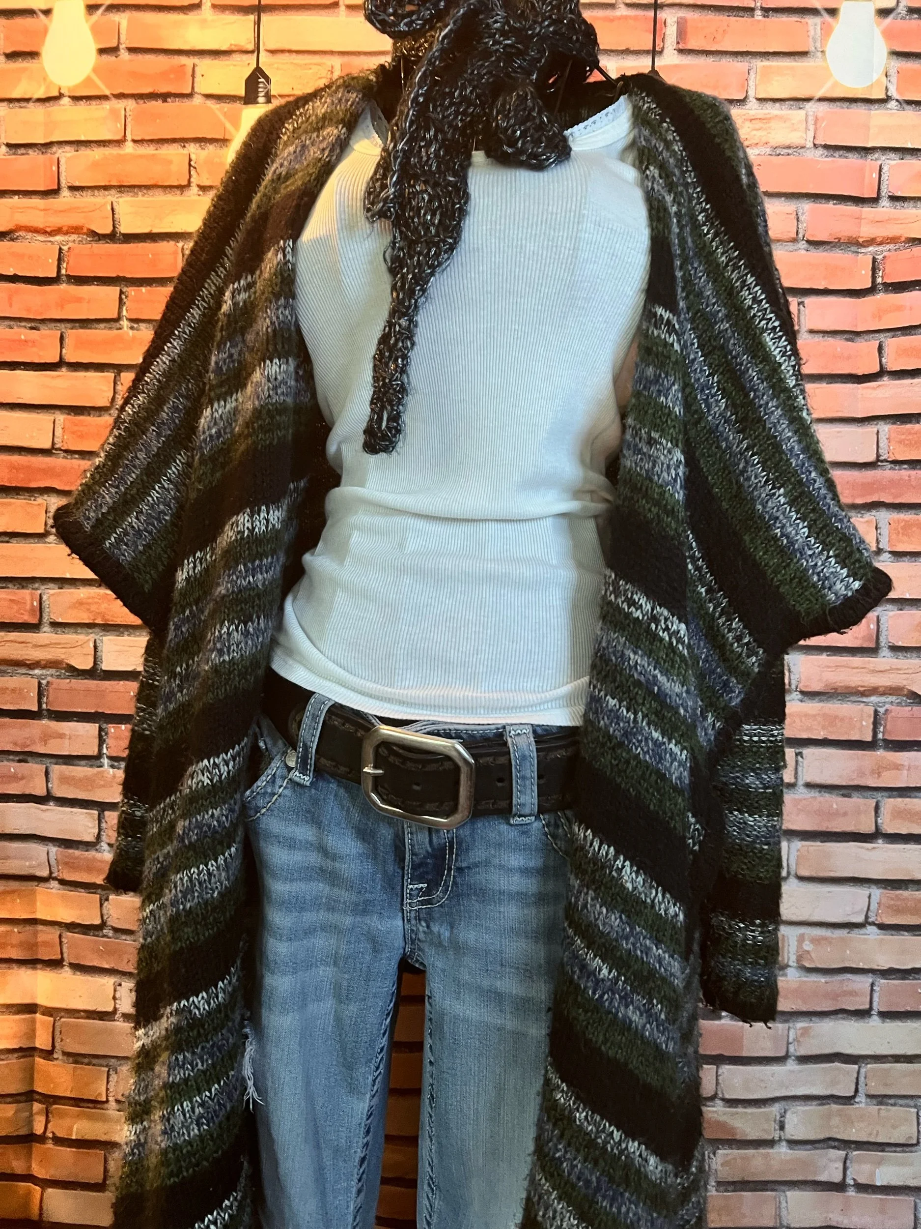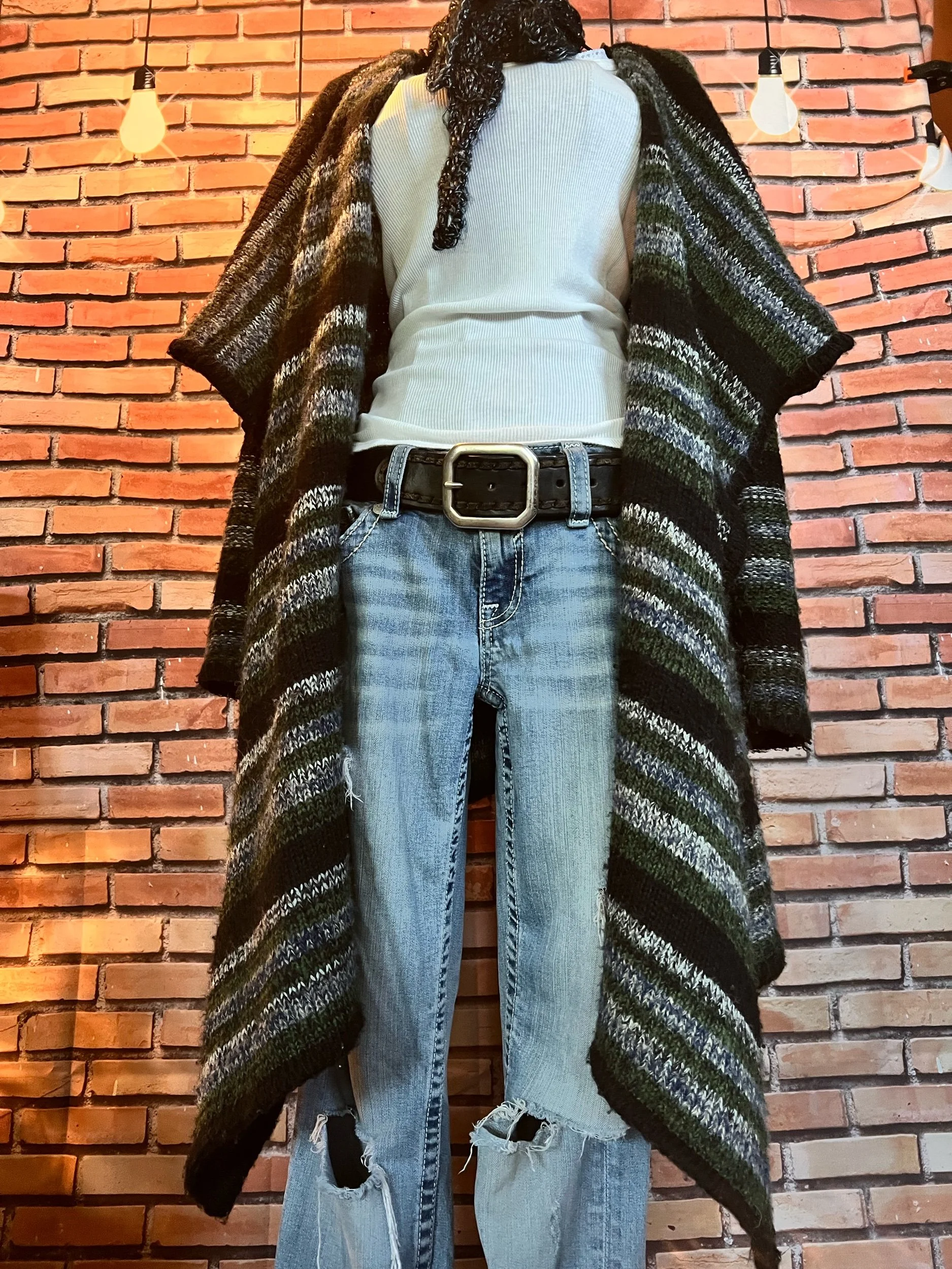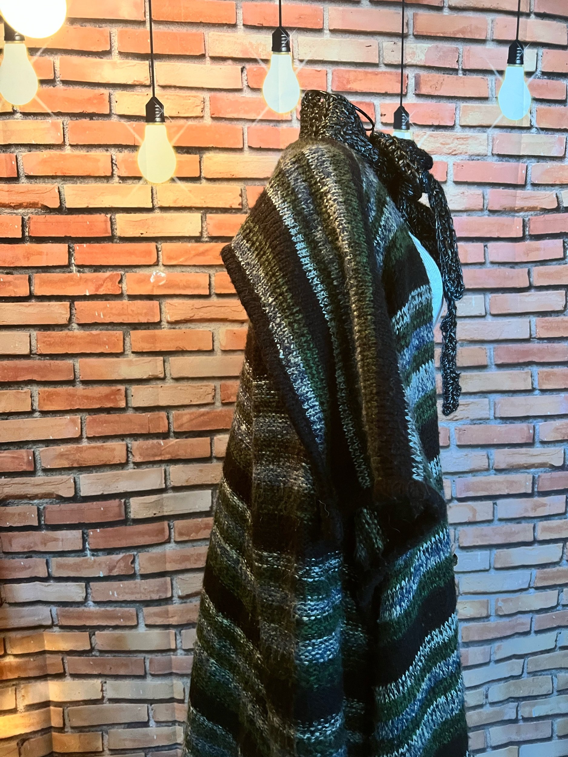 Grunge meets forest fairy. Cozy stripes in black, green, gray, and smoke blue that hang just right when you walk away from drama. Looks innocent until you pair it with ripped jeans and a bad attitude.