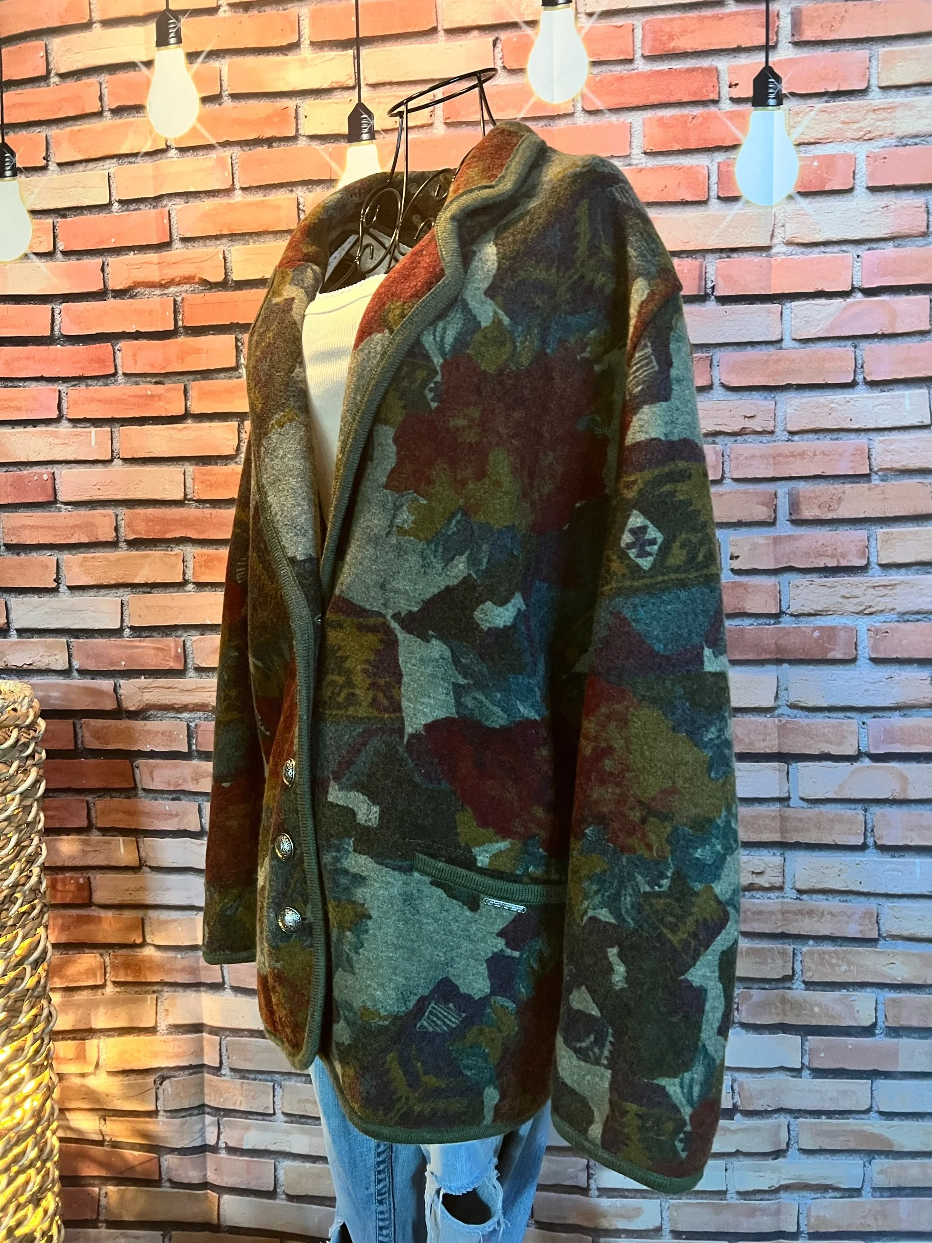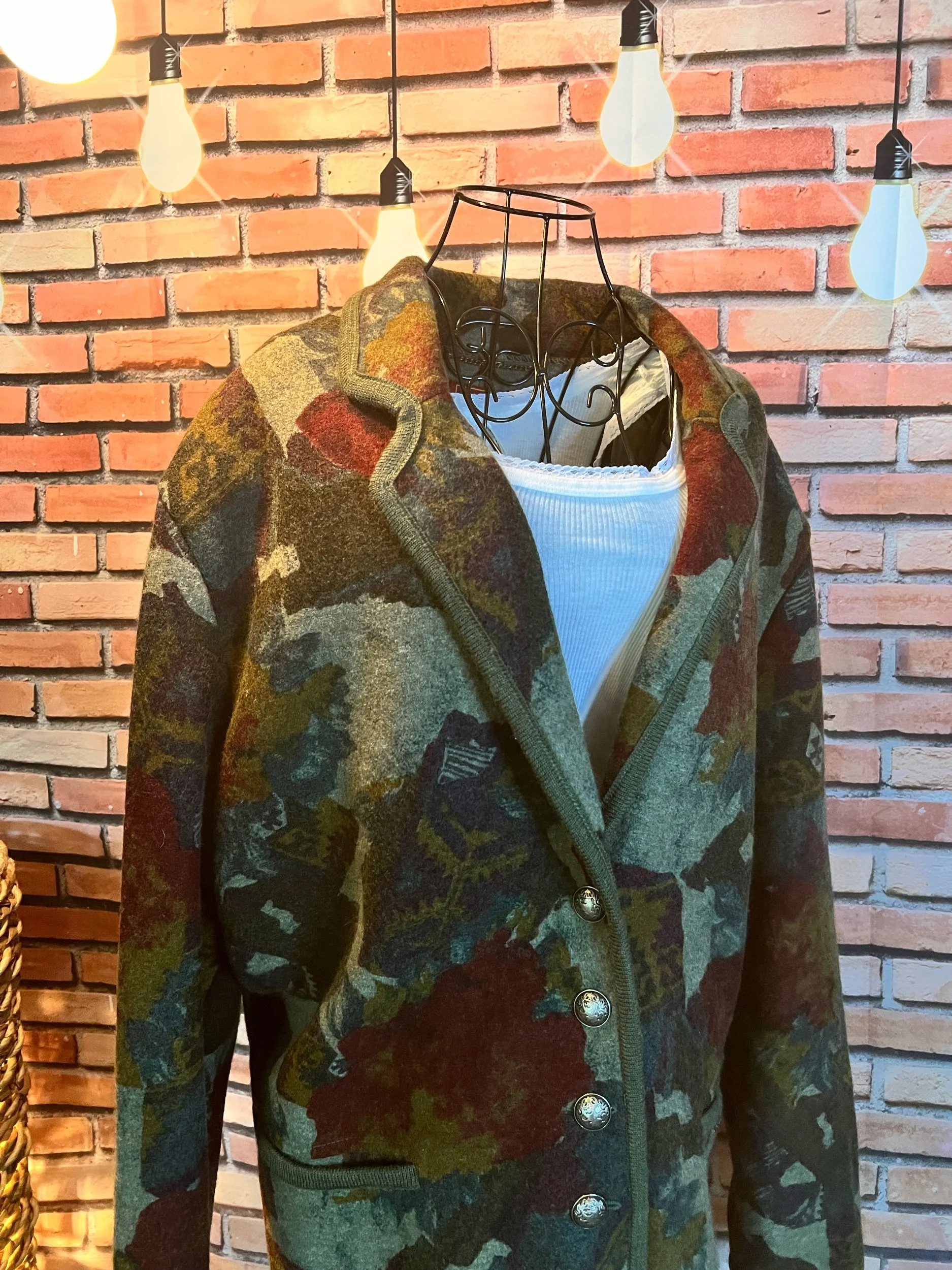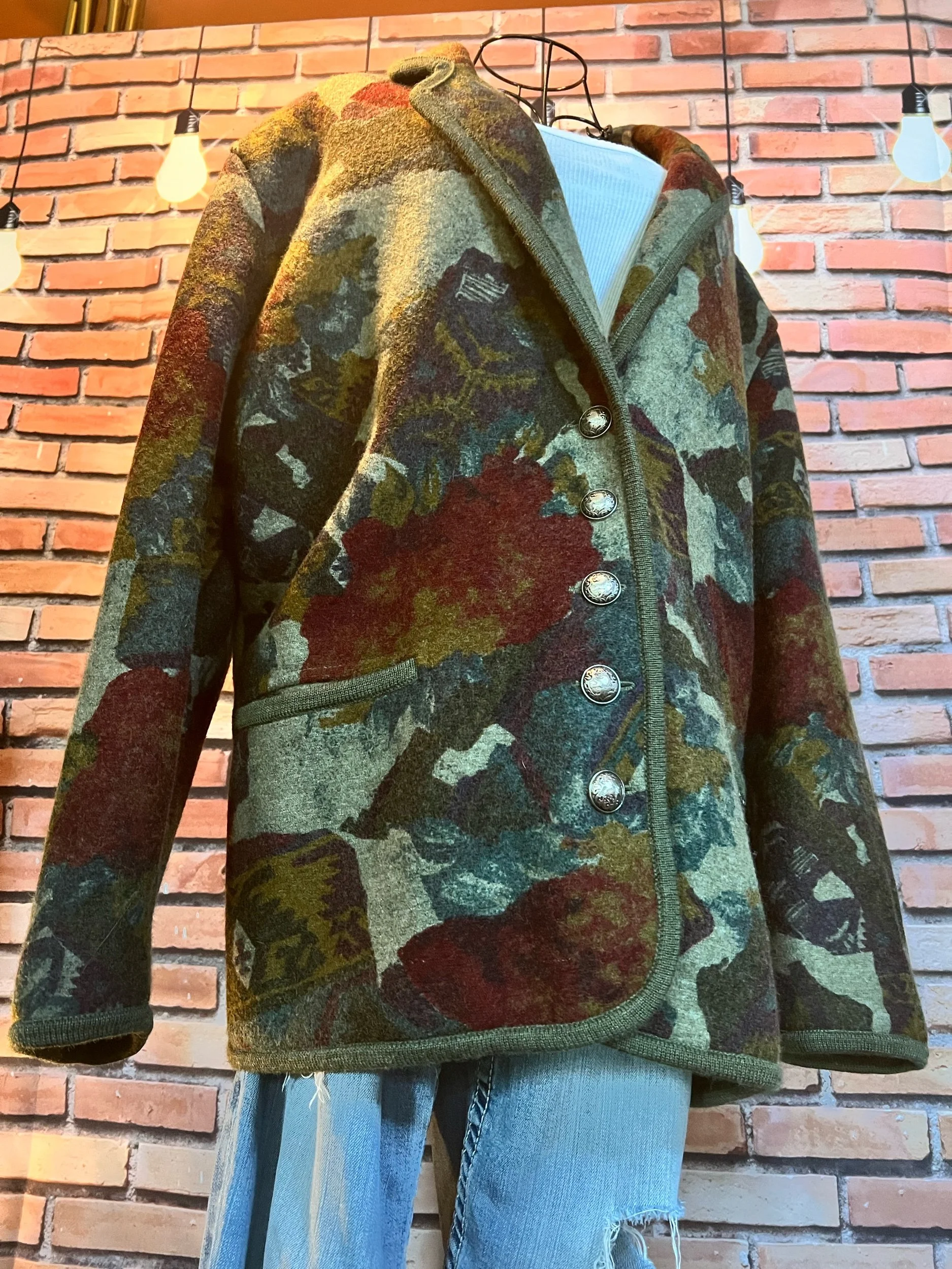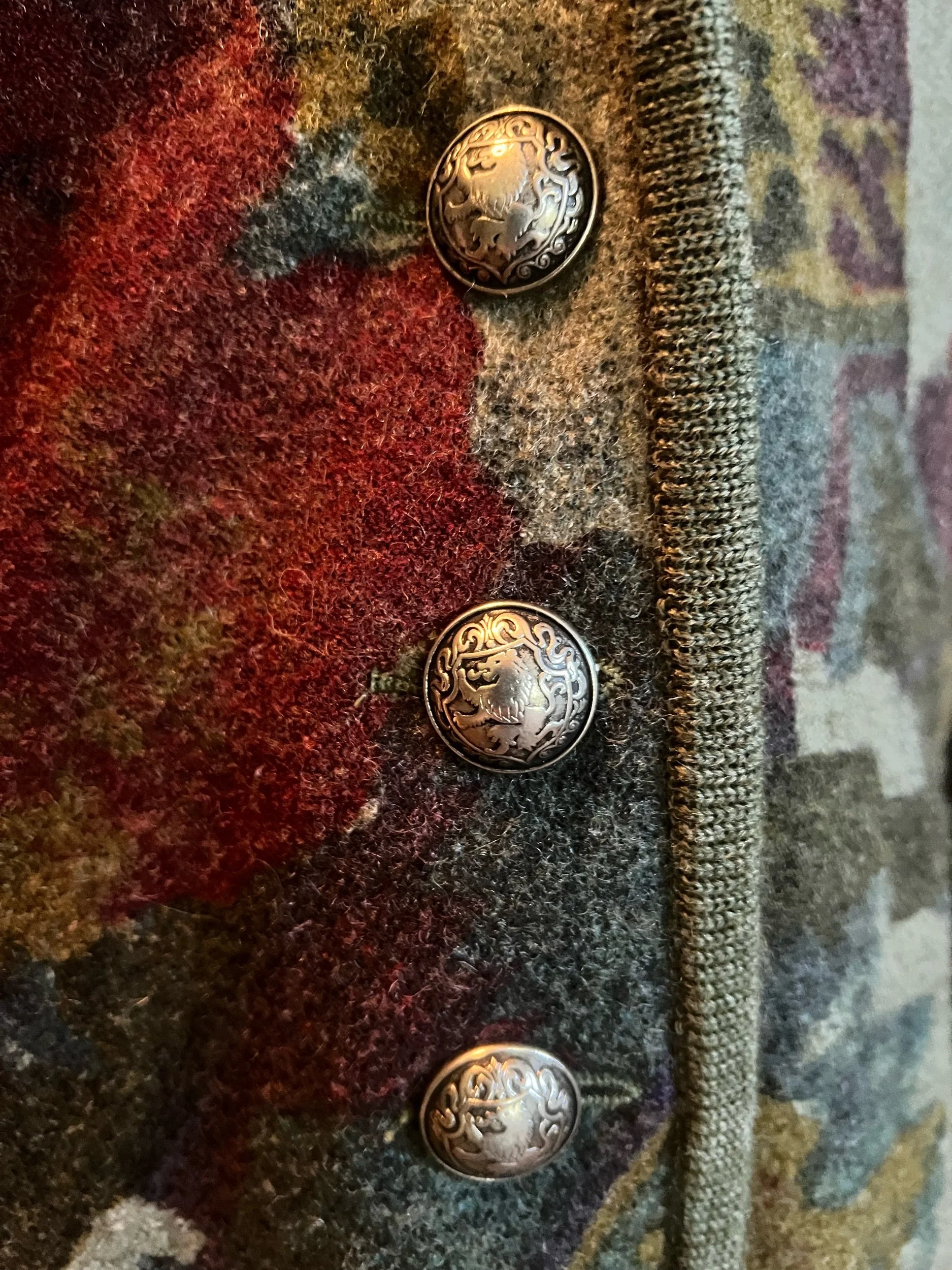 This Austrian-made Geiger jacket is what happens when alpine heritage gets a dark academia upgrade. Heavy boiled wool with a rich tapestry of moss, wine, and forest hues. Silver crest buttons and classic tailoring make it the kind of coat you “accidentally” wear indoors because it feels that good.
