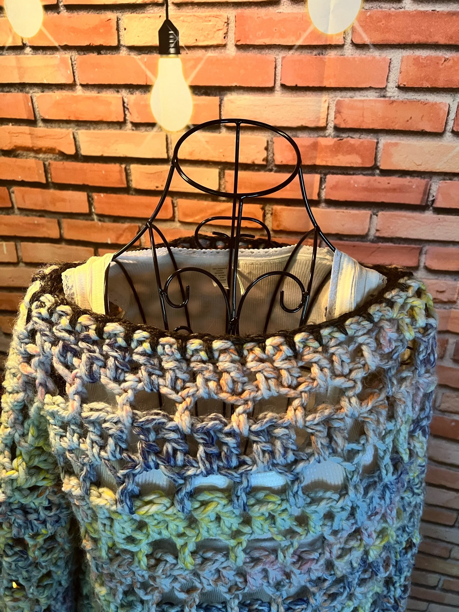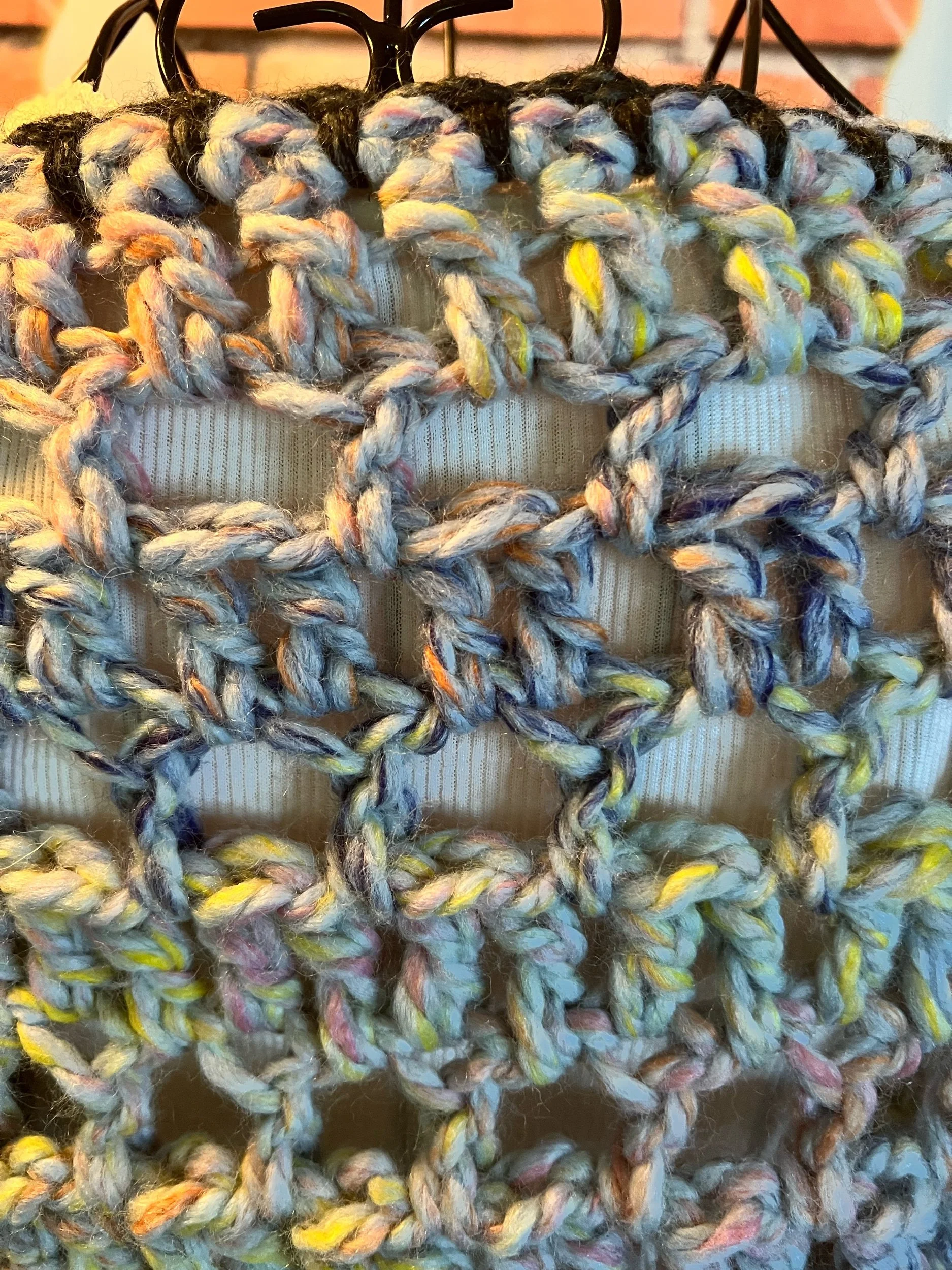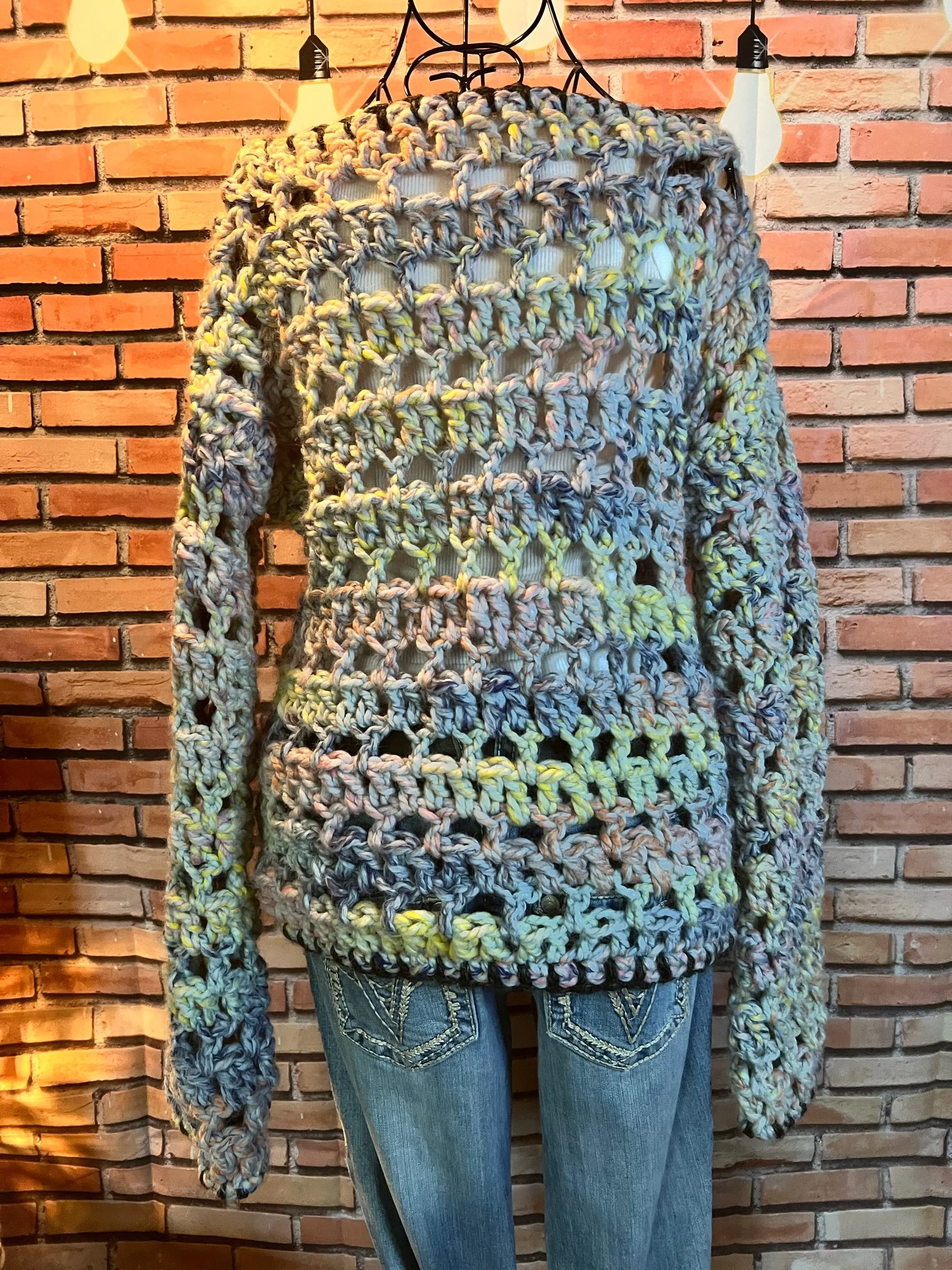 Two inches thick and impossible to ignore. This handmade crochet sweater is built from heavyweight, multi-tone yarn — soft pastels shot through with hints of charcoal and navy. Open-weave texture keeps it breathable, the weight keeps it grounded. Every stitch says “not factory made.”